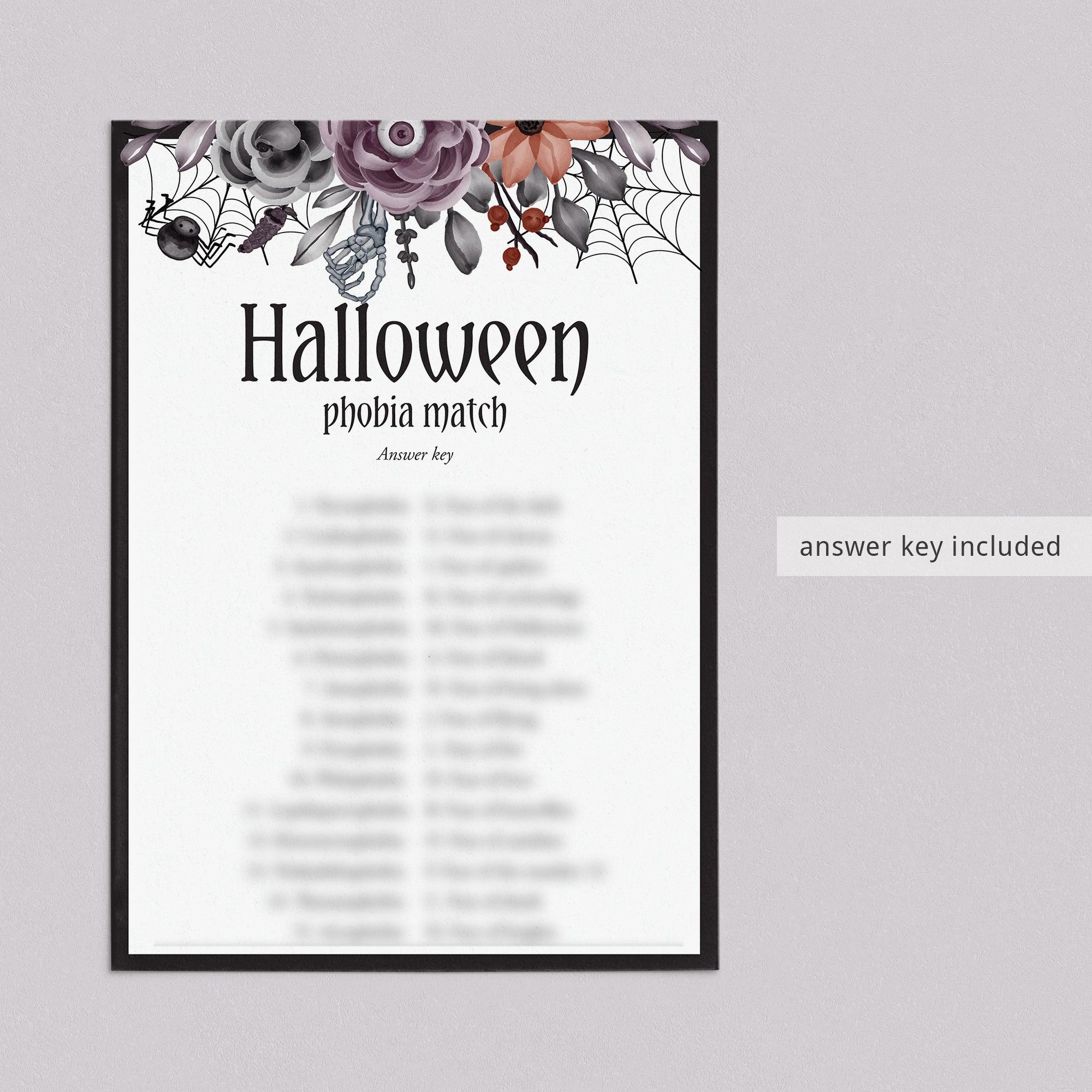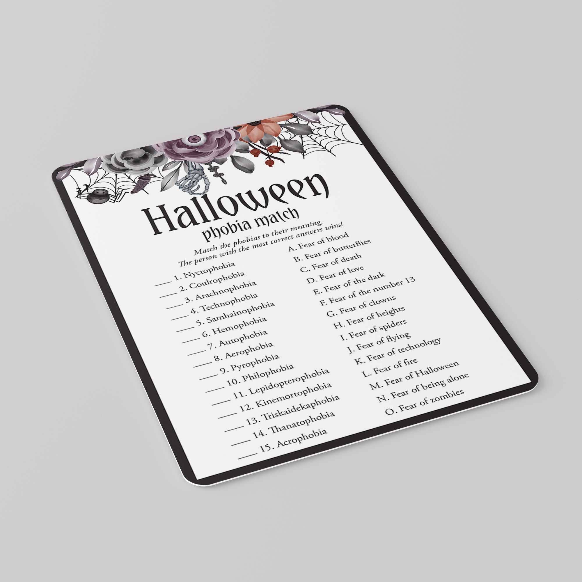 Are you looking for a unique game to play at your Halloween party? Play Phobia Match with this creepy floral Halloween game card. The game will be the perfect addition to your ladies Halloween night.