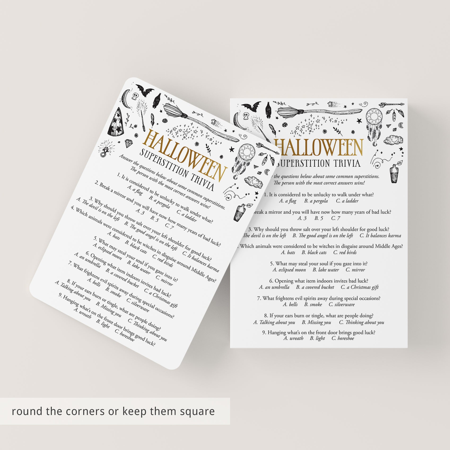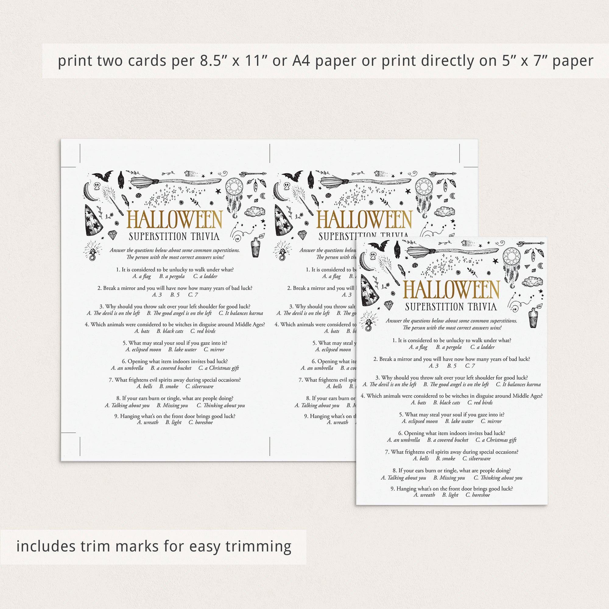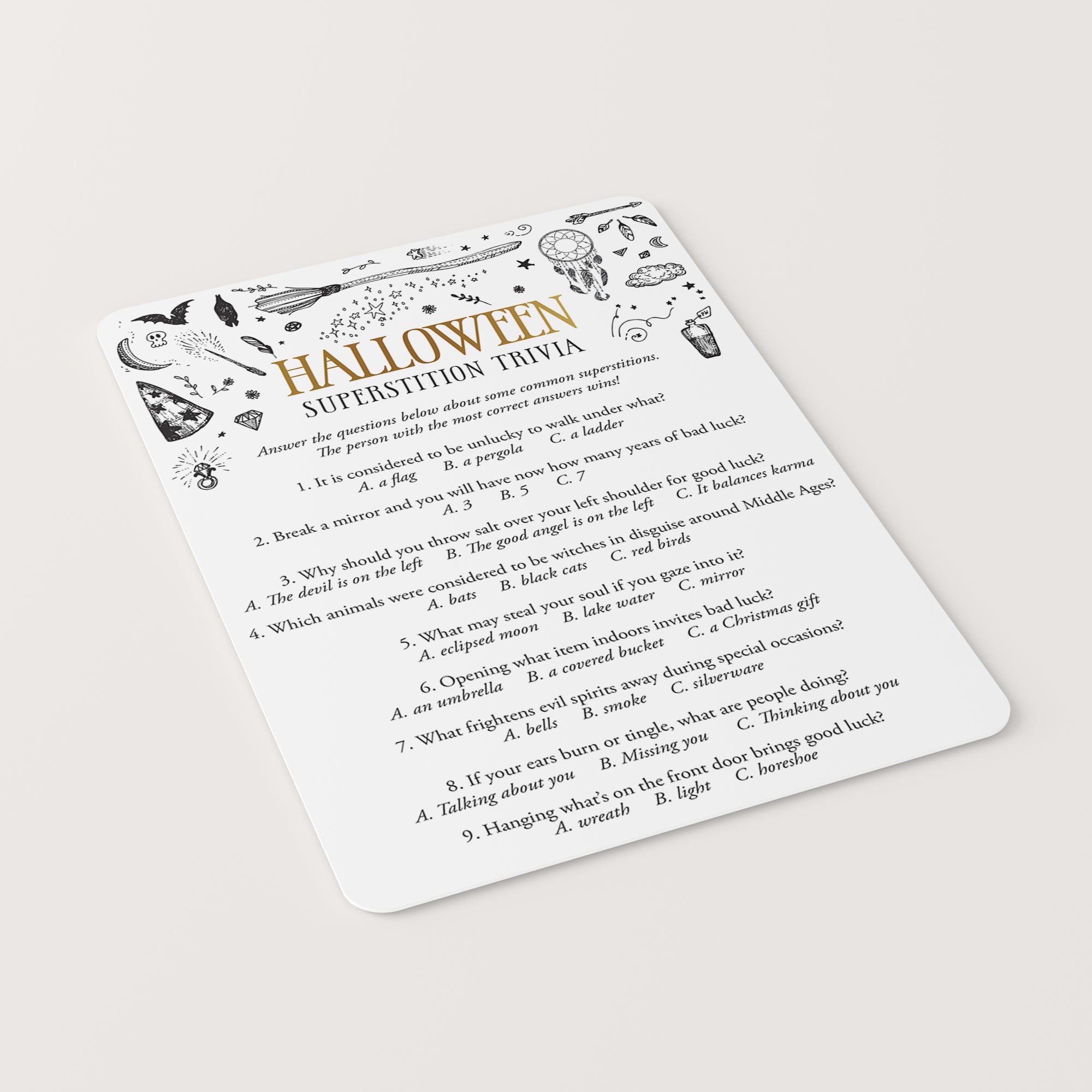 This printable Superstition Trivia game is an instant download. After purchase you will receive a download link immediately on screen. Also within minutes of your order and payment, an e-mail will be sent to you with a link for your download.