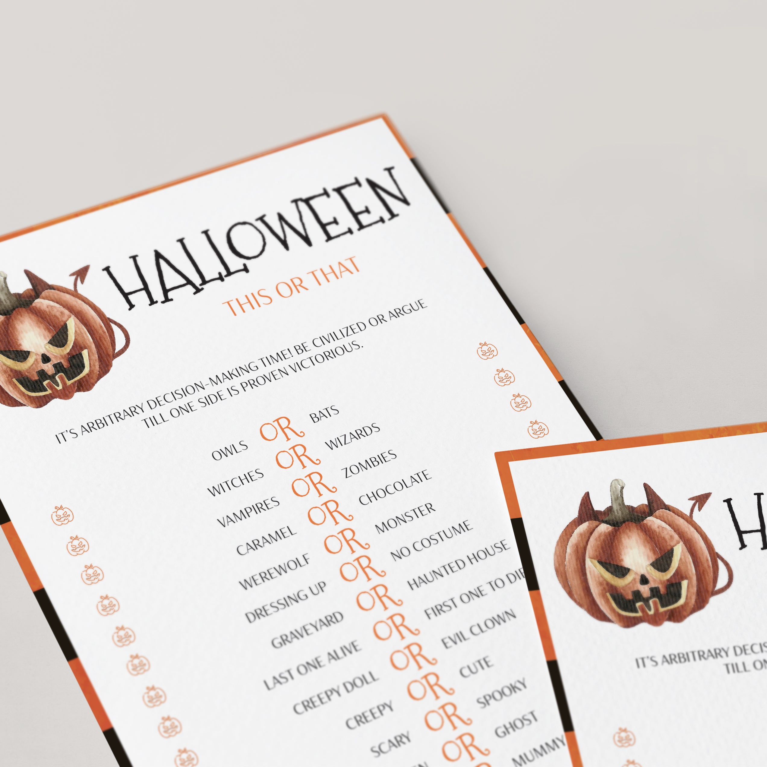 Are you looking for a fun icebreaker game for your Halloween game night? Play This or That. It's is a great conversation starter and will definitely get your guests mingling and laughing. This creepy Halloween This or That game with evil pumpkin has 14 Would You Rather questions. Have your guests pick their preferences and defend their choice. Would you rather be the last one alive or the first one to die...?