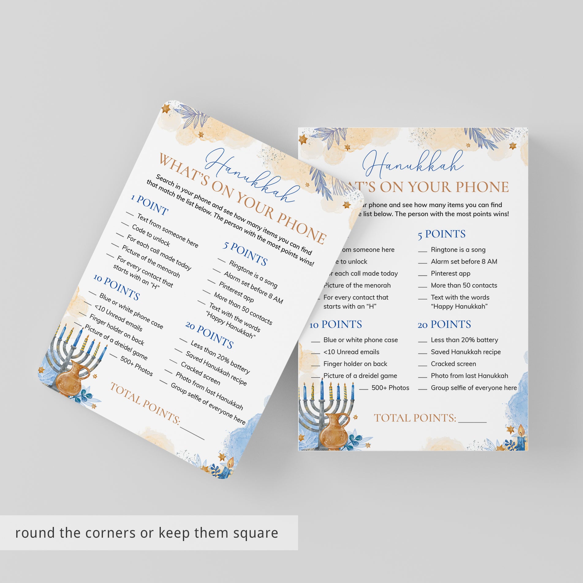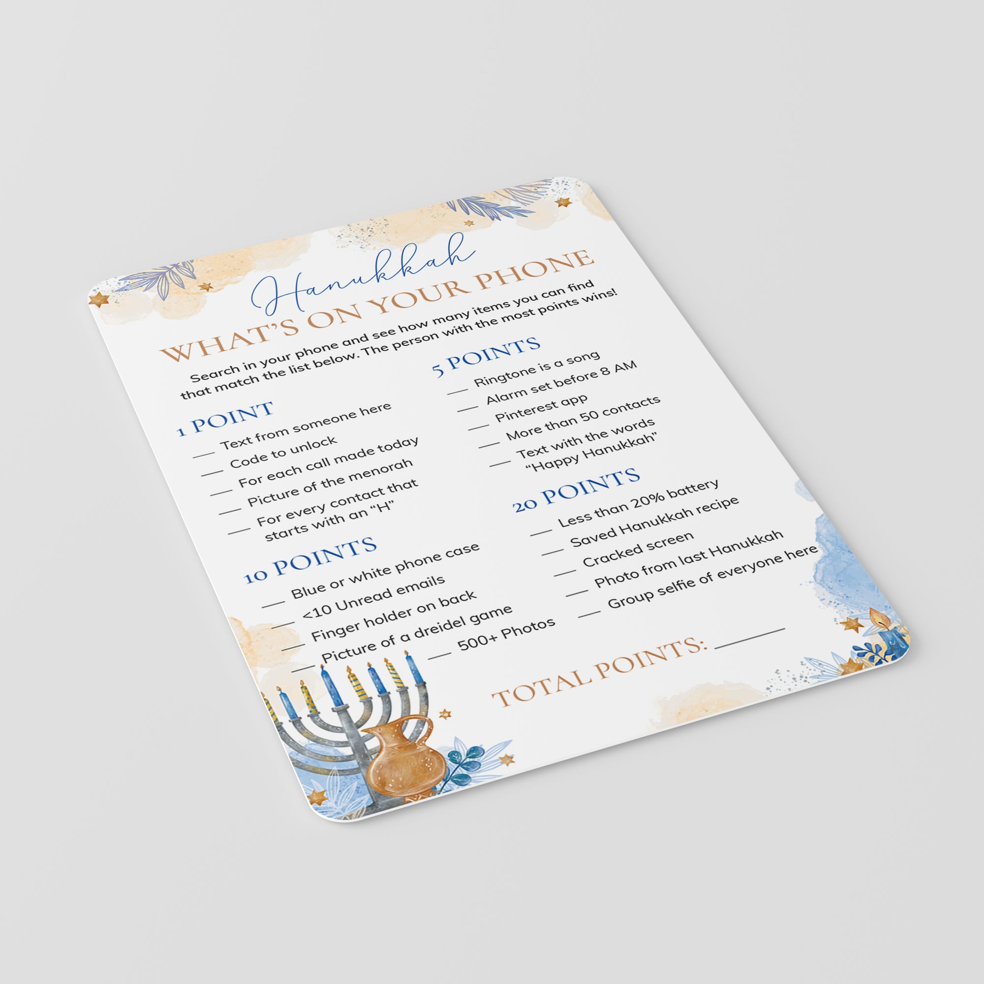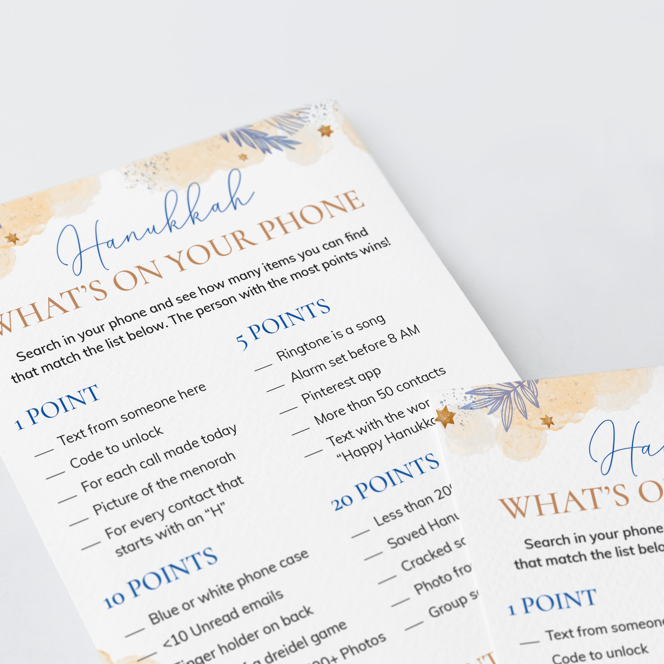 Are you looking for a fun ice breaker game for your Hanukkah party? Play What's On Your Phone with these gorgeous watercolor game cards. The game is super easy to prepare for and simple to play.