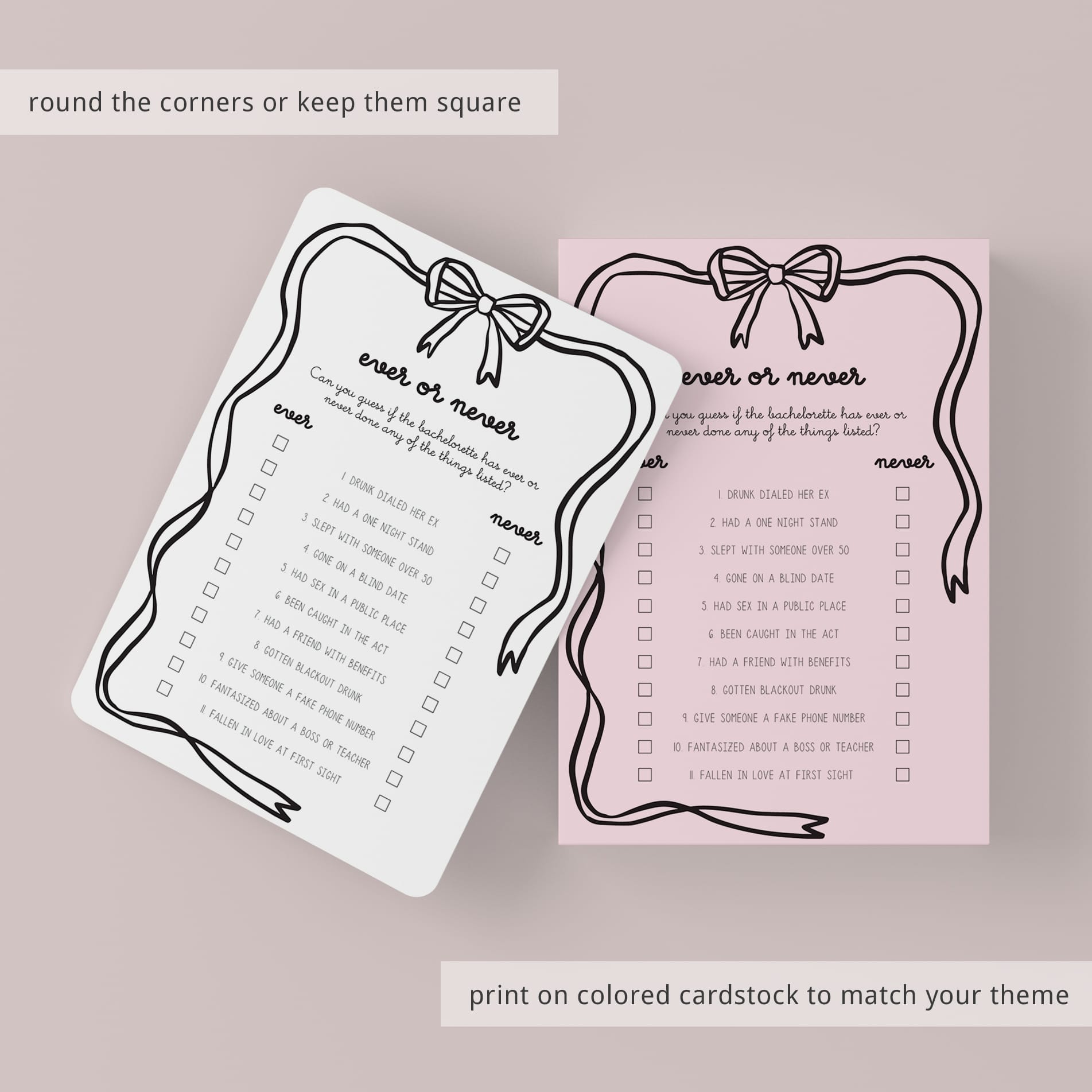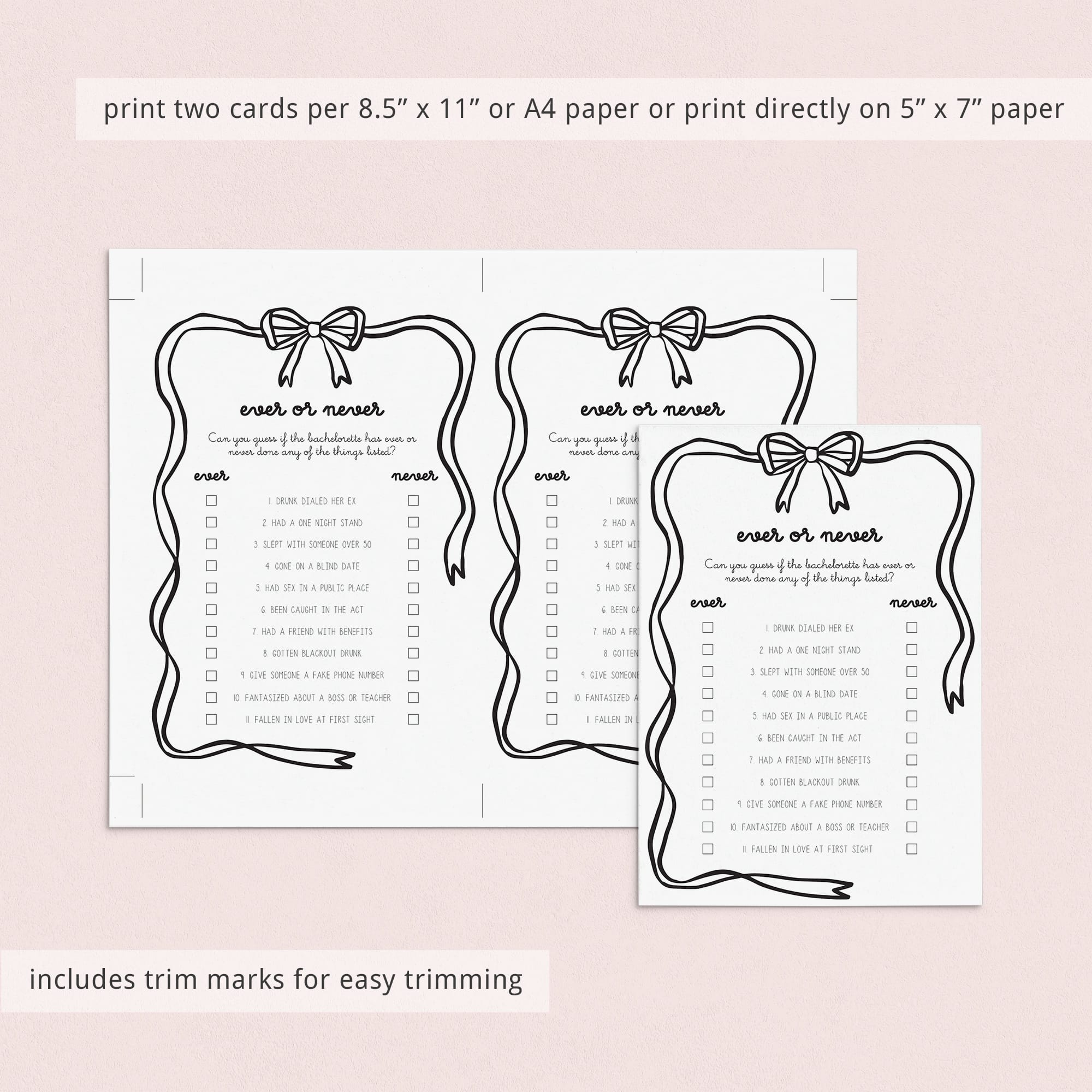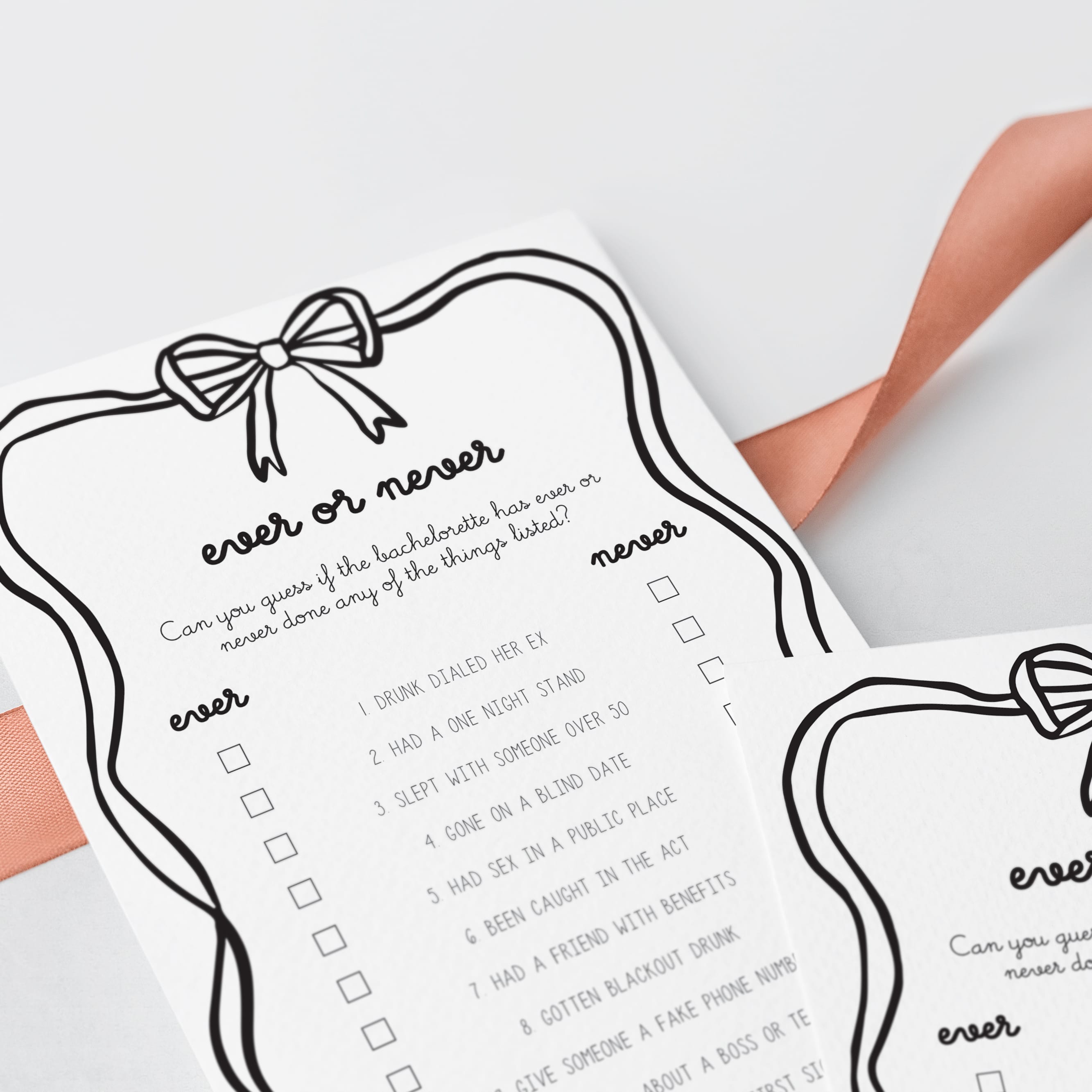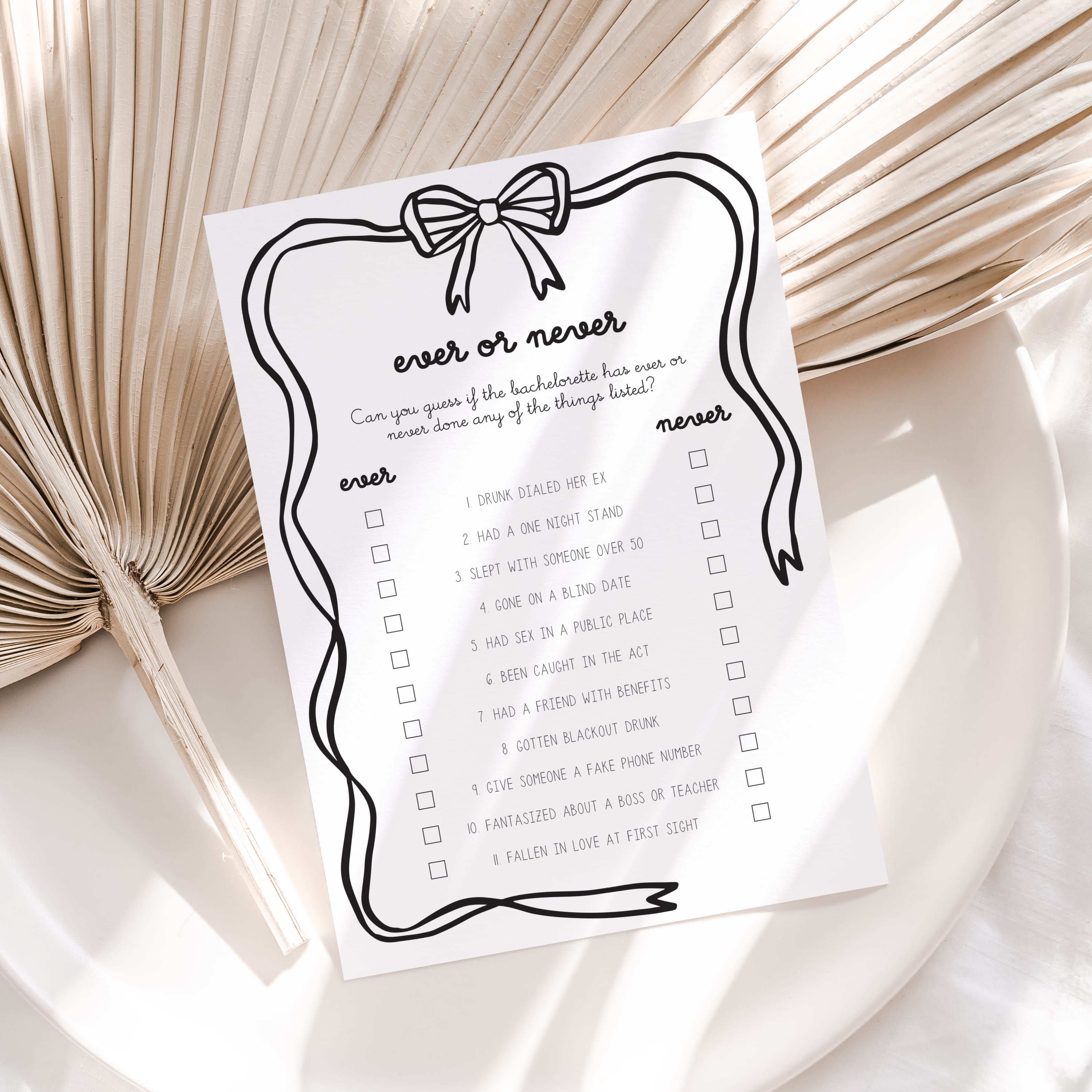 Have the bachelorette fill out this cute Ever or Never game card, featuring a playful wavy border topped with a sweet black bow, as an answer key before the party starts. Then compare her responses to what your girlfriends guessed. The player with the most correct wins bragging rights.