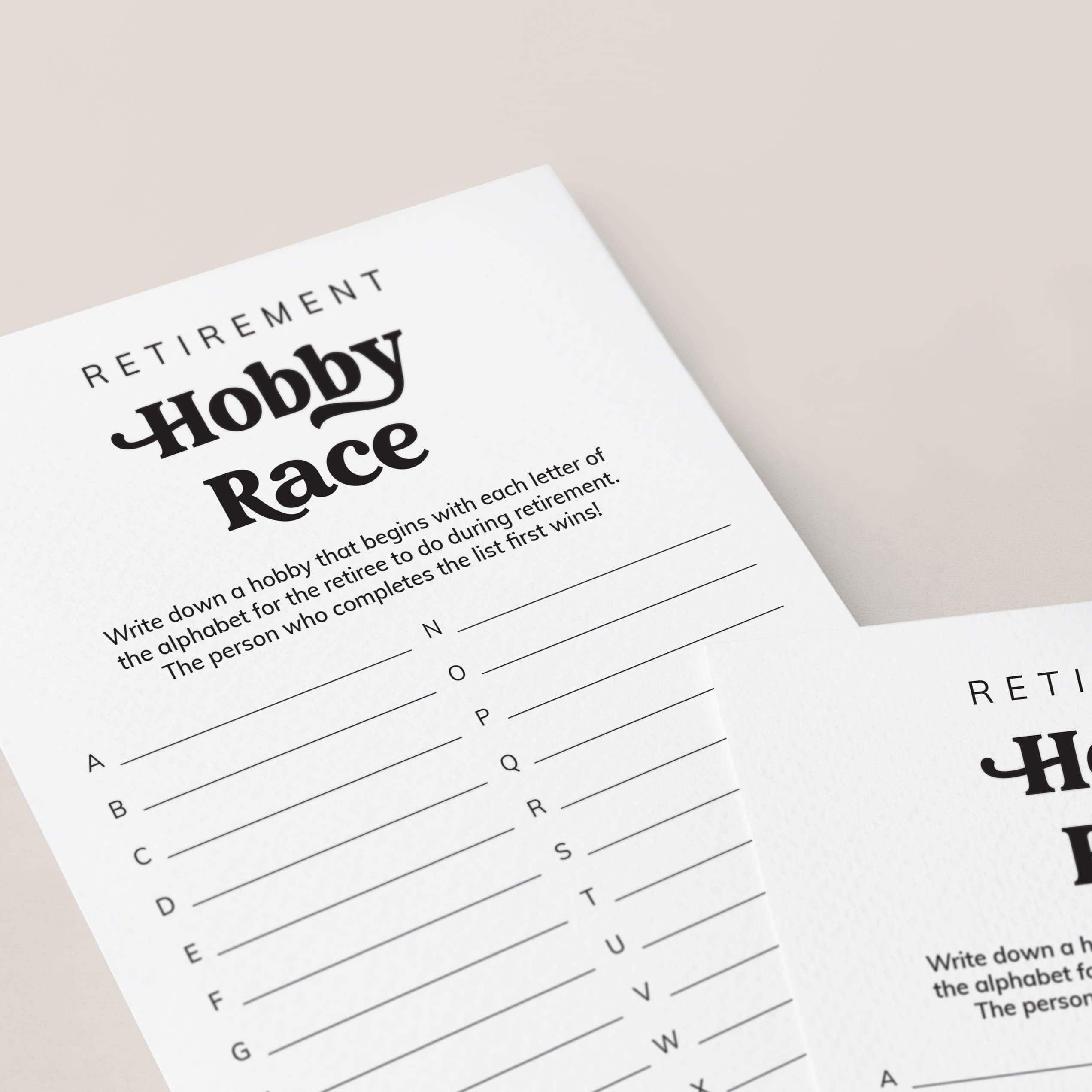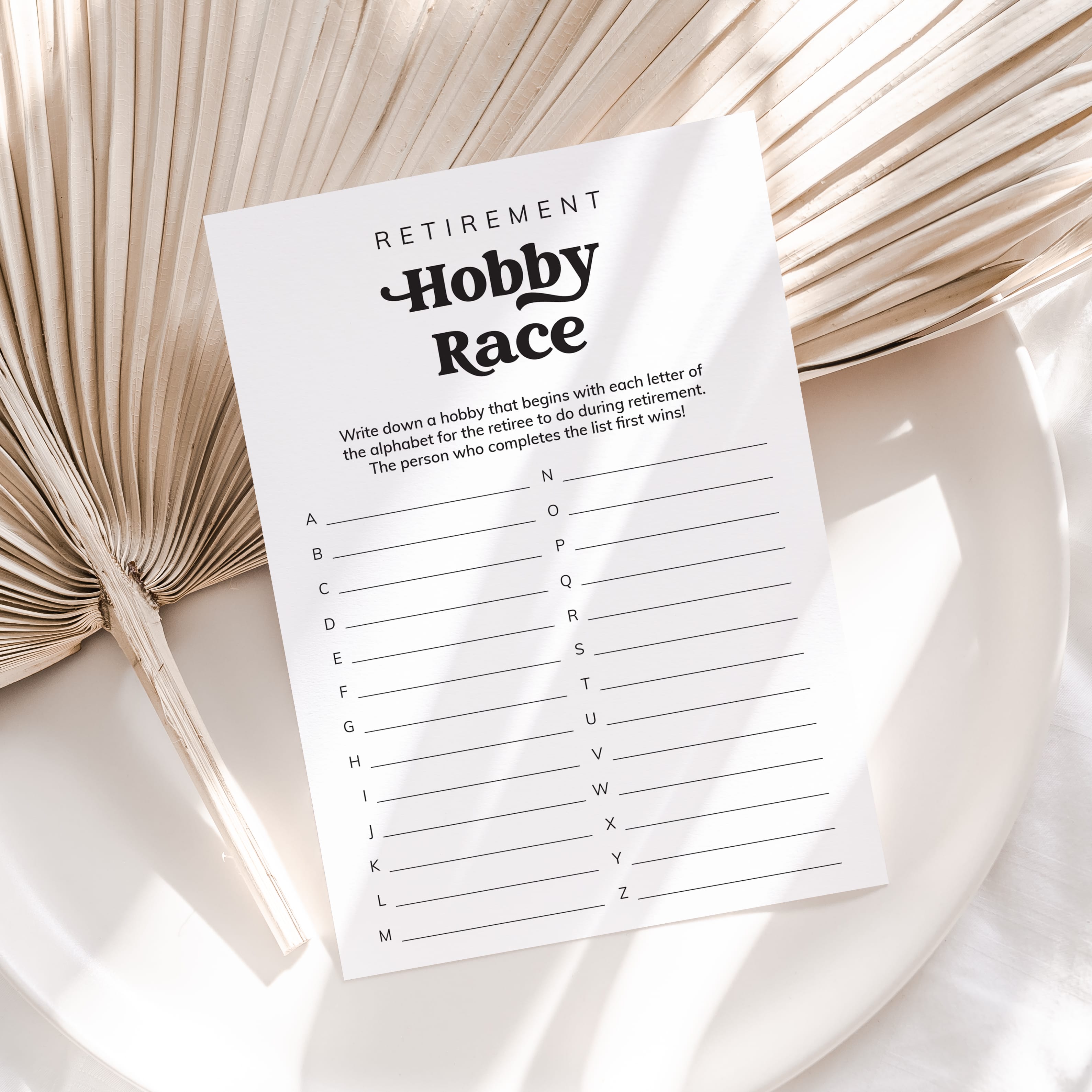 Are you looking for the perfect ice breaker for your retirement party? Play Retirement Hobby Race! This Retirement Hobbies A-Z Race game with a creative vintage script and black and white design is the perfect addition to any retirement party.