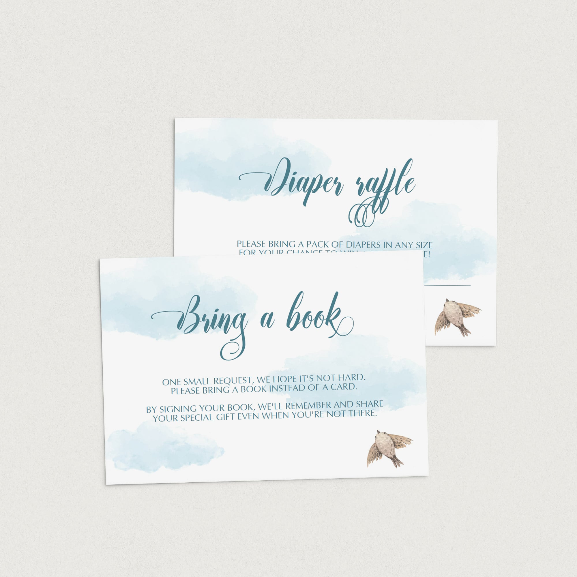 The set with watercolor clouds includes the Baby Shower Invitation, a Diaper Raffle ticket and a Book Request card.