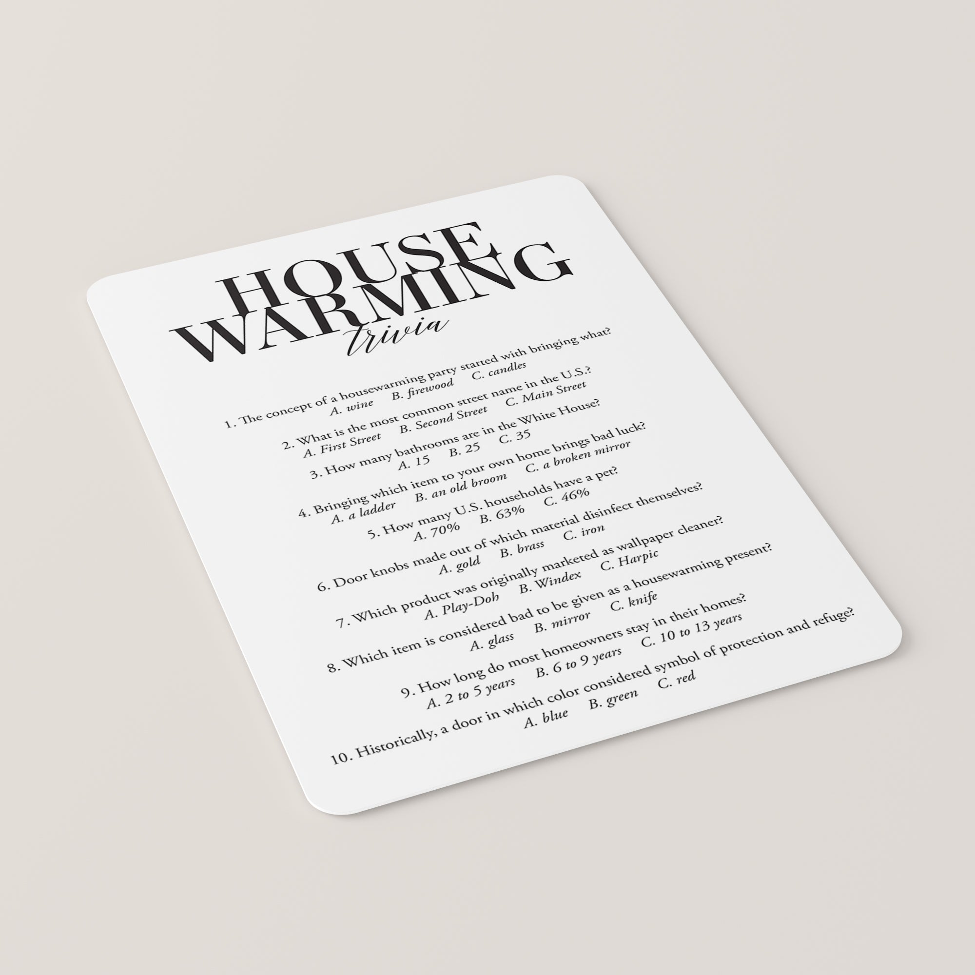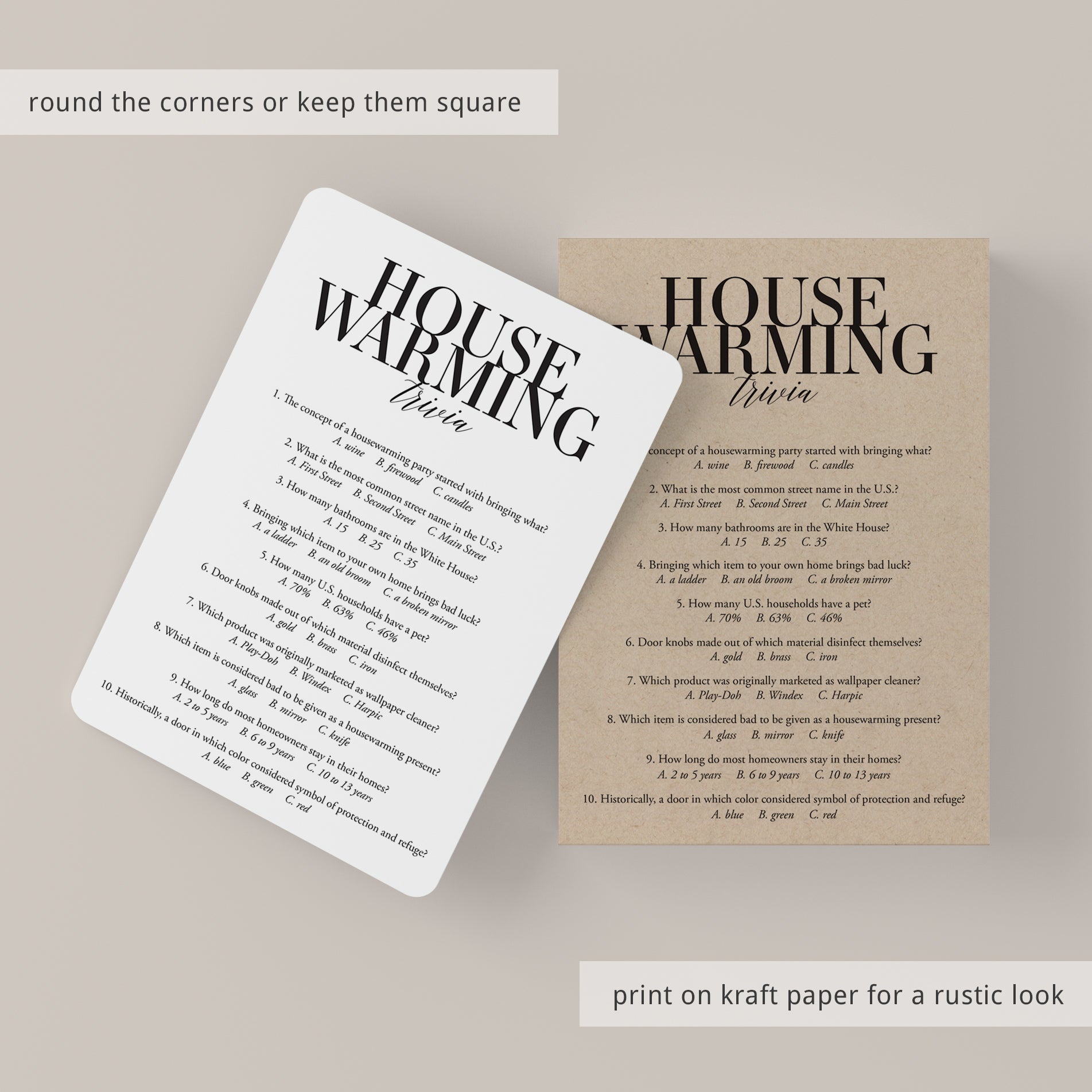 Are you hosting a Housewarming party? Test your guests knowledge with this fun house warming quiz. Just in case you are having trouble figuring out the answers, an answer key is included.