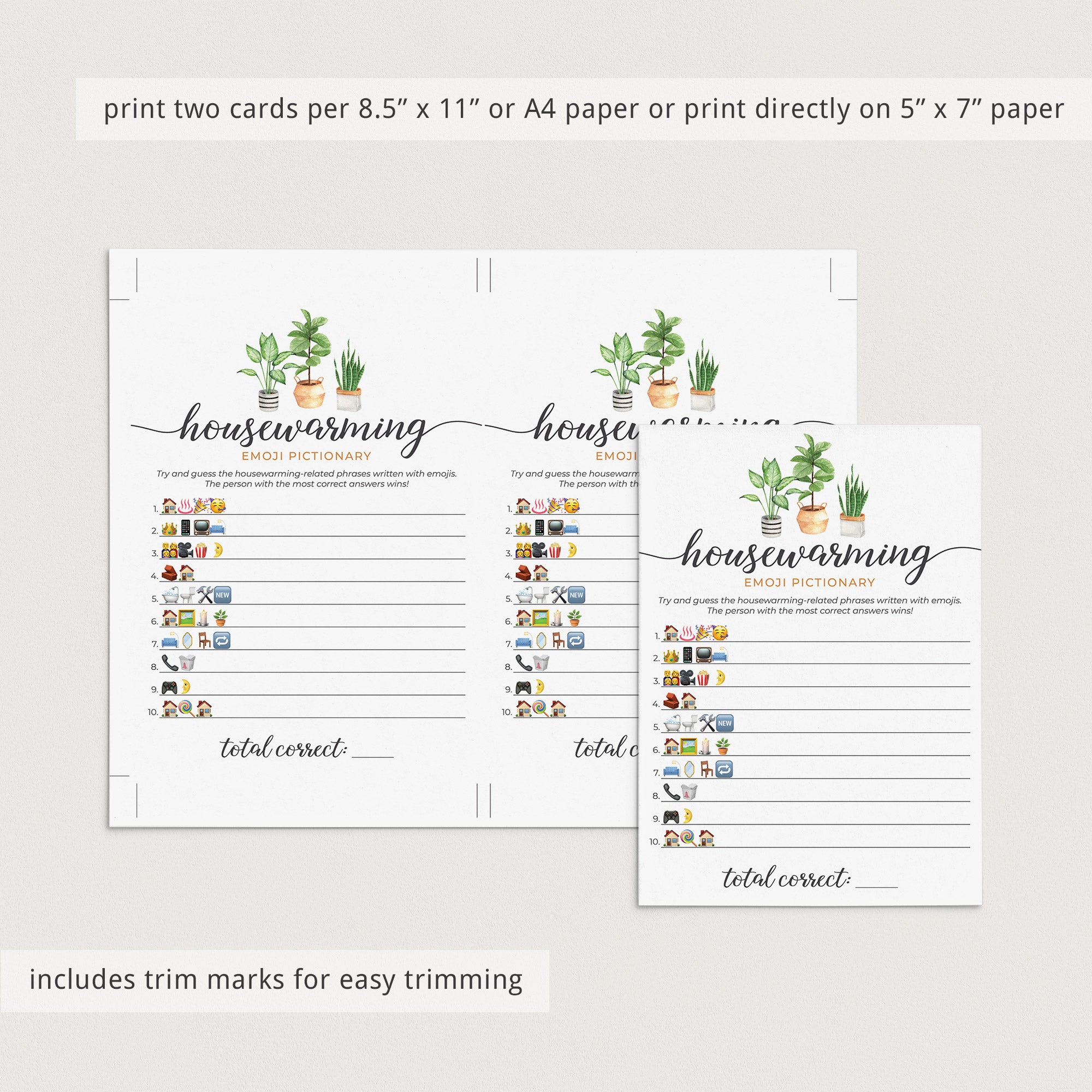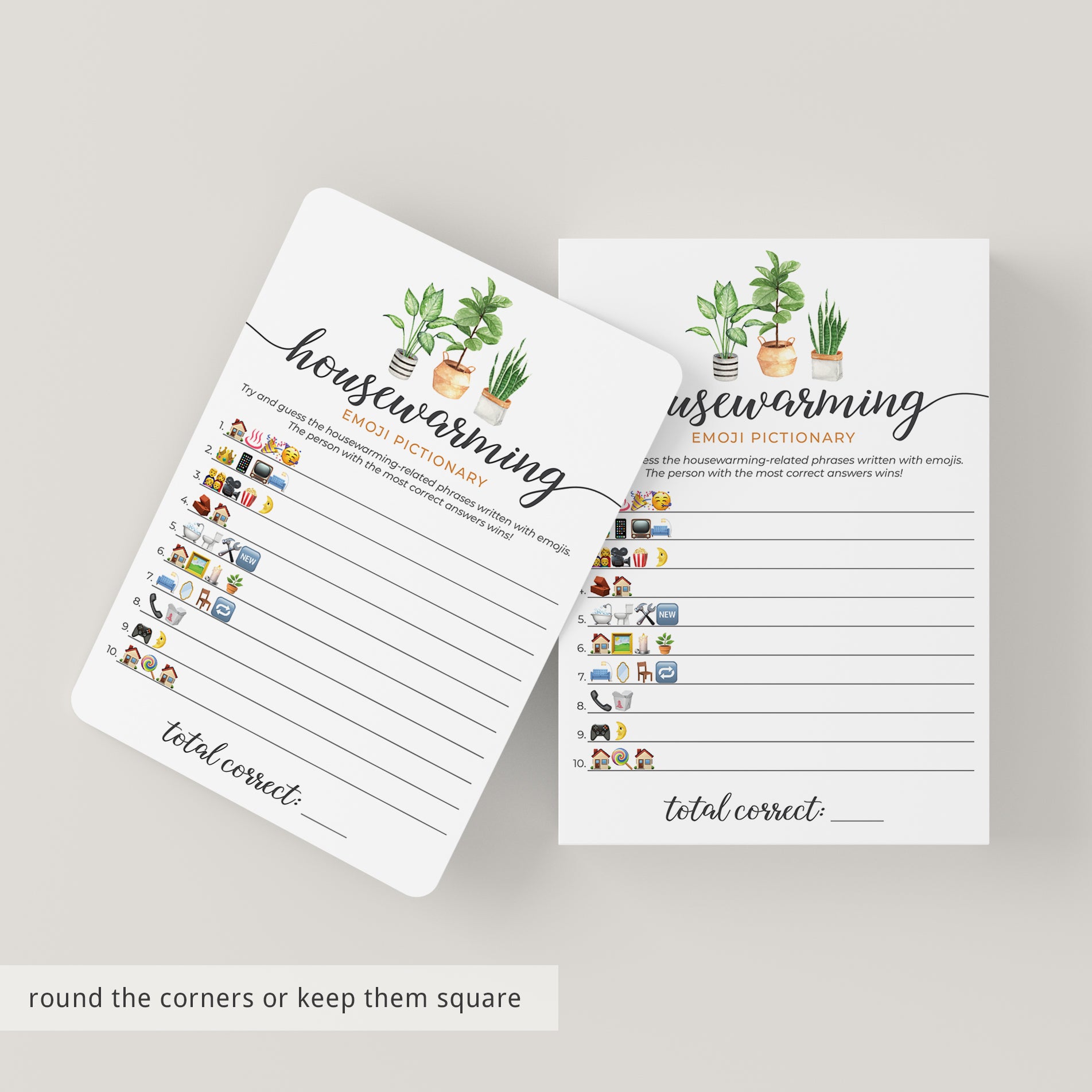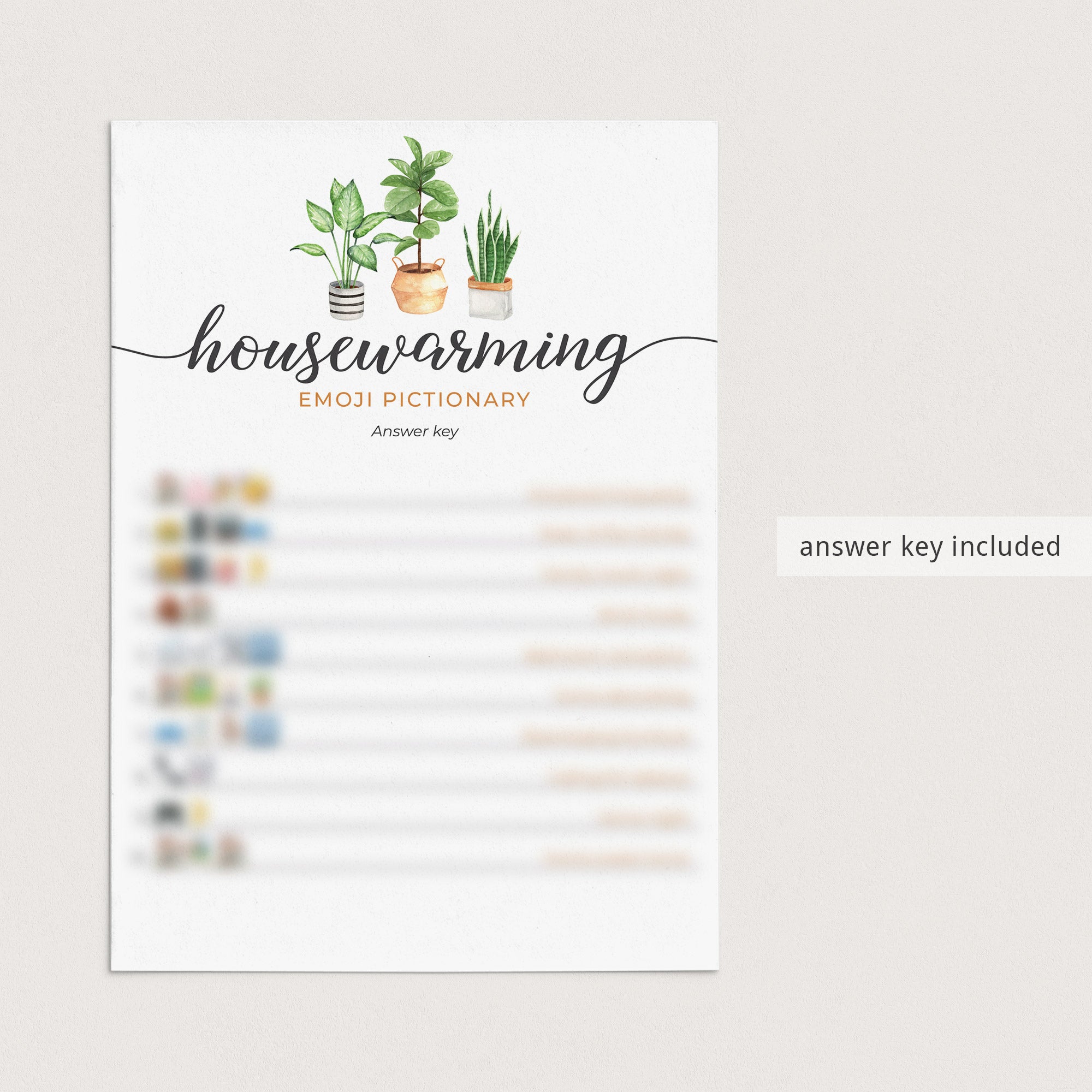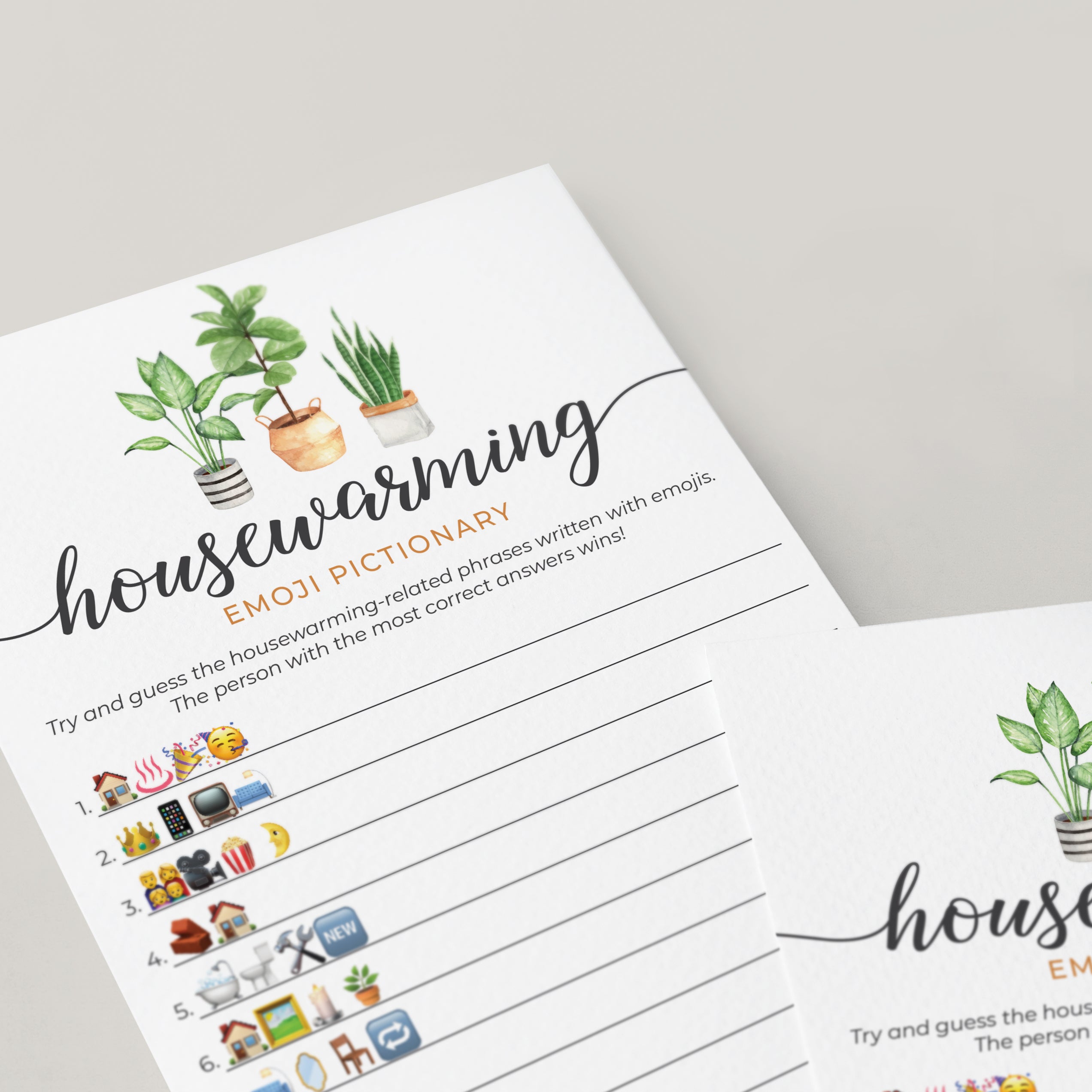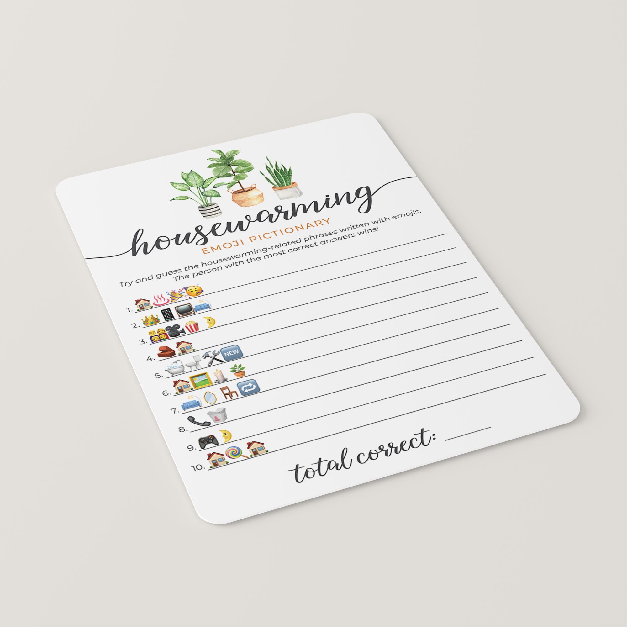 Are you looking for a fun game to play at your housewarming party? Play Emoji Pictionary! It's a great game for all ages. This housewarming emojis game with calligraphy script and watercolor house plants will fit any housewarming party theme.