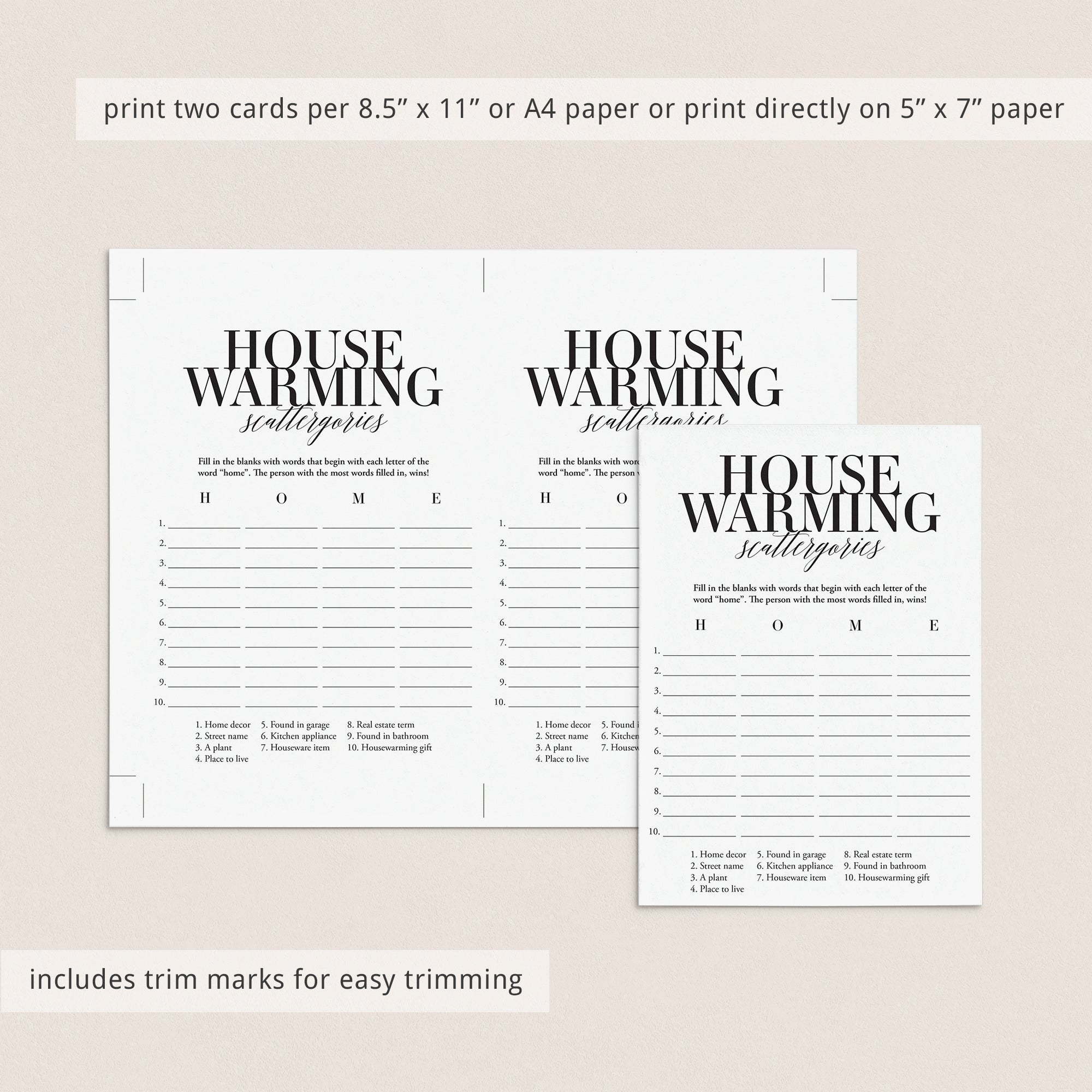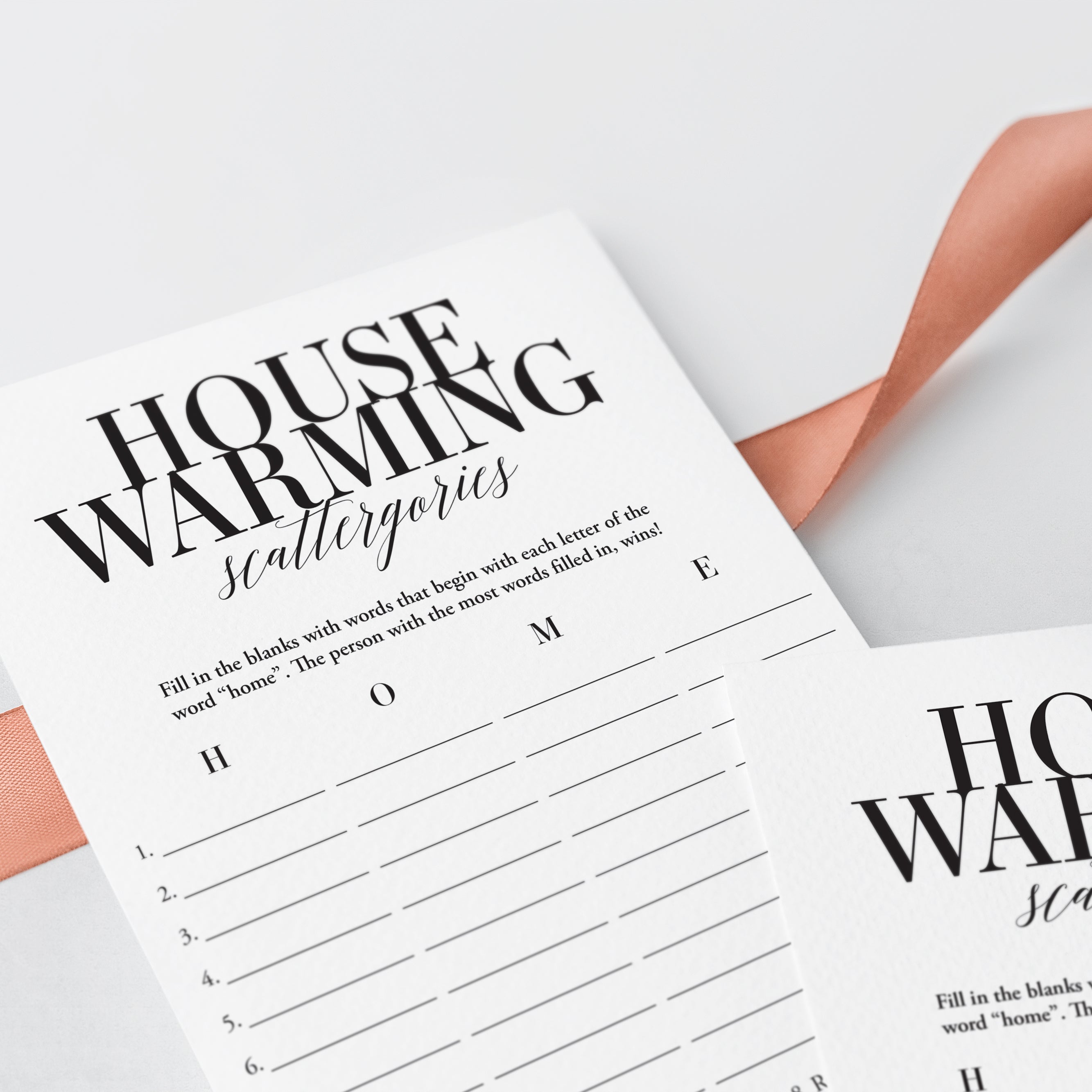 How many words can you fill in with the letters "H", "O", "M" and "E"? Play Scattergories at your housewarming party with these modern minimal game cards. It's a great game for all ages and the simple black and white design will fit any housewarming party theme.