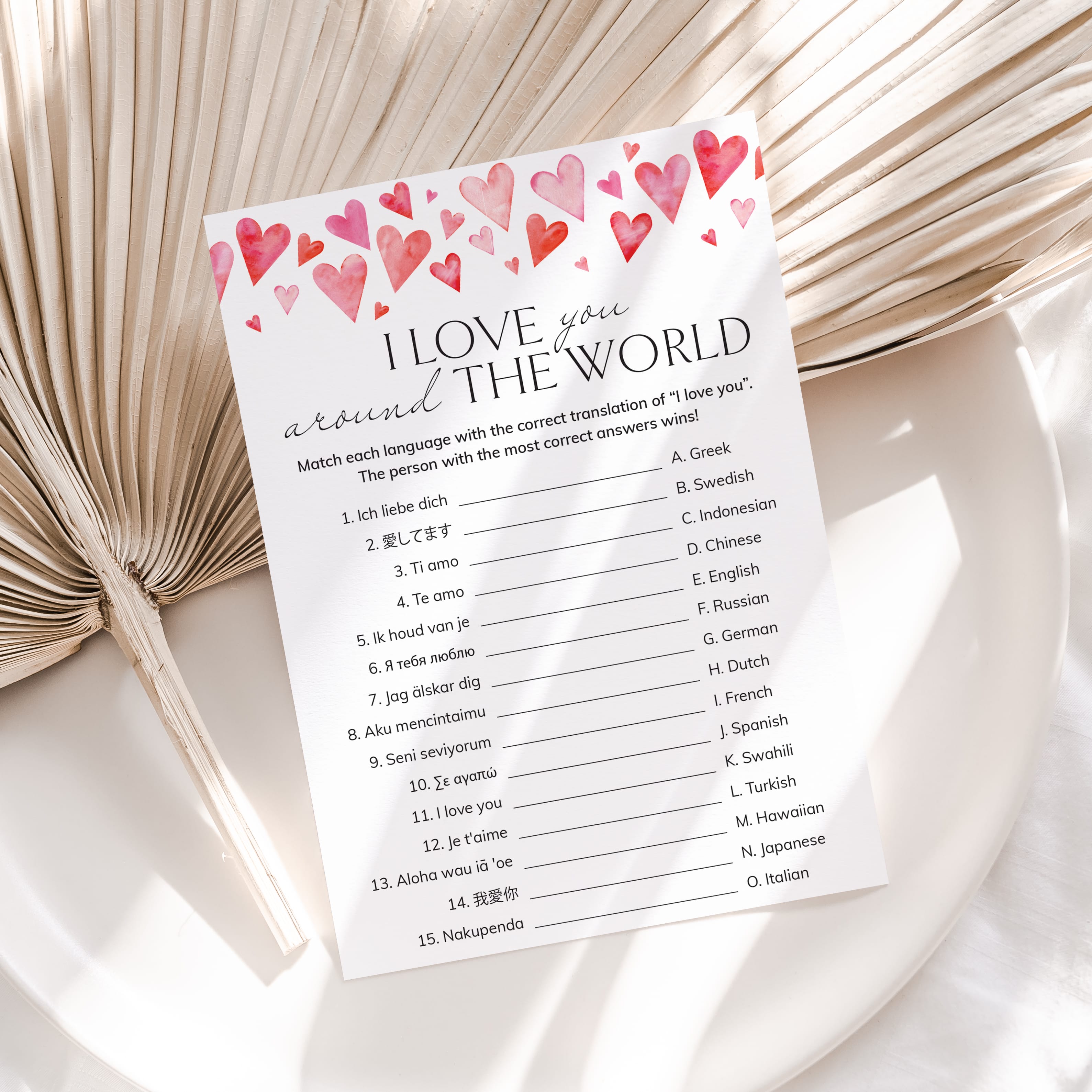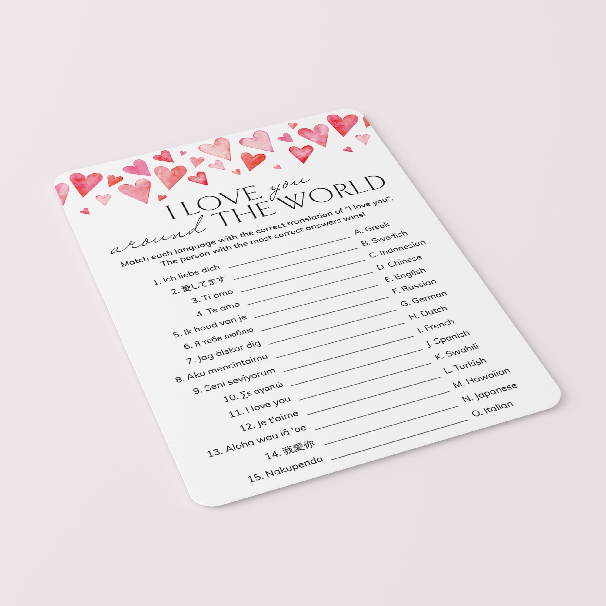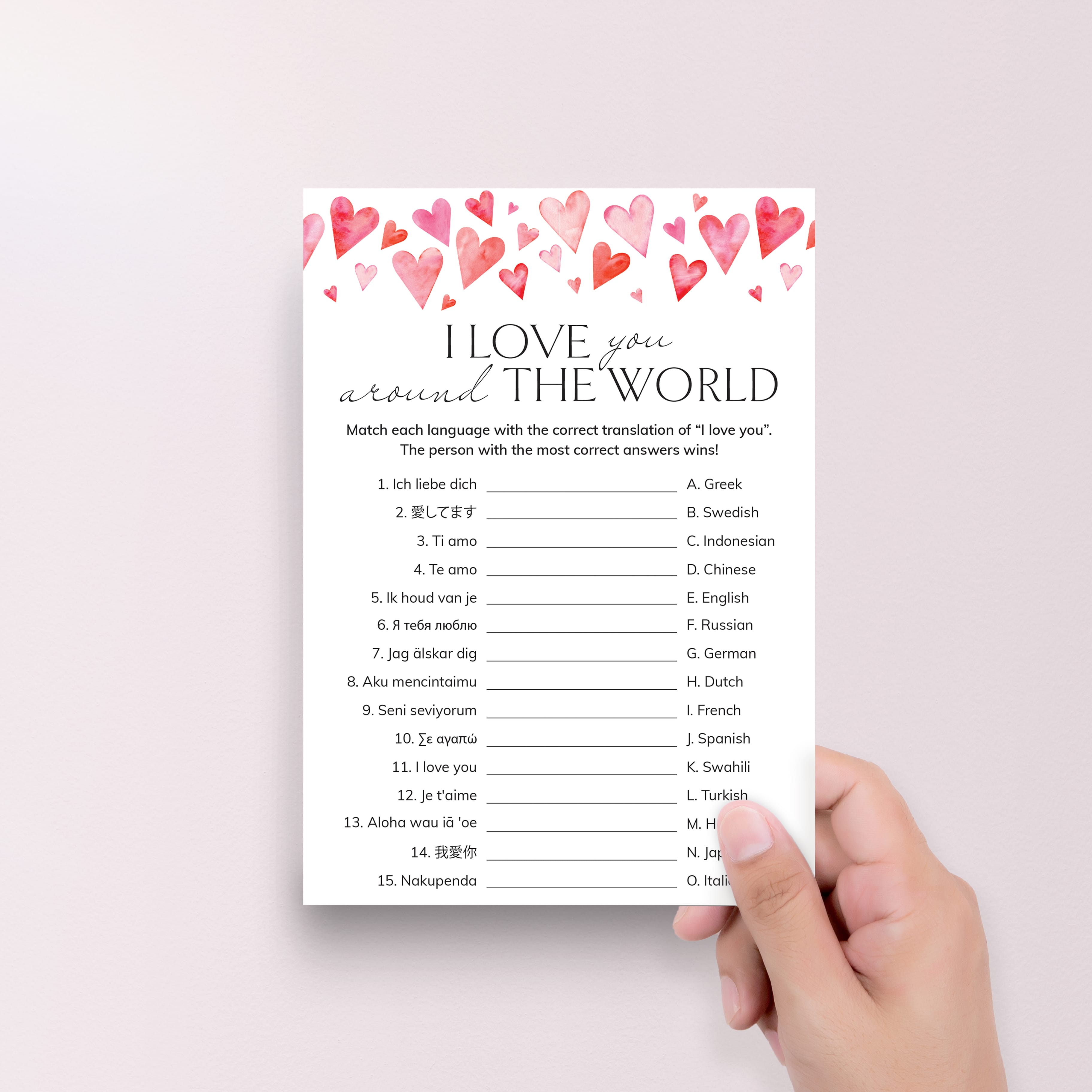 The game is very easy to play. Print and distribute these cute Around The World game cards with watercolor hearts and a pen to each of your guests. They have to match each version of the words “I Love You” with its language of origin. The person with the most correct answers wins.