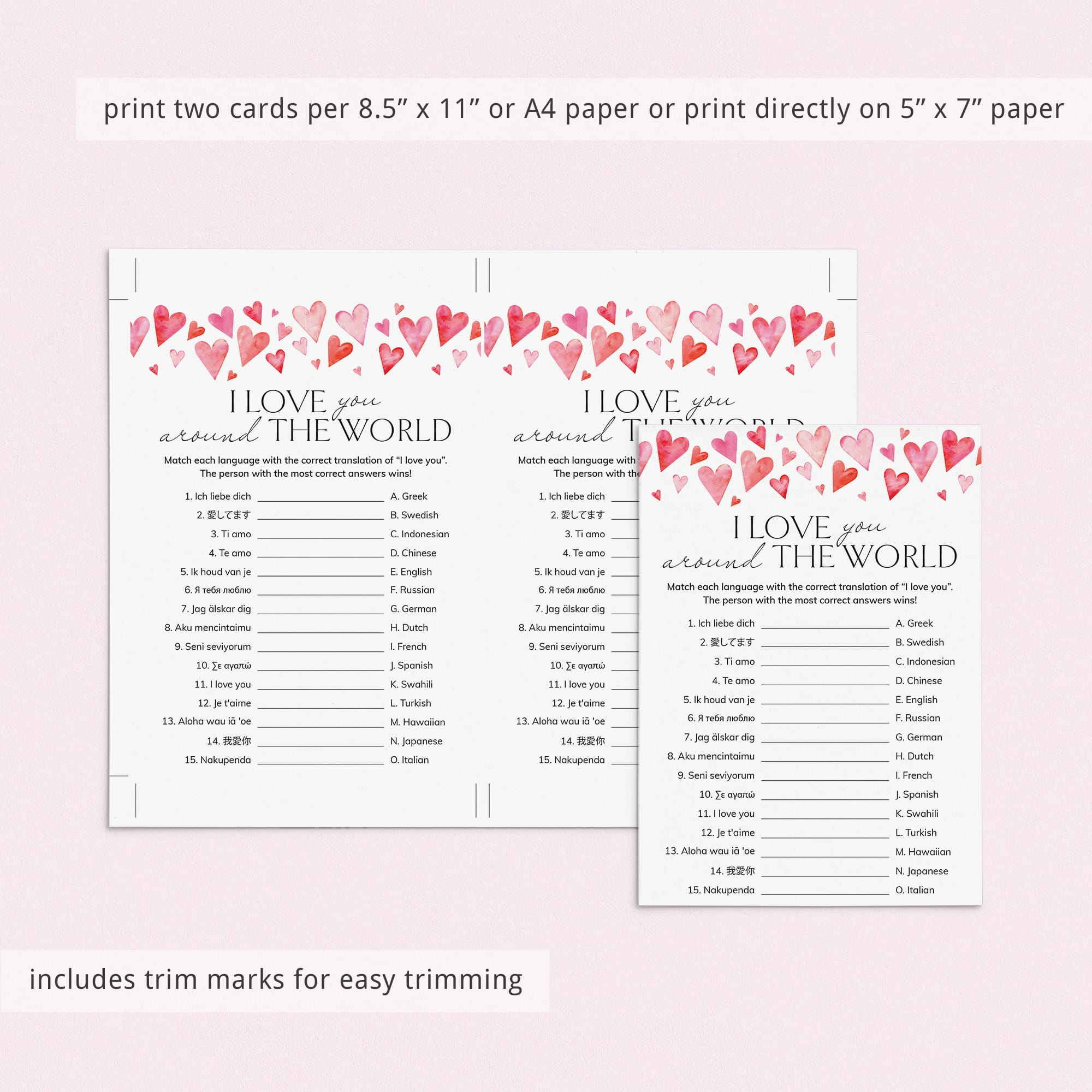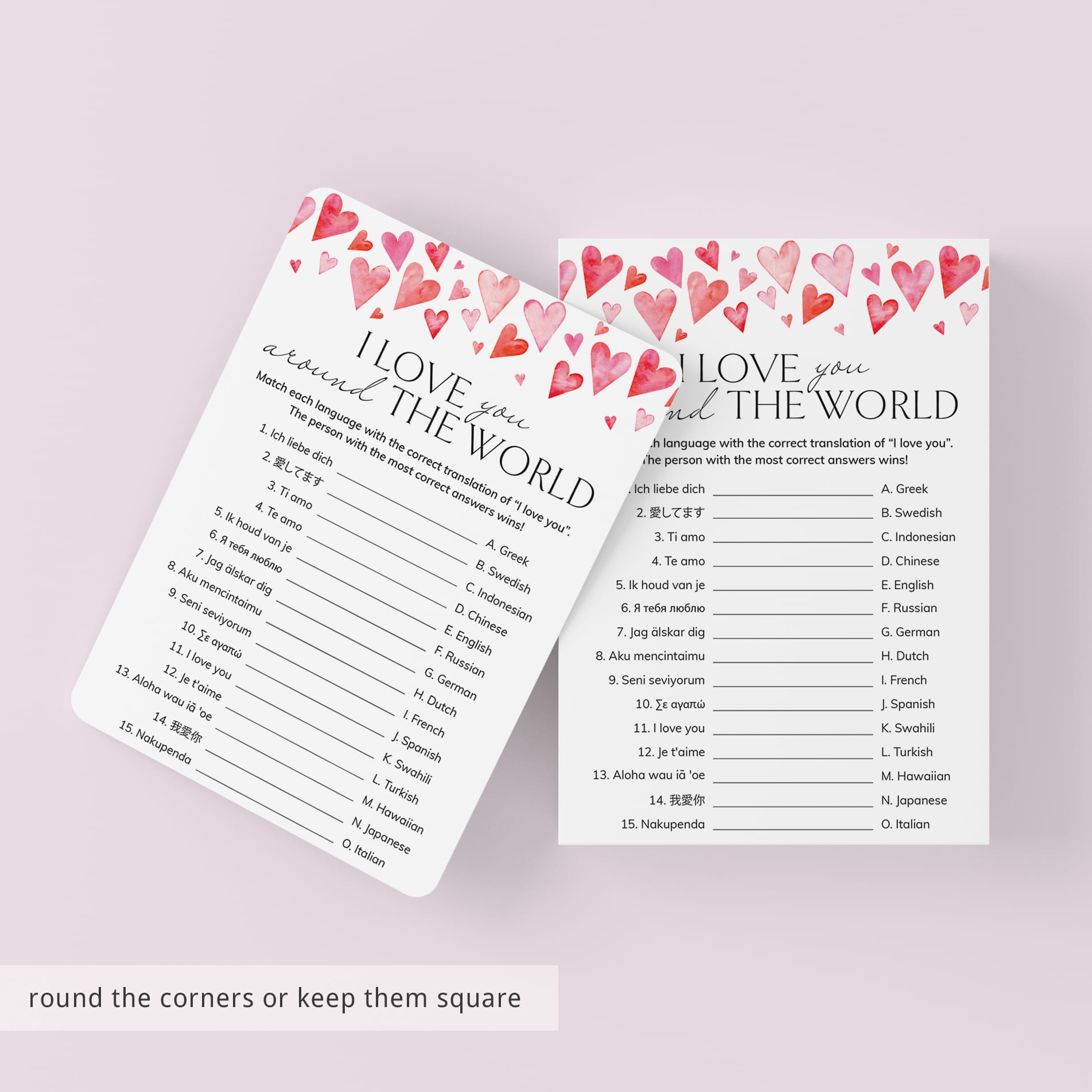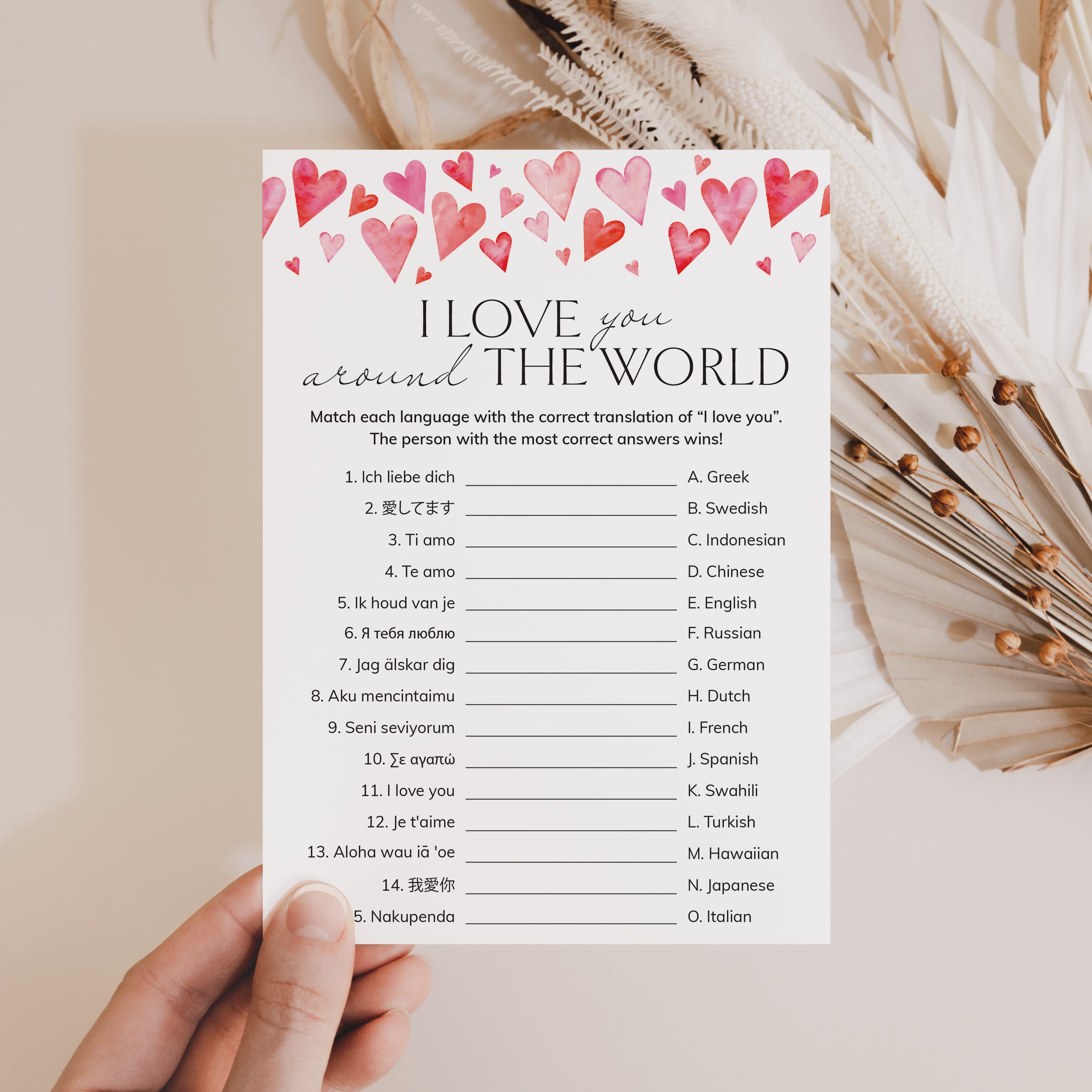 The game is very easy to play. Print and distribute these cute Around The World game cards with watercolor hearts and a pen to each of your guests. They have to match each version of the words “I Love You” with its language of origin. The person with the most correct answers wins.