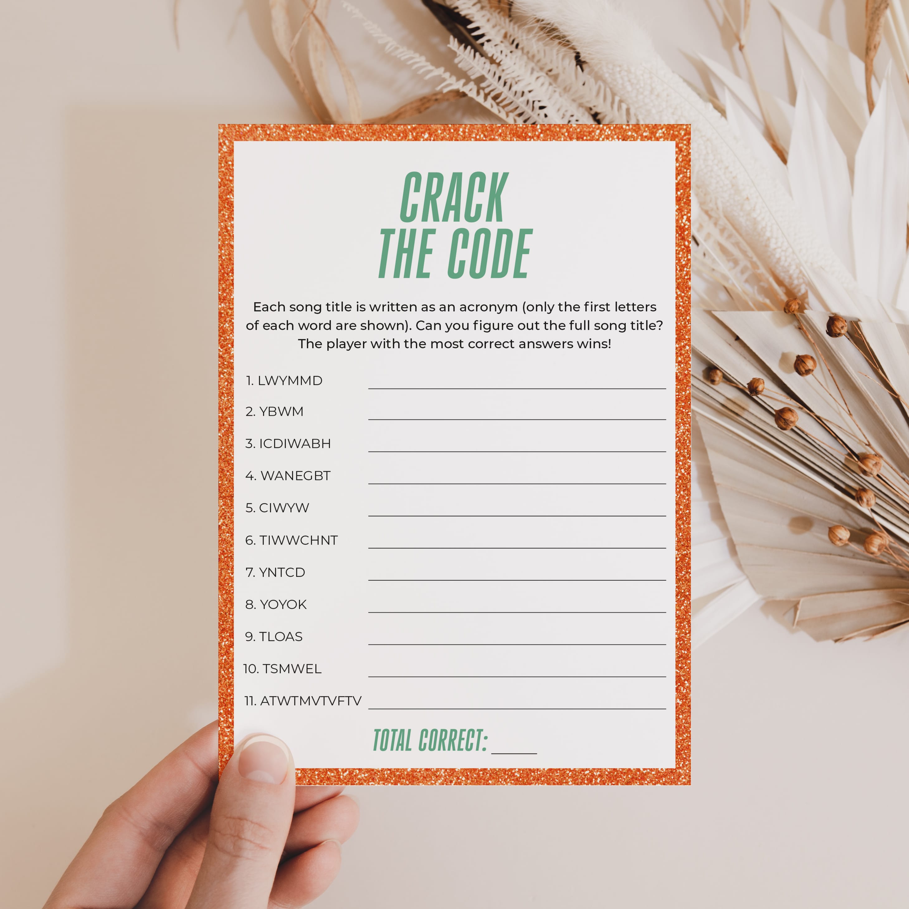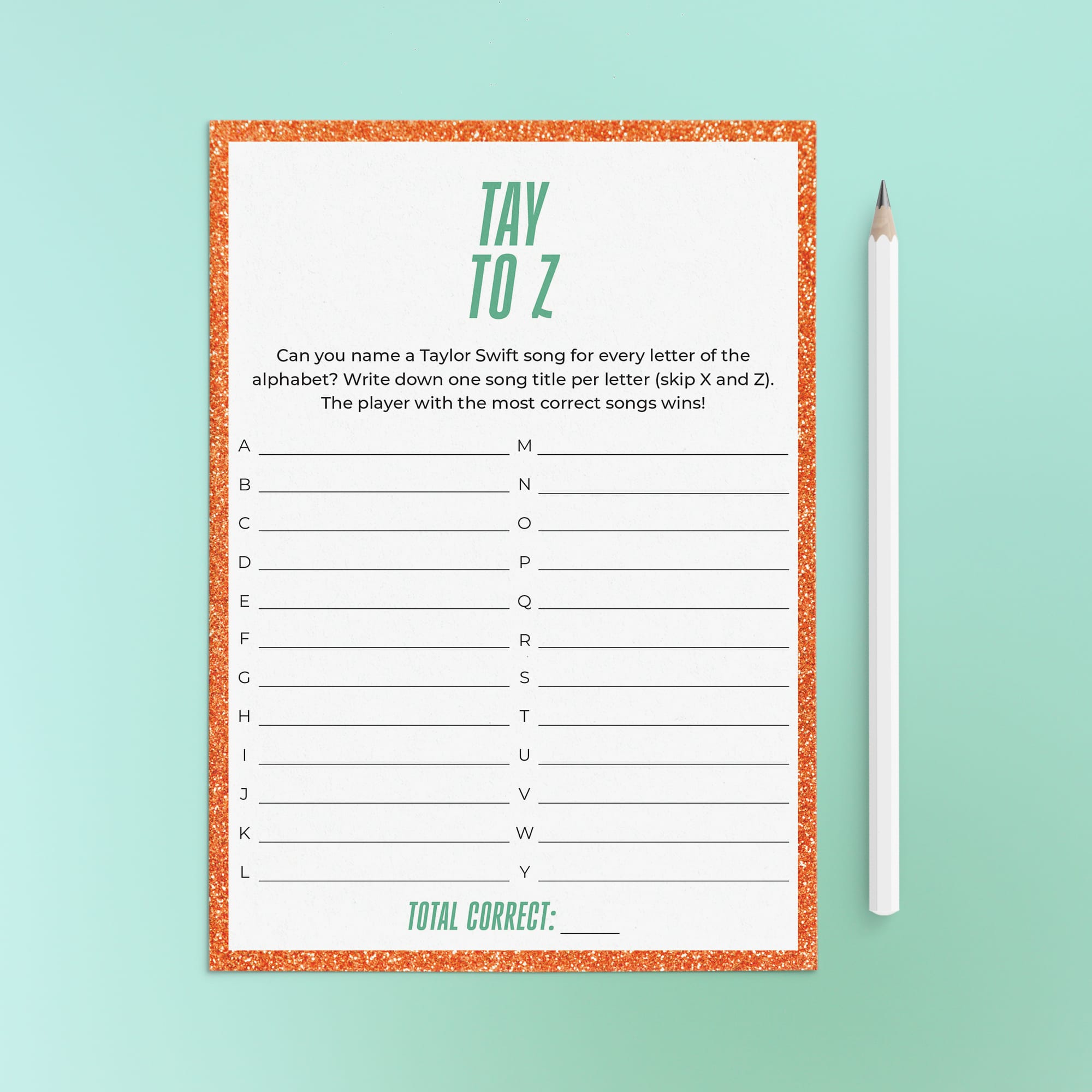 Turn your party into a glittering celebration with this Showgirl-inspired printable game bundle! Featuring a bold glitter-orange border and mint green details, this set is designed to shine at birthdays, slumber parties, and listening nights with friends.