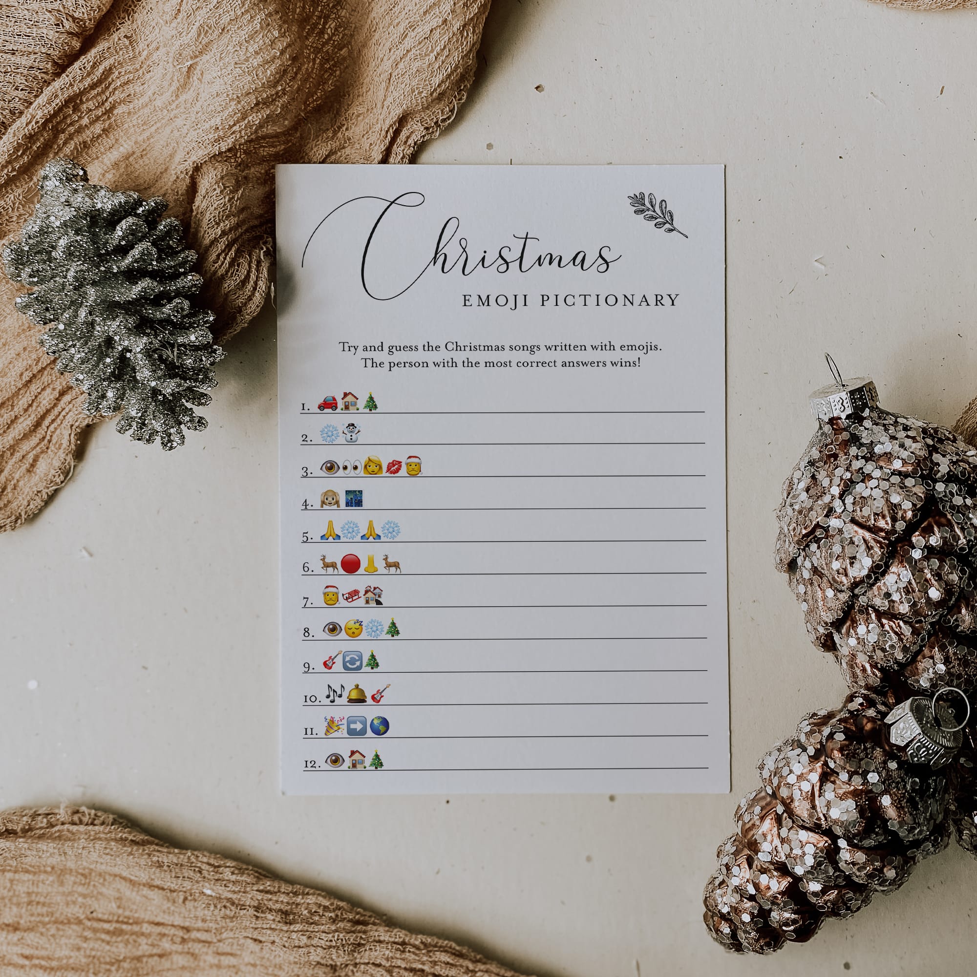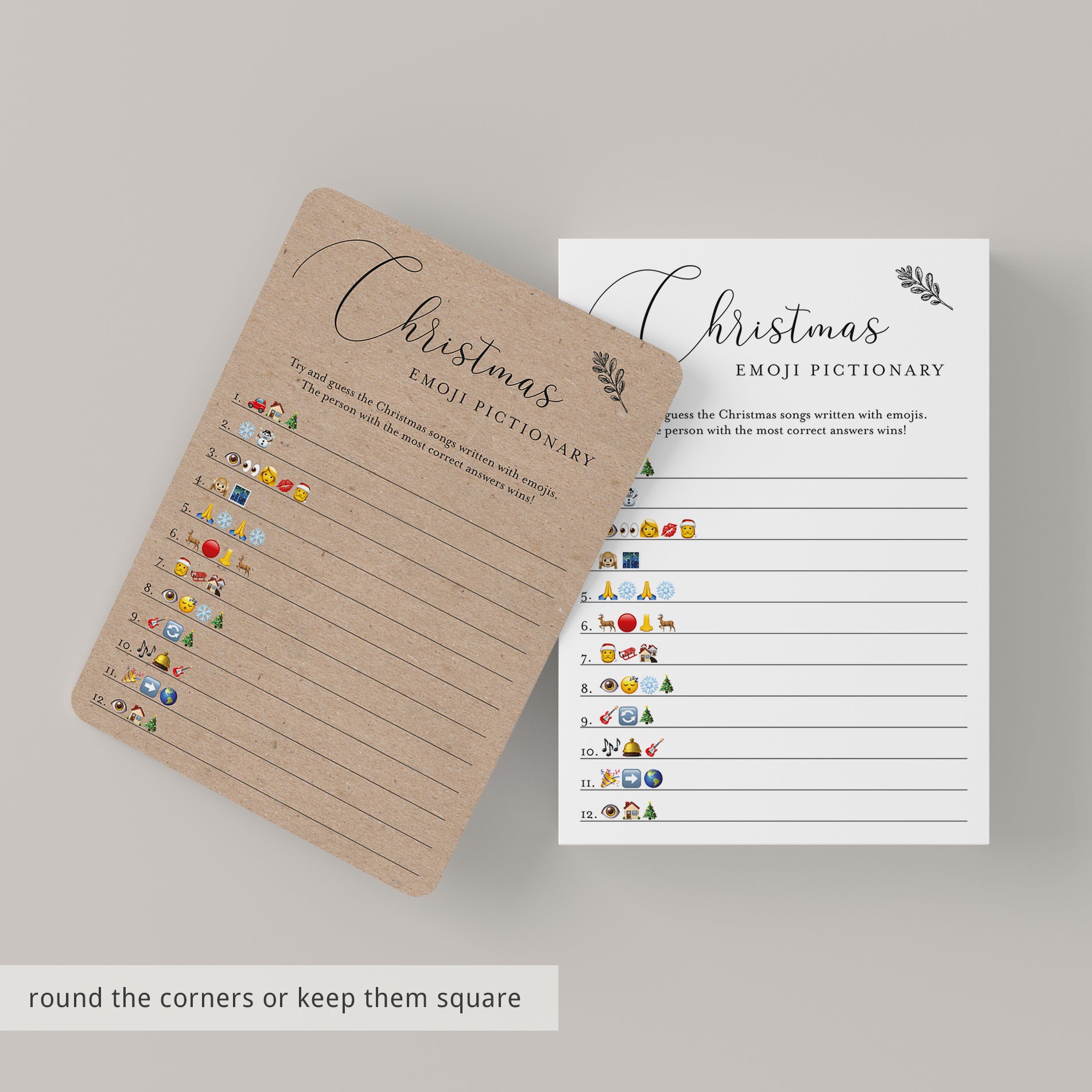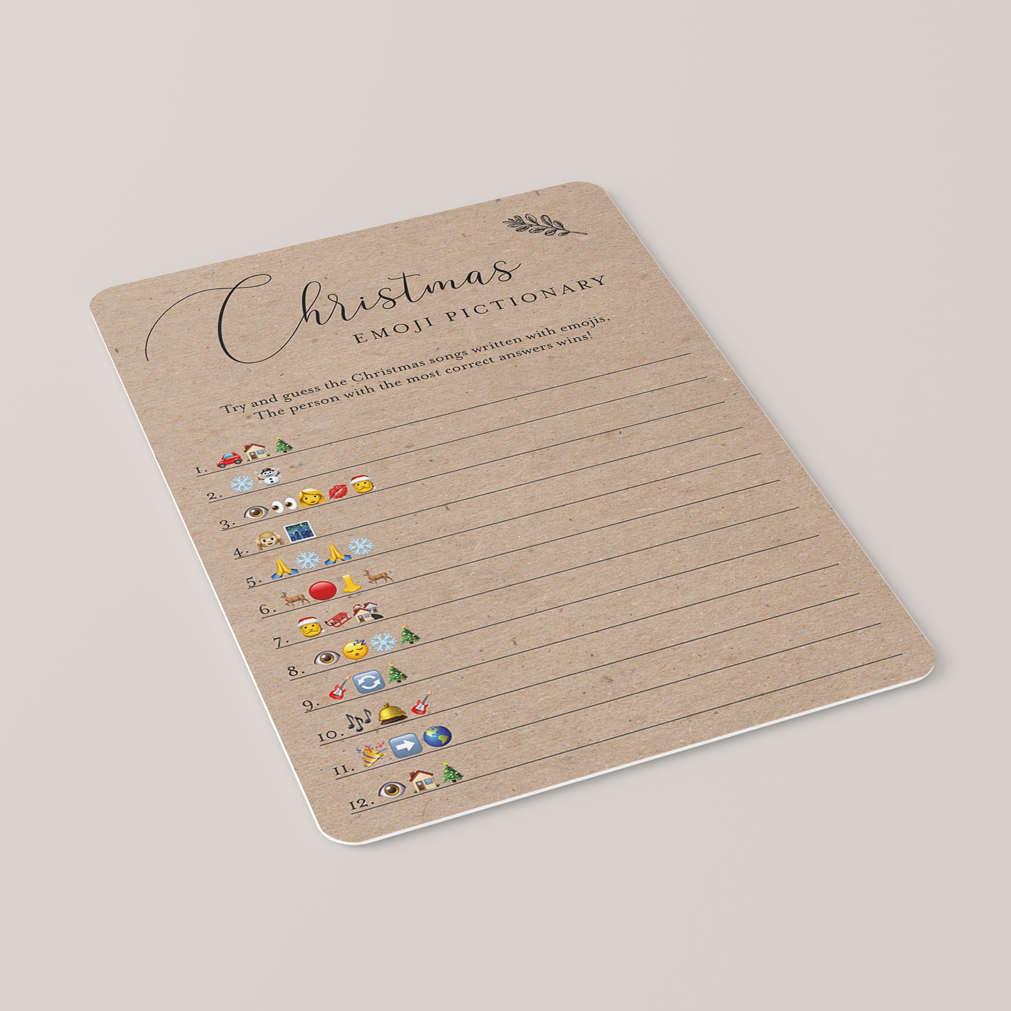 Are you looking for a fun game to play at your Christmas party? Play Christmas Songs Emojis Pictionary with this rustic game card with kraft paper background. It's the perfect addition to a Christmas party with friends and family or a company Christmas party.