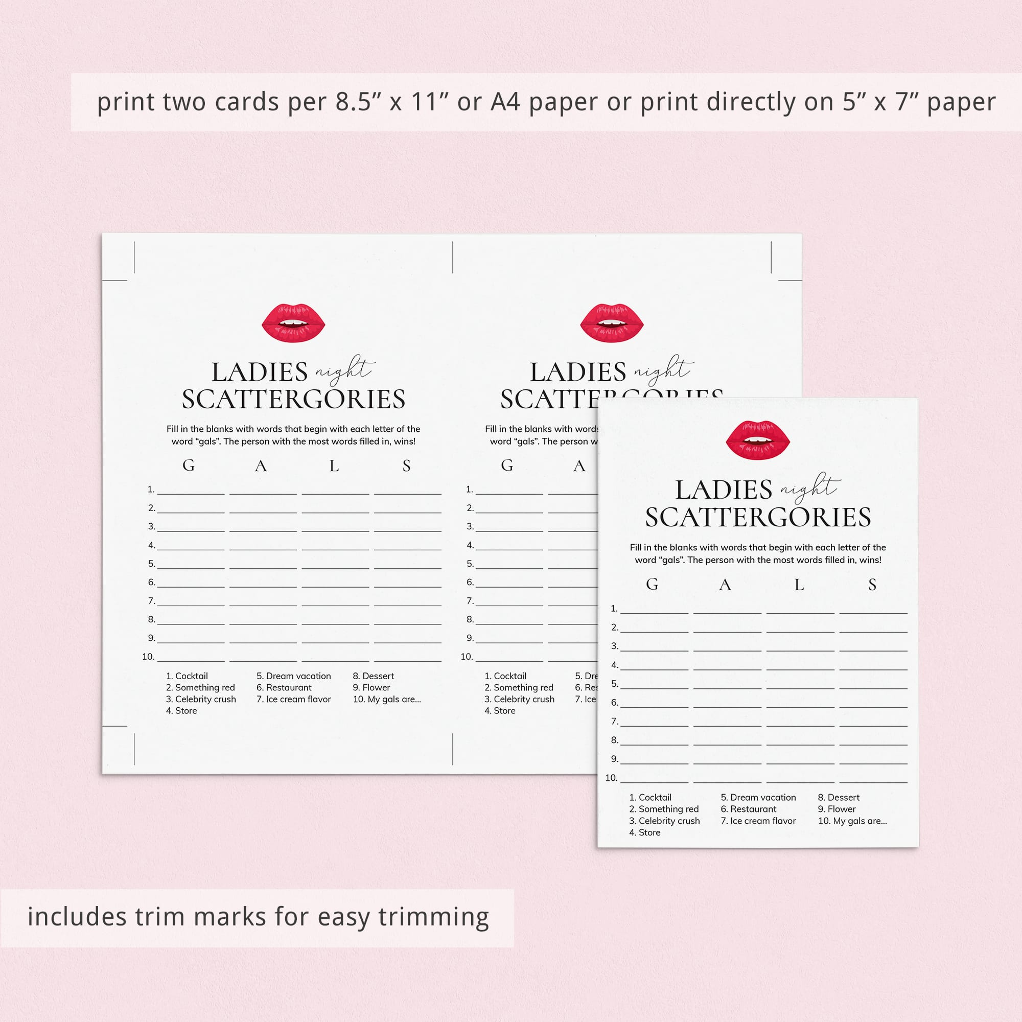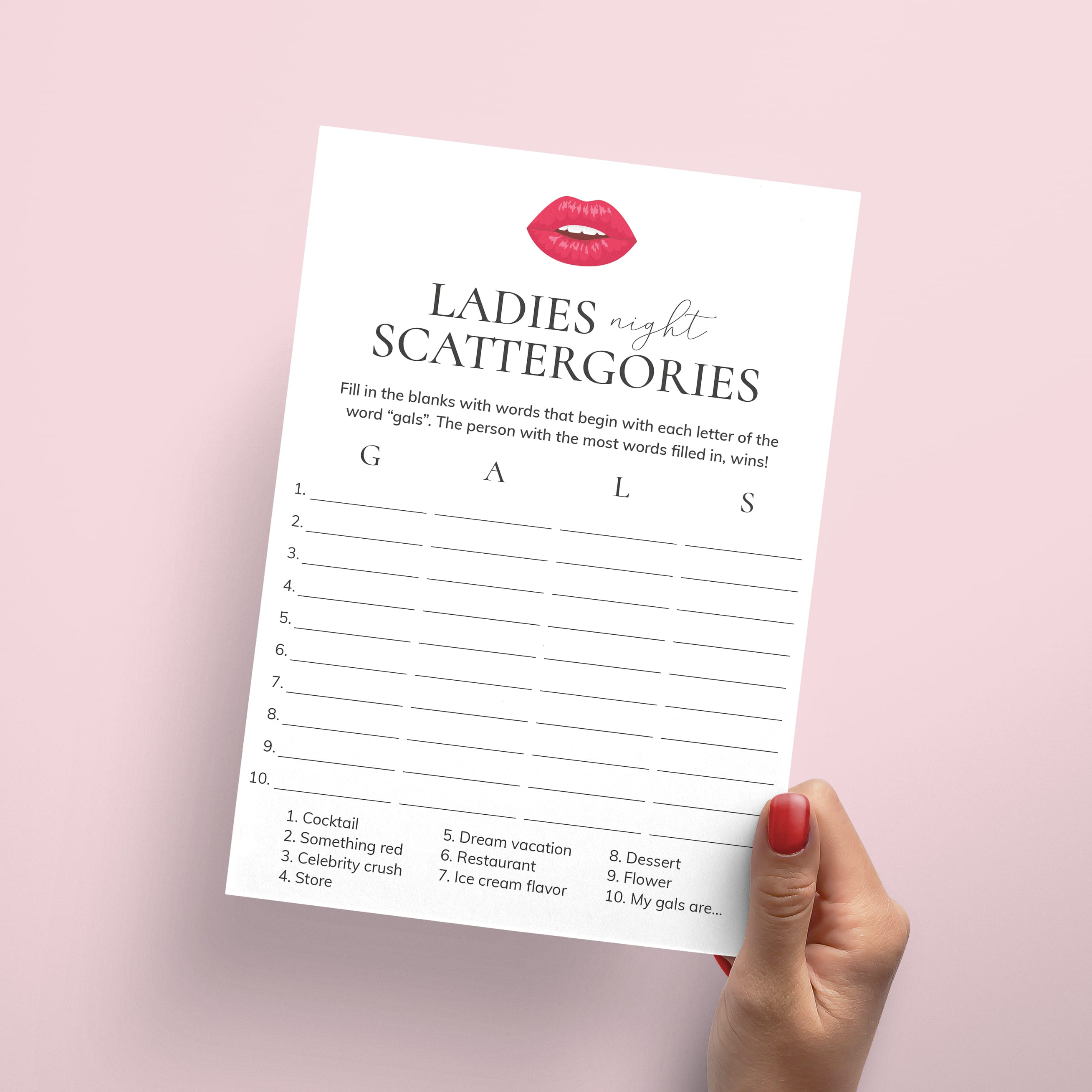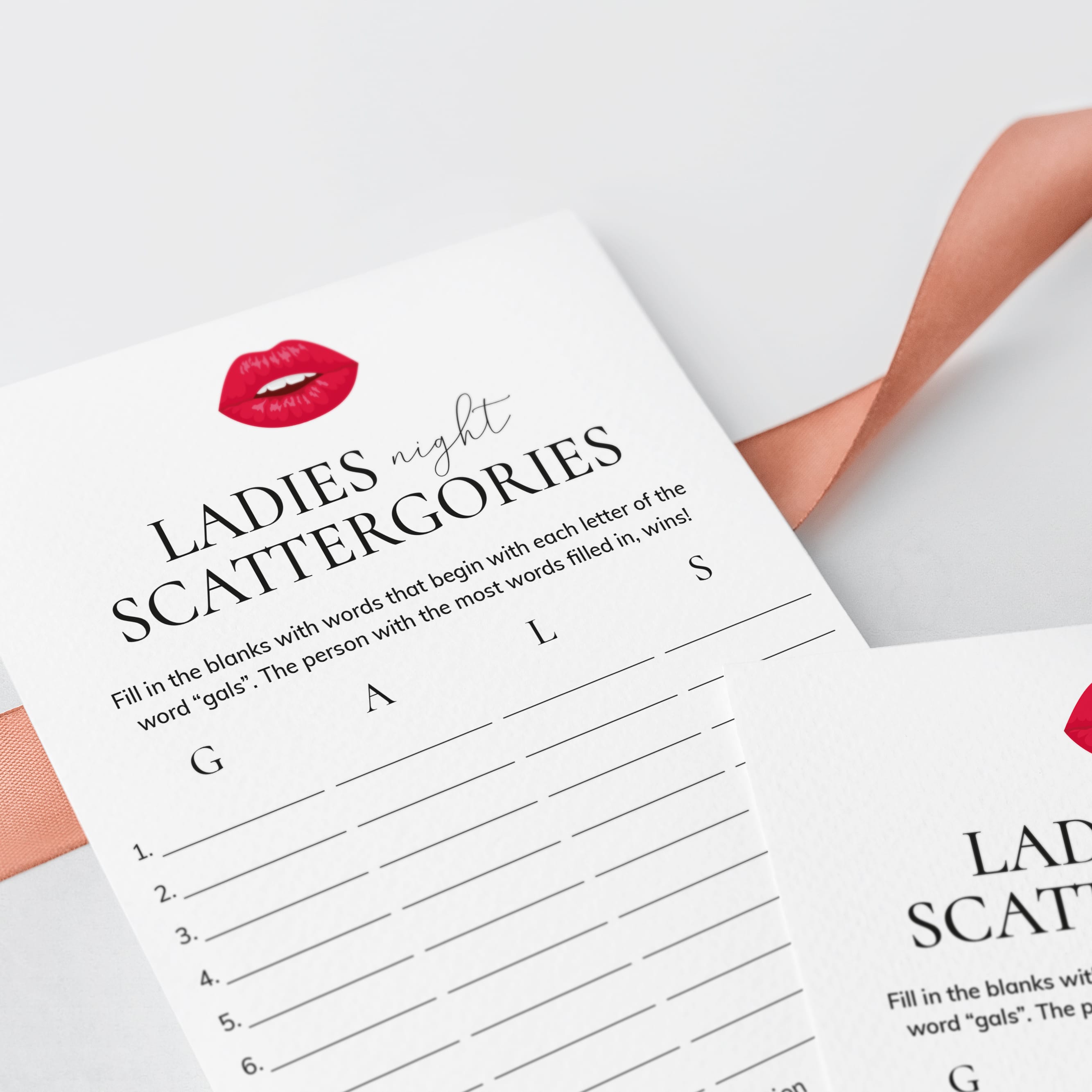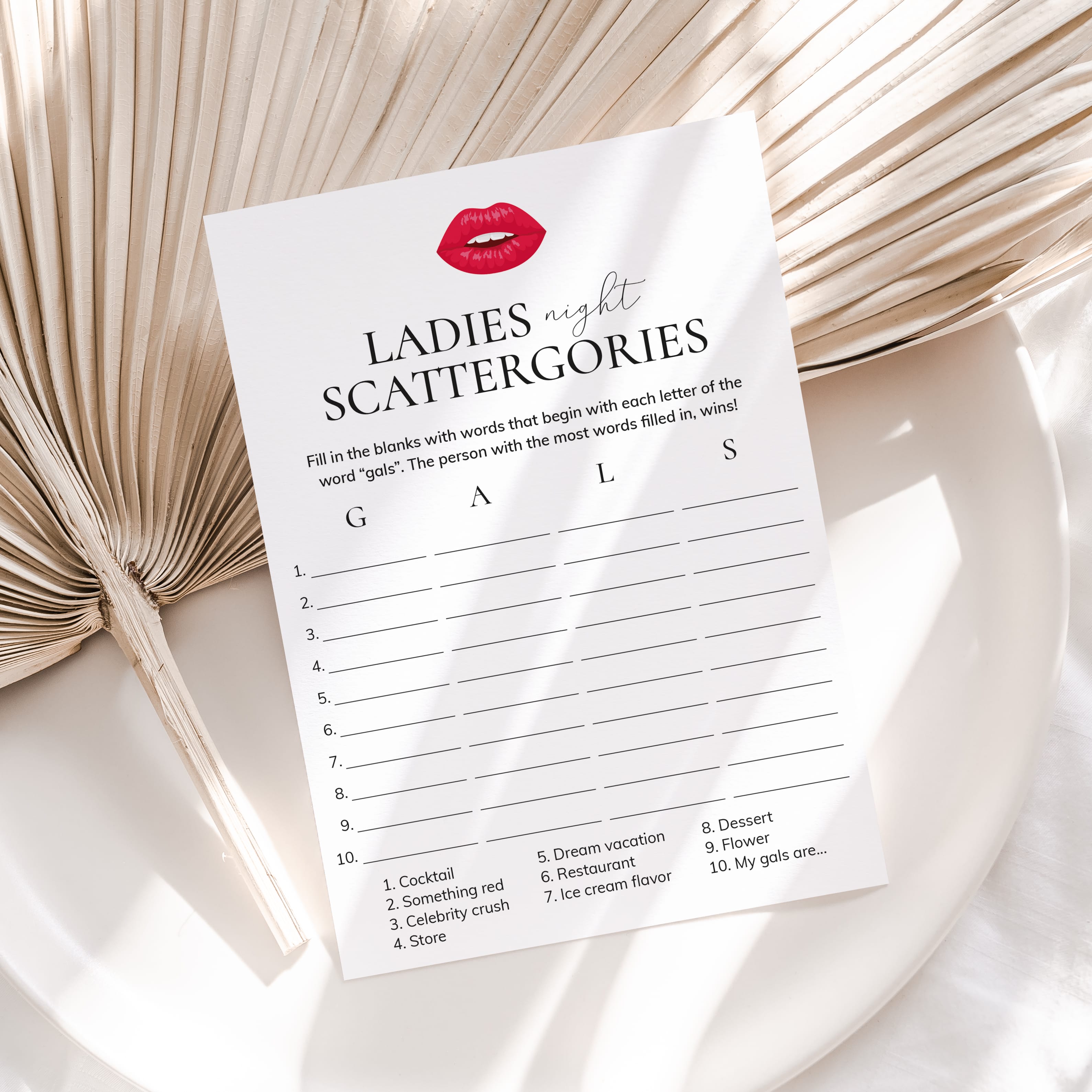 How many words can you fill in with the letters "G", "A", "L" and "S"? Play Scattergories at your Ladies Night party to ensure lots of fun and laughter. This scattergories game with red lips is the perfect addition to your girls night in or ladies night.
