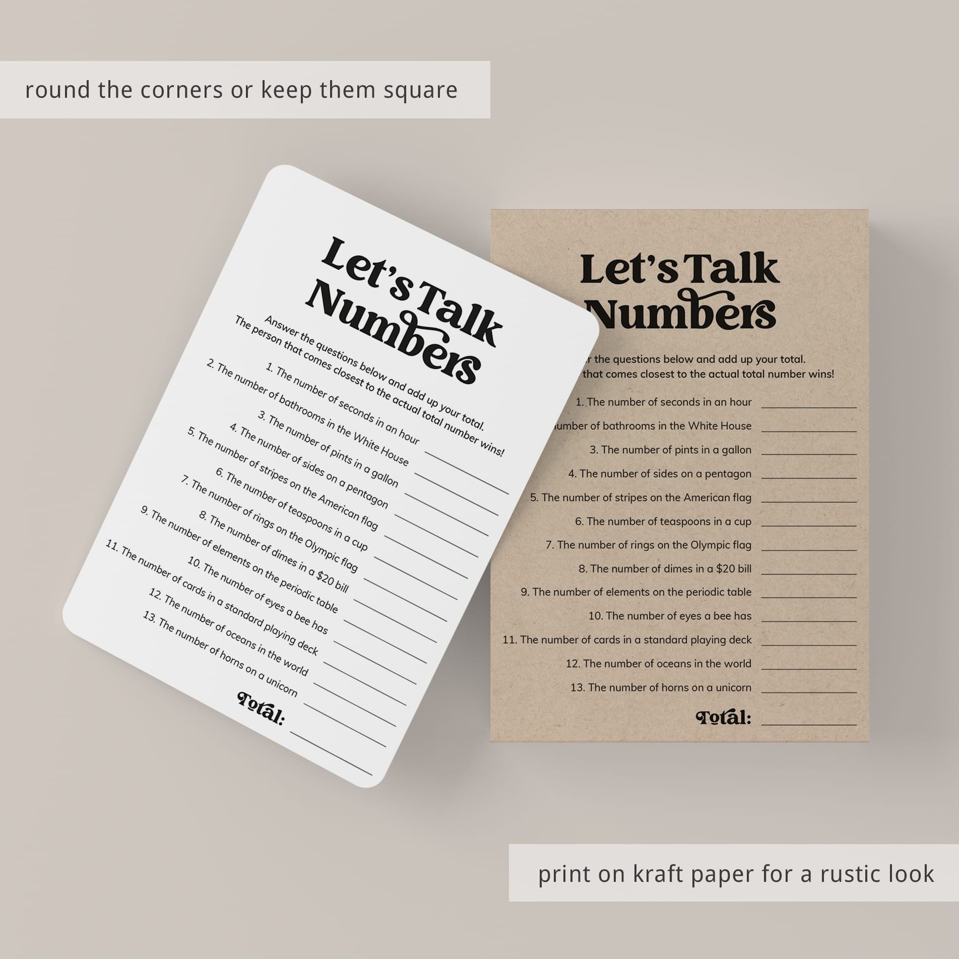 Play the game solo or in teams. Have everyone answer the 13 number related questions and add up their total. No internet or calculator allowed! The person or team that comes closest to the actual total number wins.