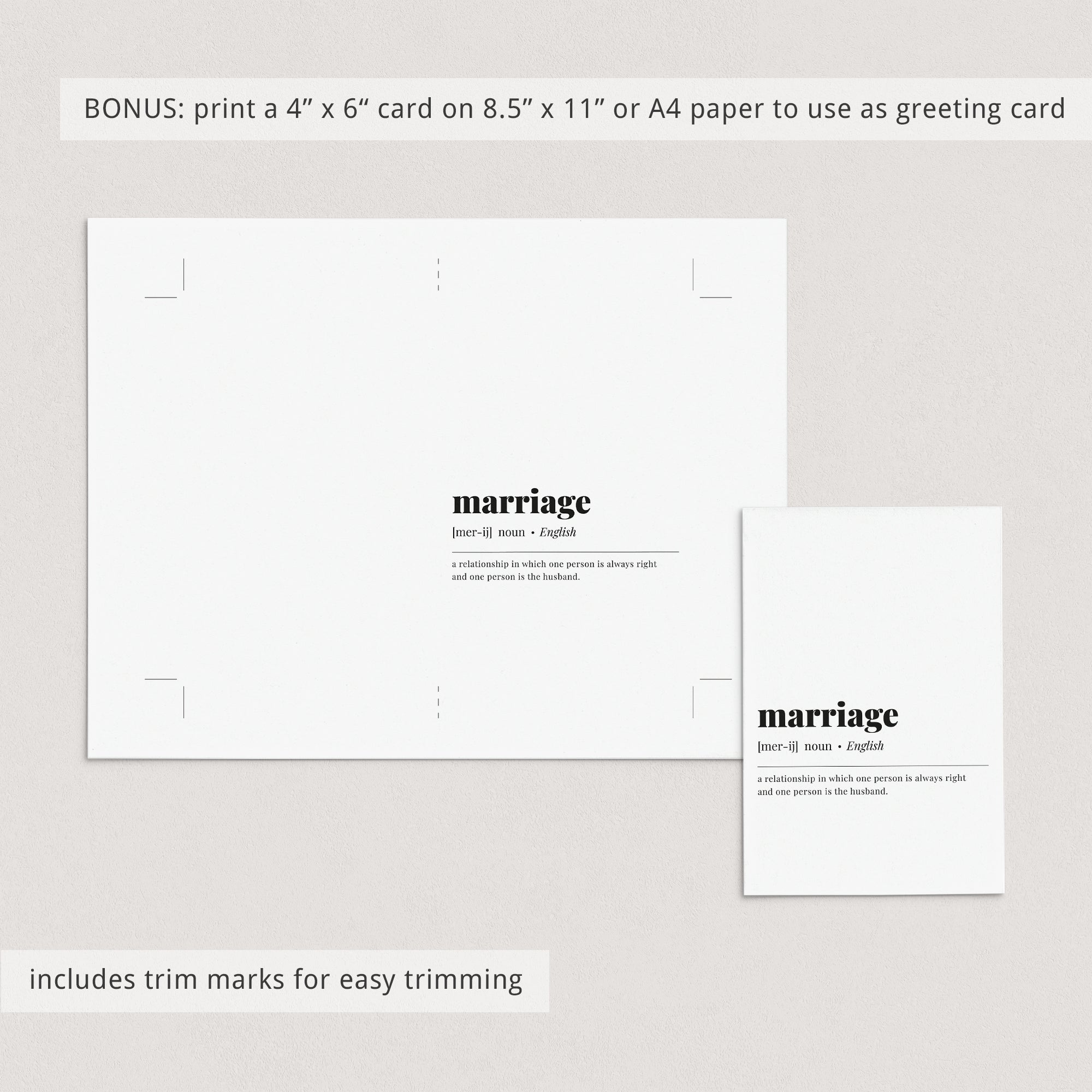 BONUS: an 8.5" x 11" sized JPG-file with trim marks for a folded 4" x 6" greeting card is included as well. Simply print on card stock, trim and fold in half.