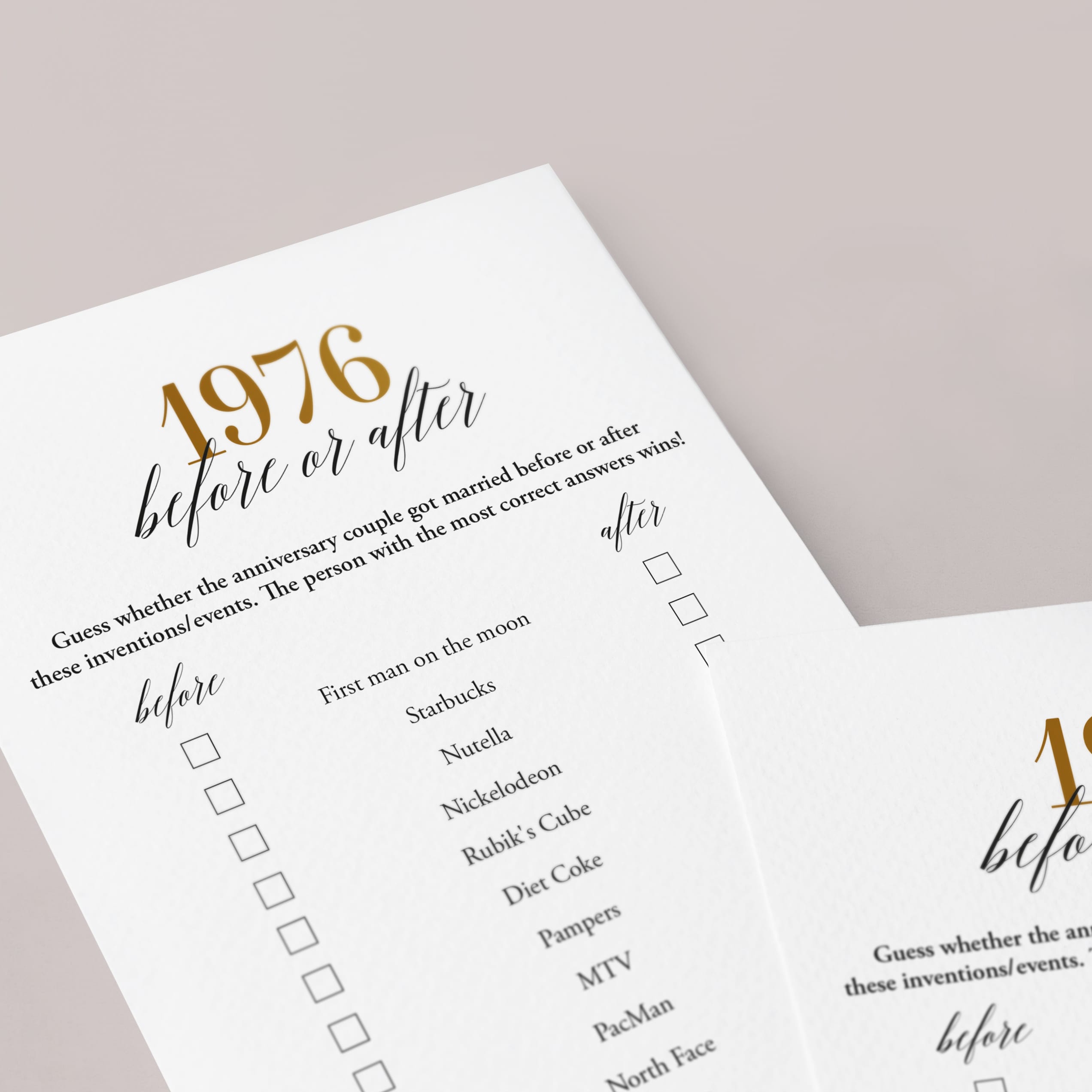 Celebrate a once-in-a-lifetime milestone with the Ultimate 50th Anniversary Party Games Bundle! Designed for couples married in 1976, this all-in-one package is the perfect solution to make your anniversary party stress-free and unforgettable.