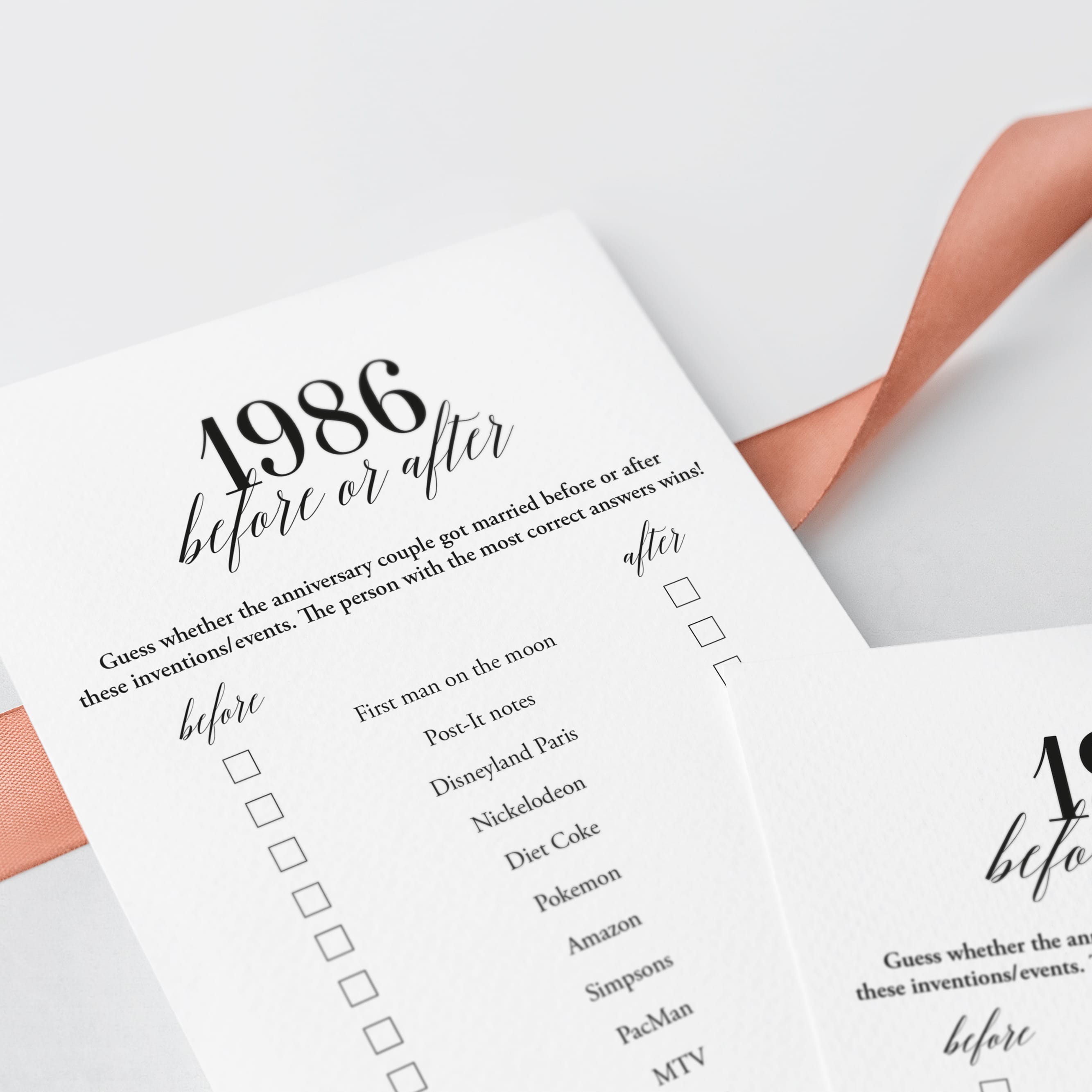 Celebrate a once-in-a-lifetime milestone with the Ultimate 40th Anniversary Party Games Bundle! Designed for couples married in 1986, this all-in-one package is the perfect solution to make your anniversary party stress-free and unforgettable.