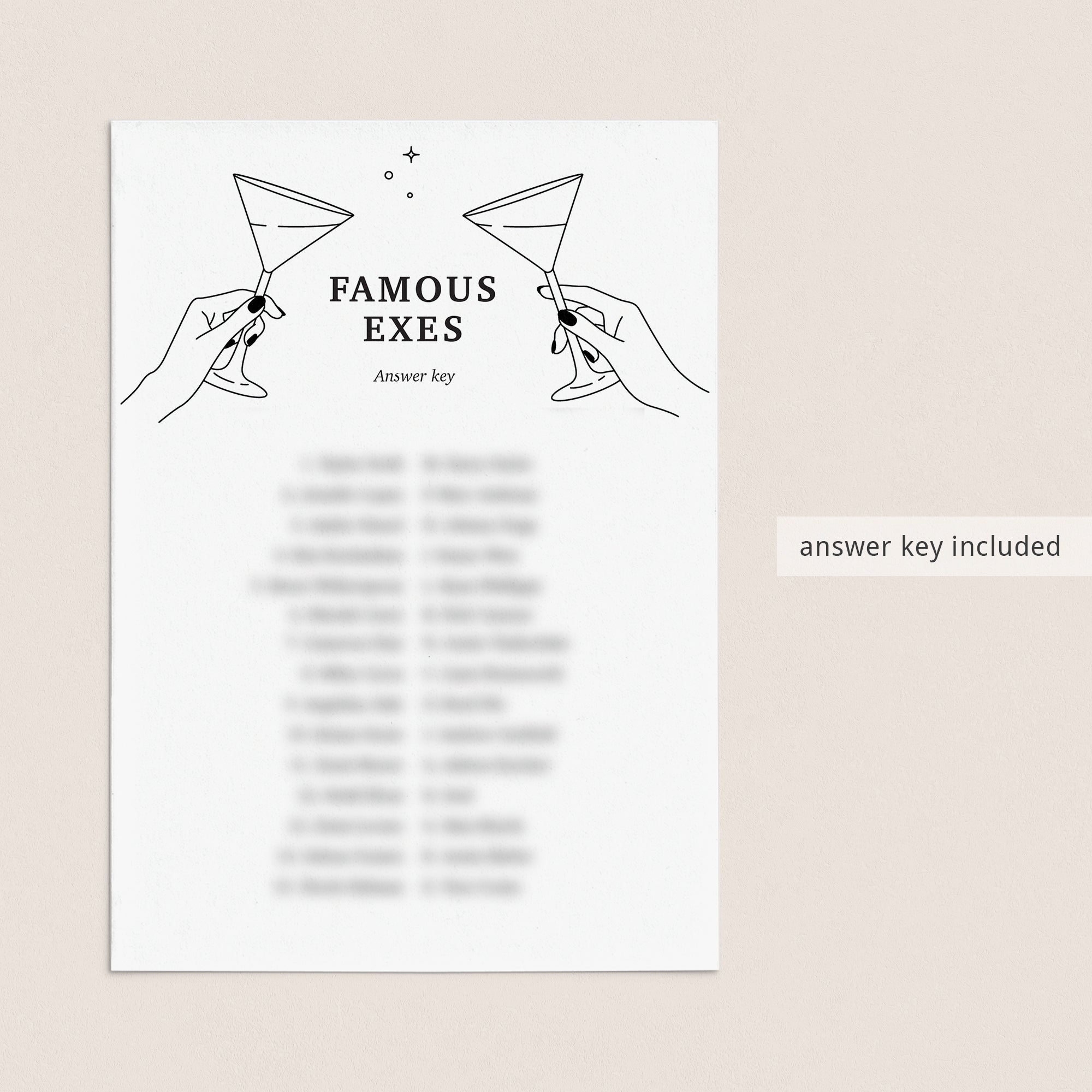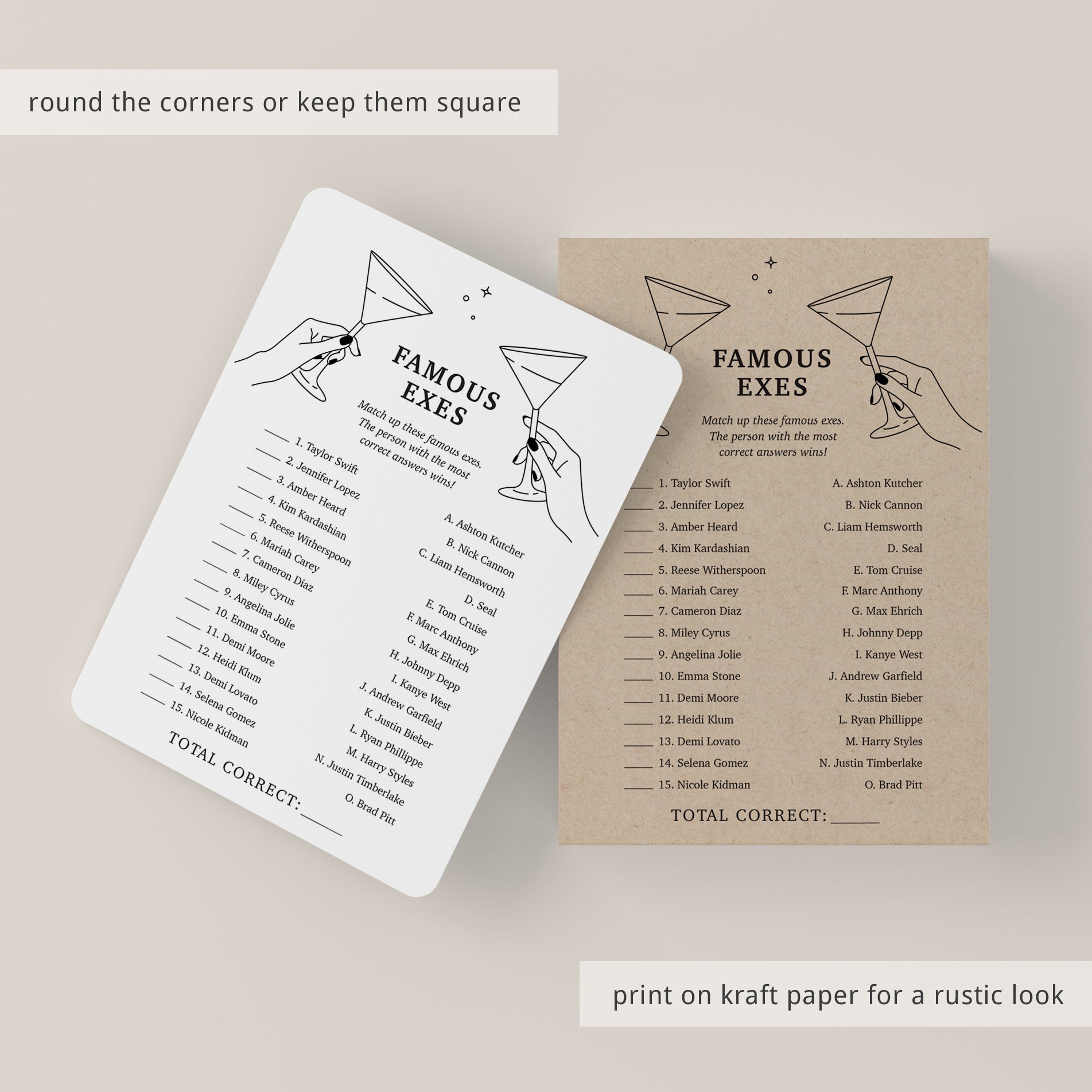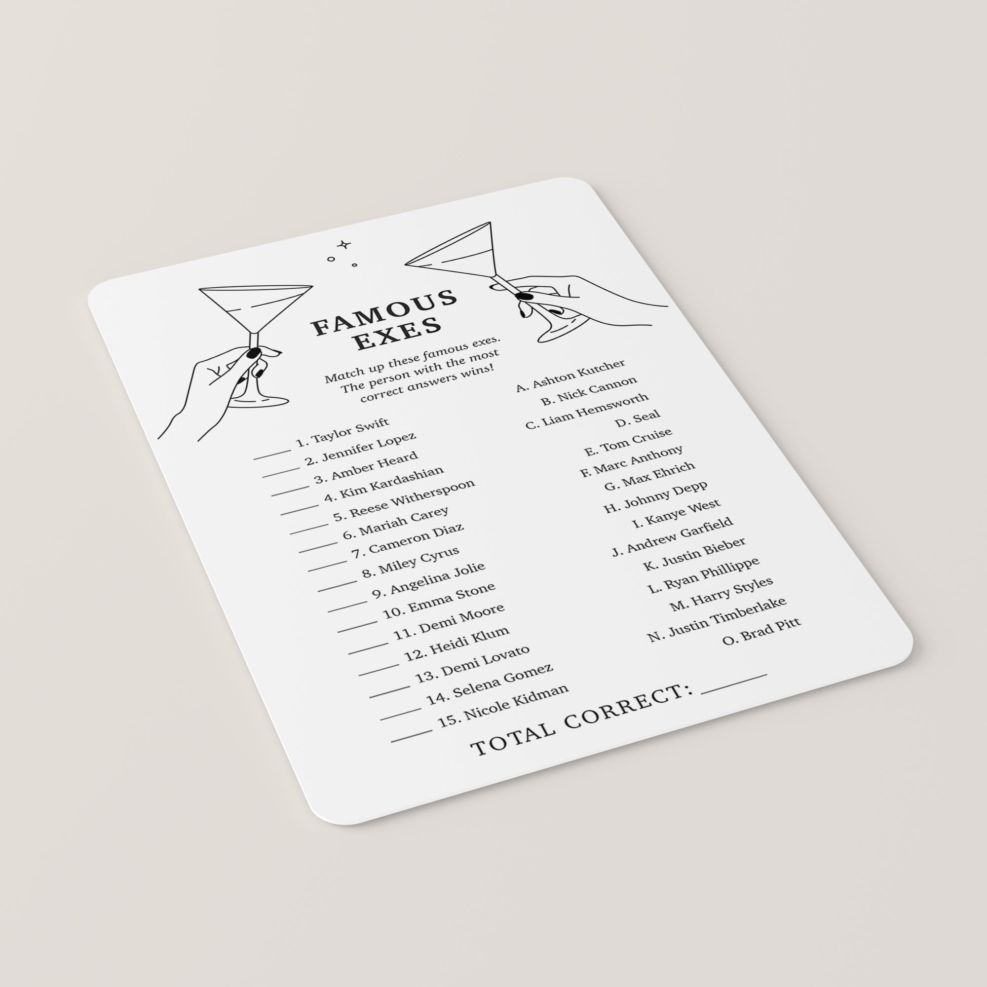 The game is very easy to play. Hand out this famous exes game to your guests. Have them match the celebrity exes. The person with the most correct answers wins. An answer key is included.