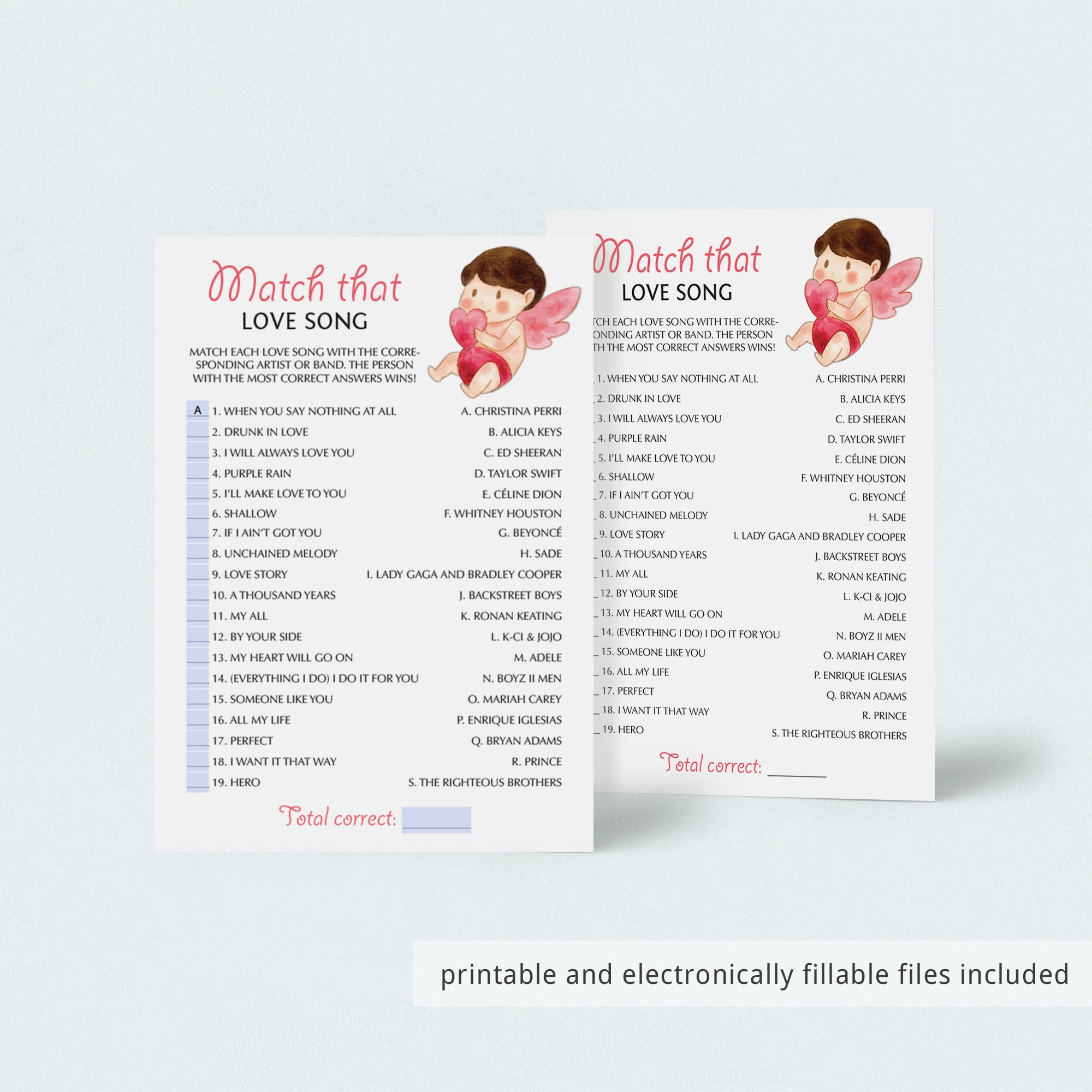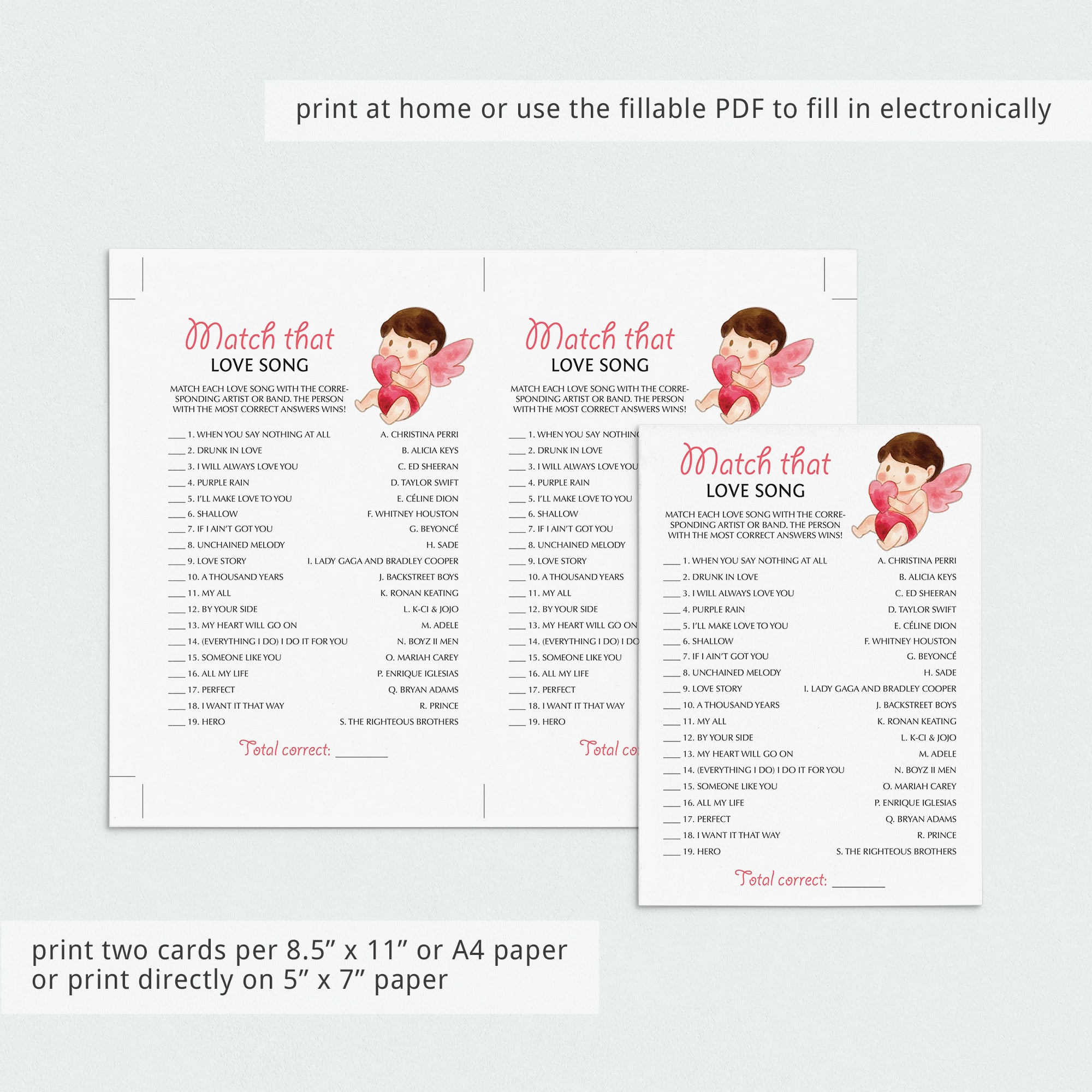 The game is very easy to play. Hand out or send this cute Match The Love Song game card with watercolor cupid to your guests. Have them match the 19 love song titles with the corresponding artist or band. The person with the most correct answers wins. A great idea for a prize for this love song game is a burned copy of the playlist. An answer key is included.
