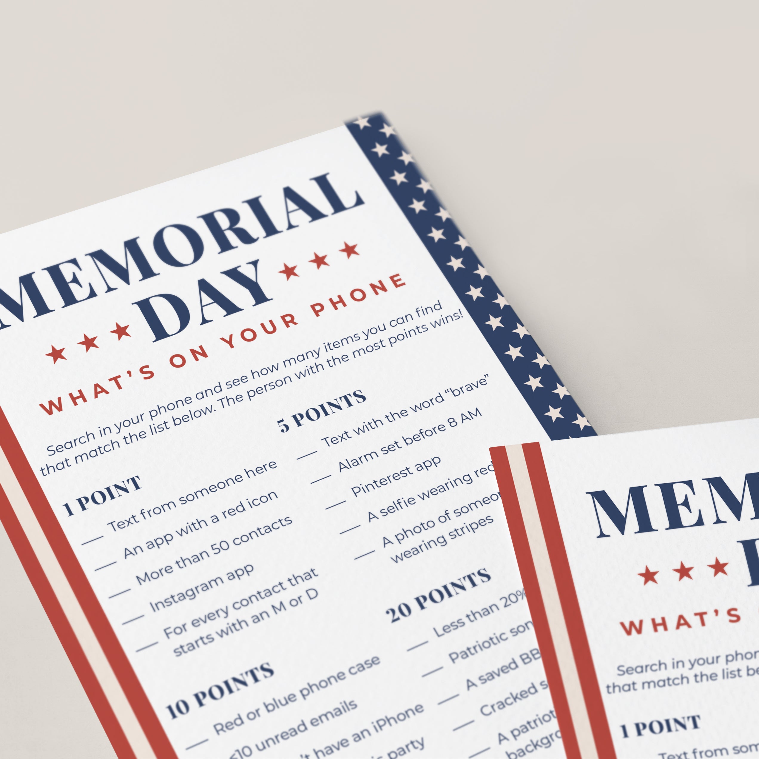 What’s On Your Phone is similar to the What’s In Your Purse game, but instead of searching for the items physically, your friends will just search for the listed items using their phone. They earn points for each item that they have in their phone. Things like having a red or blue phone case, a text with the word "brave" a Memorial Day event saved in their calender and much, much more. The person with the most points, wins!