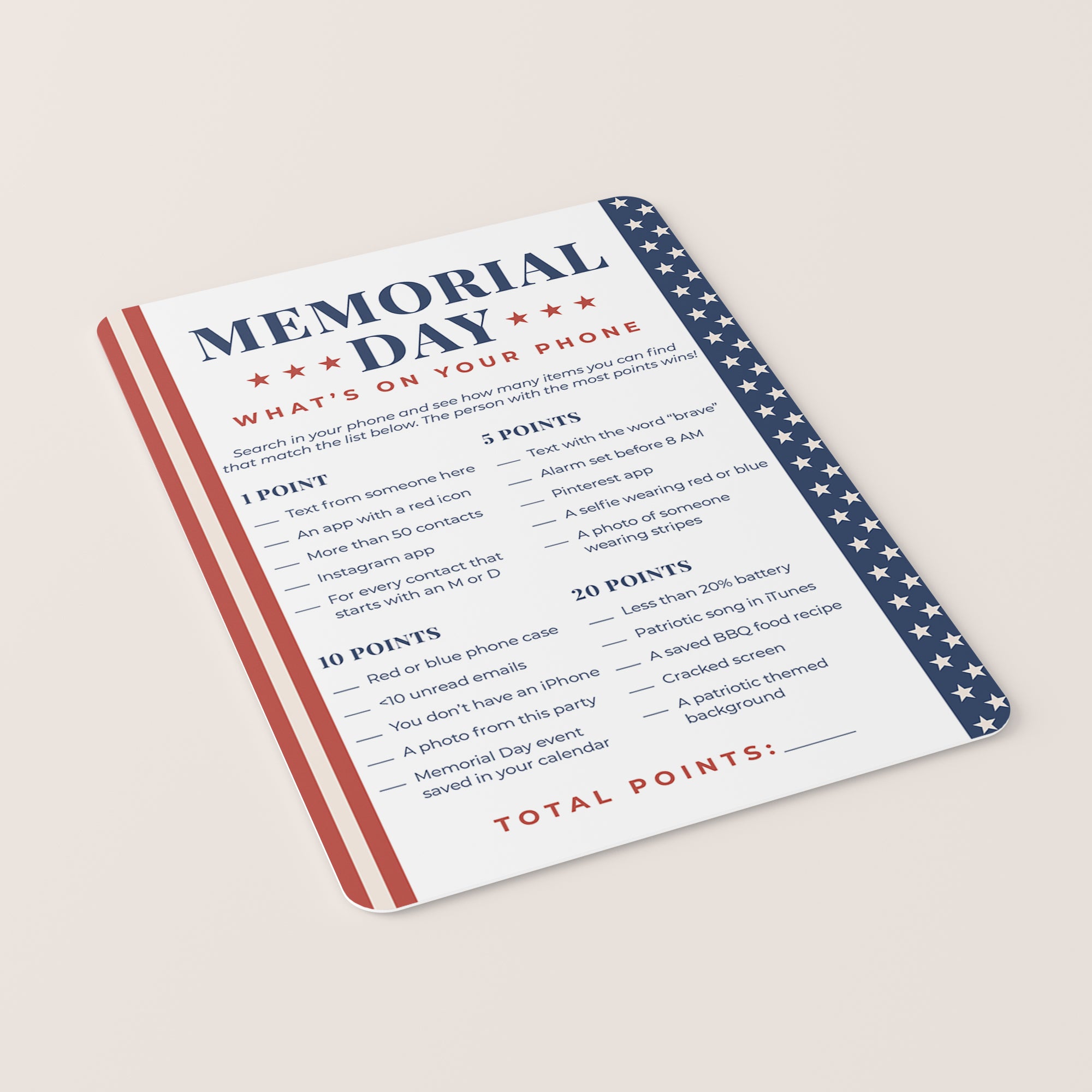 All guests need to play is a smartphone and one of these red and blue What's On Your Phone game cards with stars and stripes.