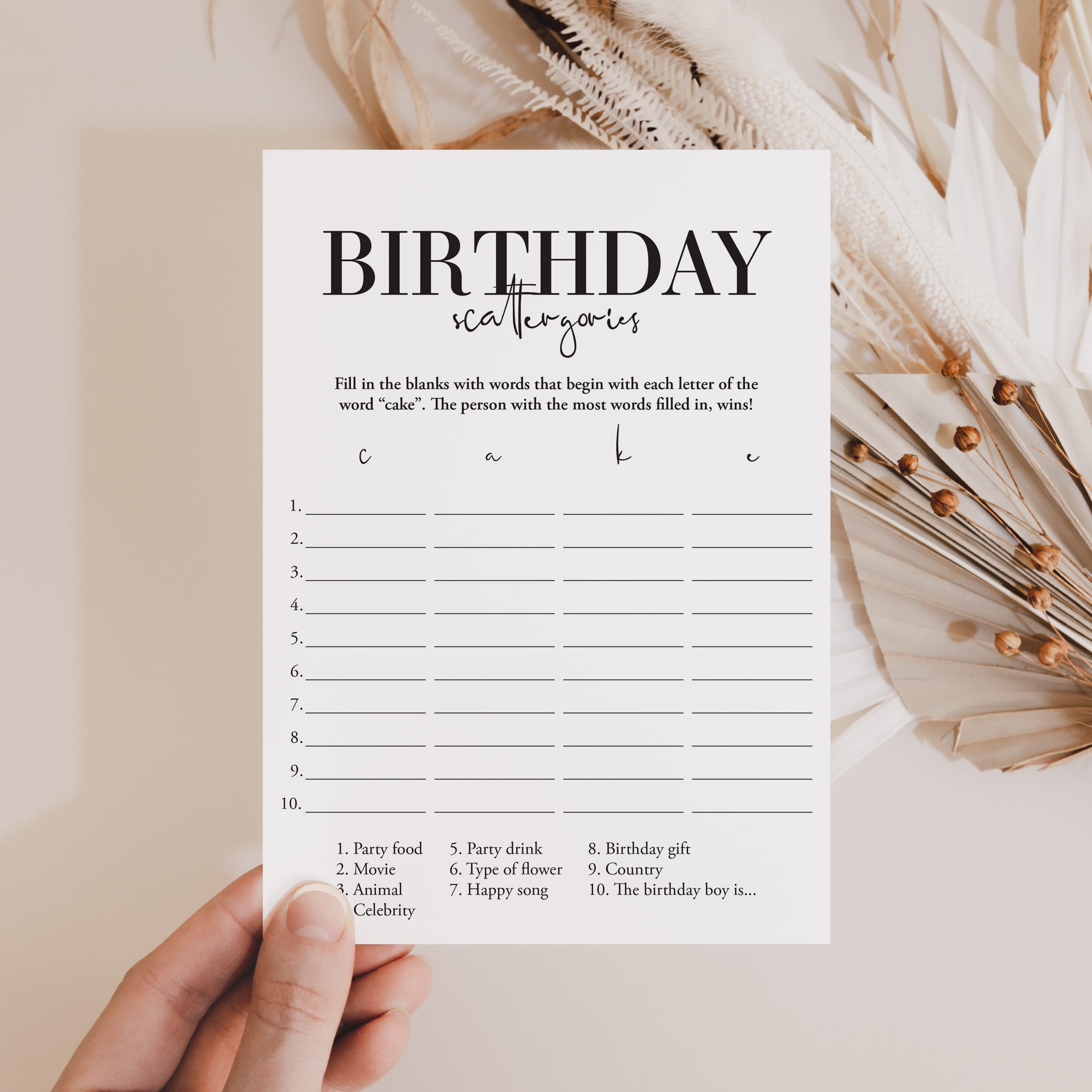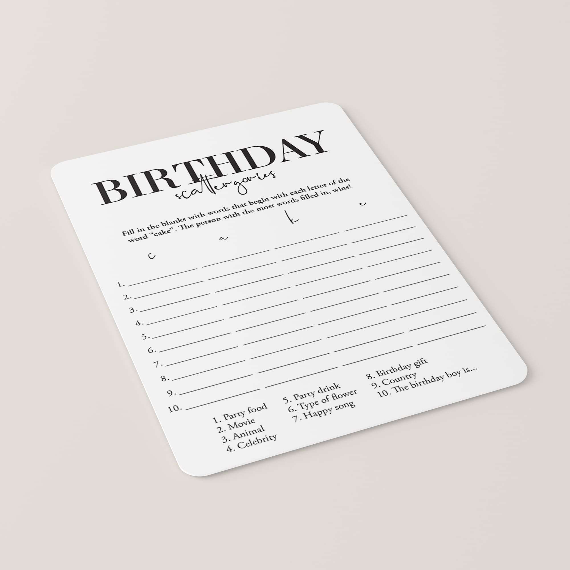 How to play the Birthday Scattergories game? Simply hand out a game sheet and a pen to your guests. They will have to come up with as many words related to the categories at the bottom of the sheet. The difficulty is that the words must begin with the letters in the word "CAKE". The person that gets the most answers filled in within the set time, wins!