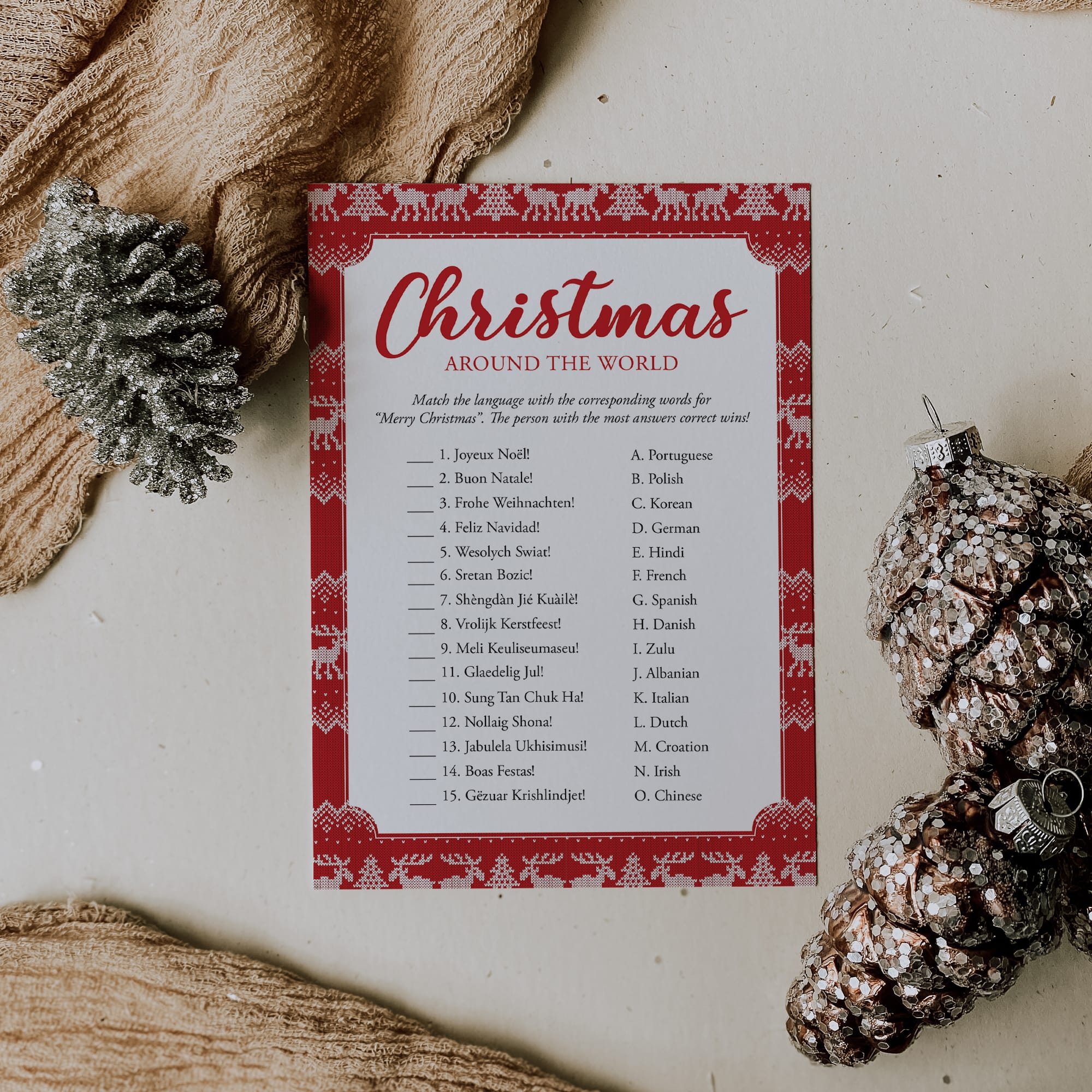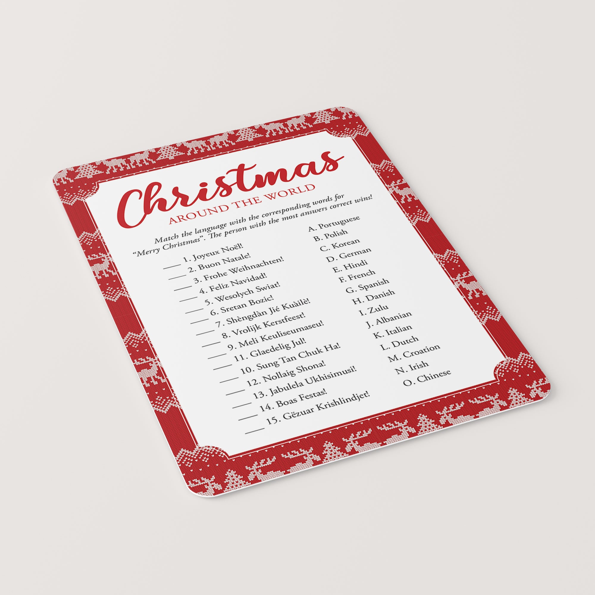 The game is very easy to play. Print and distribute these Christmas Around The World game cards and a pen to each of your guests. The have to match each version of the words “Merry Christmas” with its language of origin. The person with the most correct answers wins.