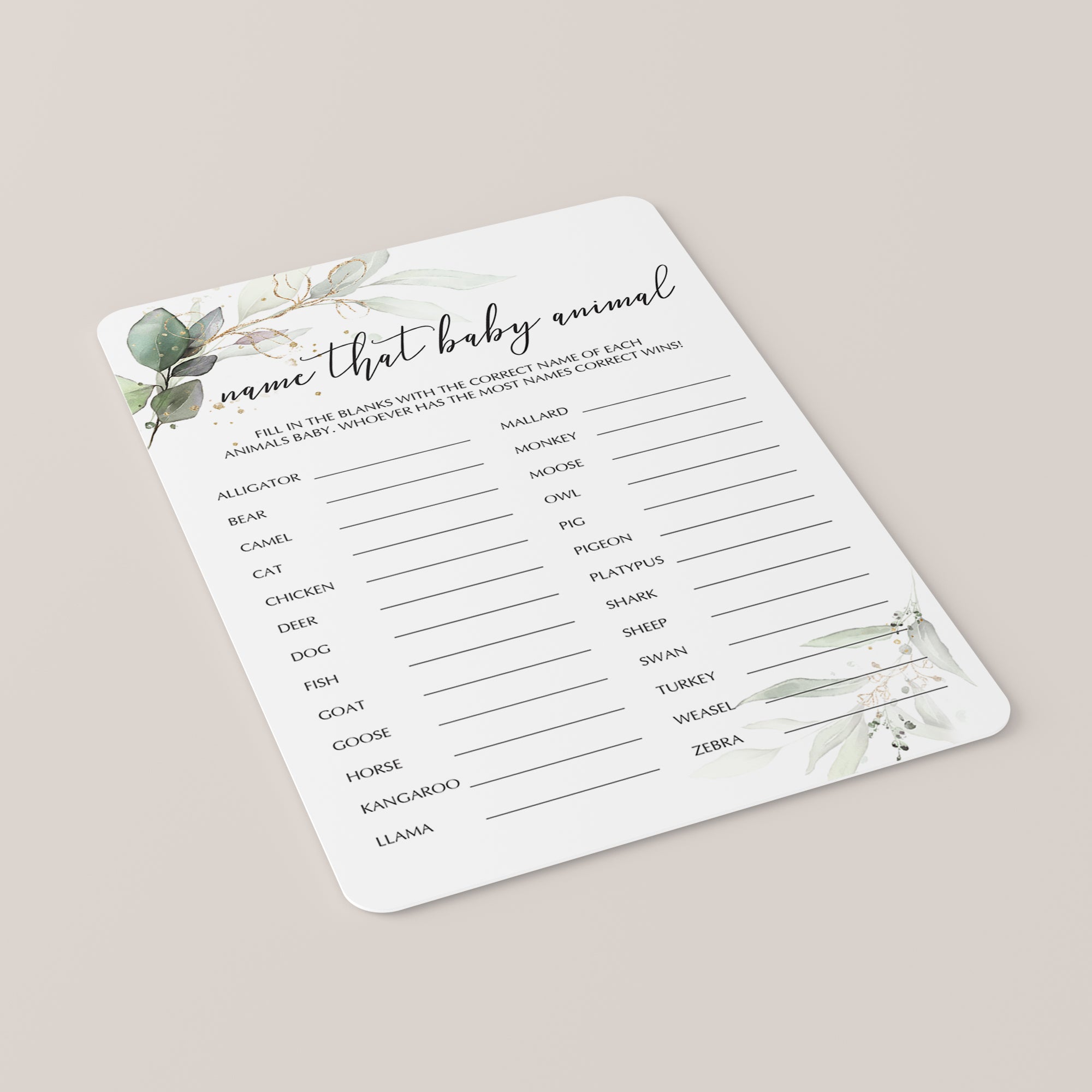 Did you know a baby shark is a “pup,” and a baby kangaroo is a “joey”? Test your baby shower guests how well they know the names of animals babies with this fun game. With its watercolor foliage and faux gold foil, this game is the perfect addition to your modern chic baby shower.