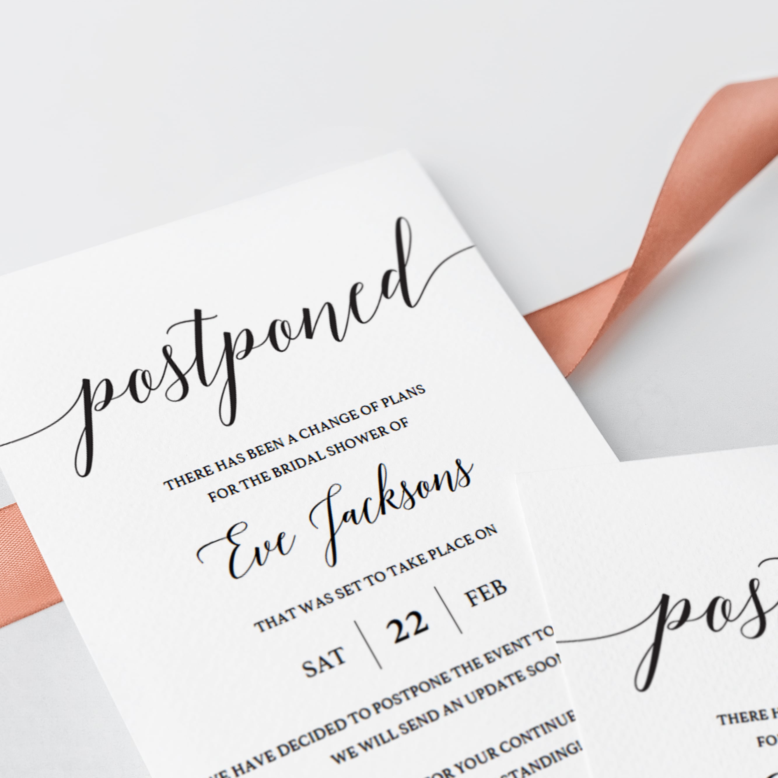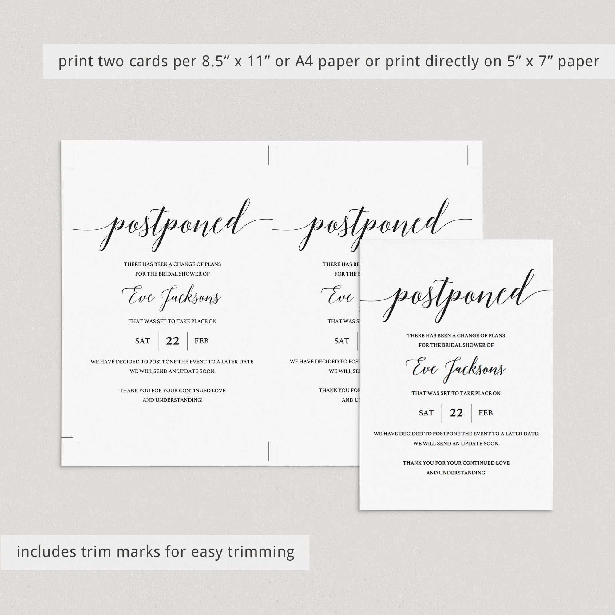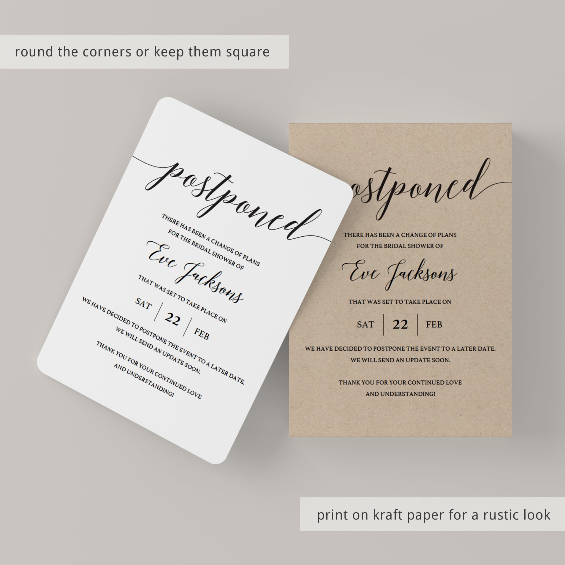 And if you don't want to print the cards yourself, have them printed at your favorite print shop or use the included digital postponed announcement template to inform your guests by email.