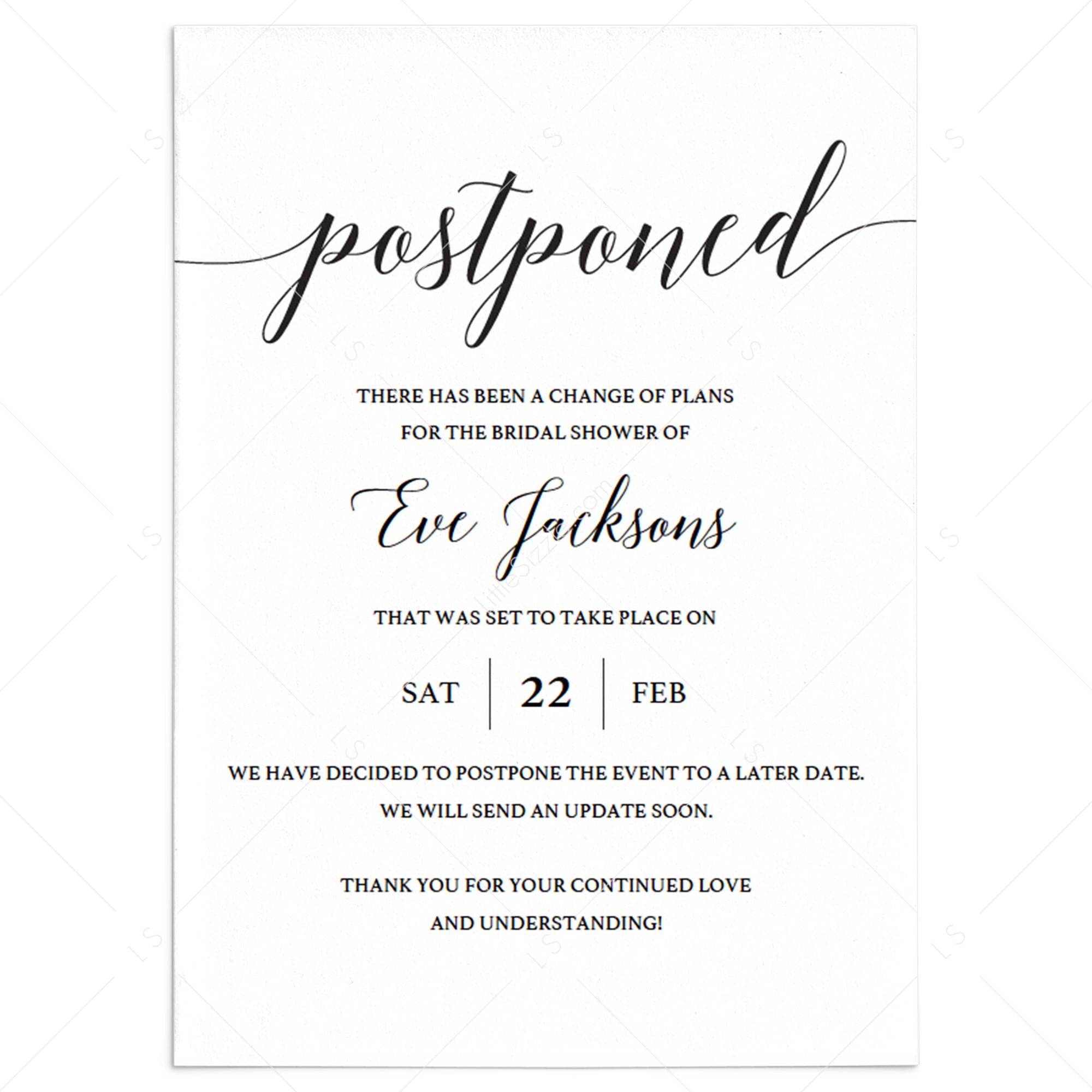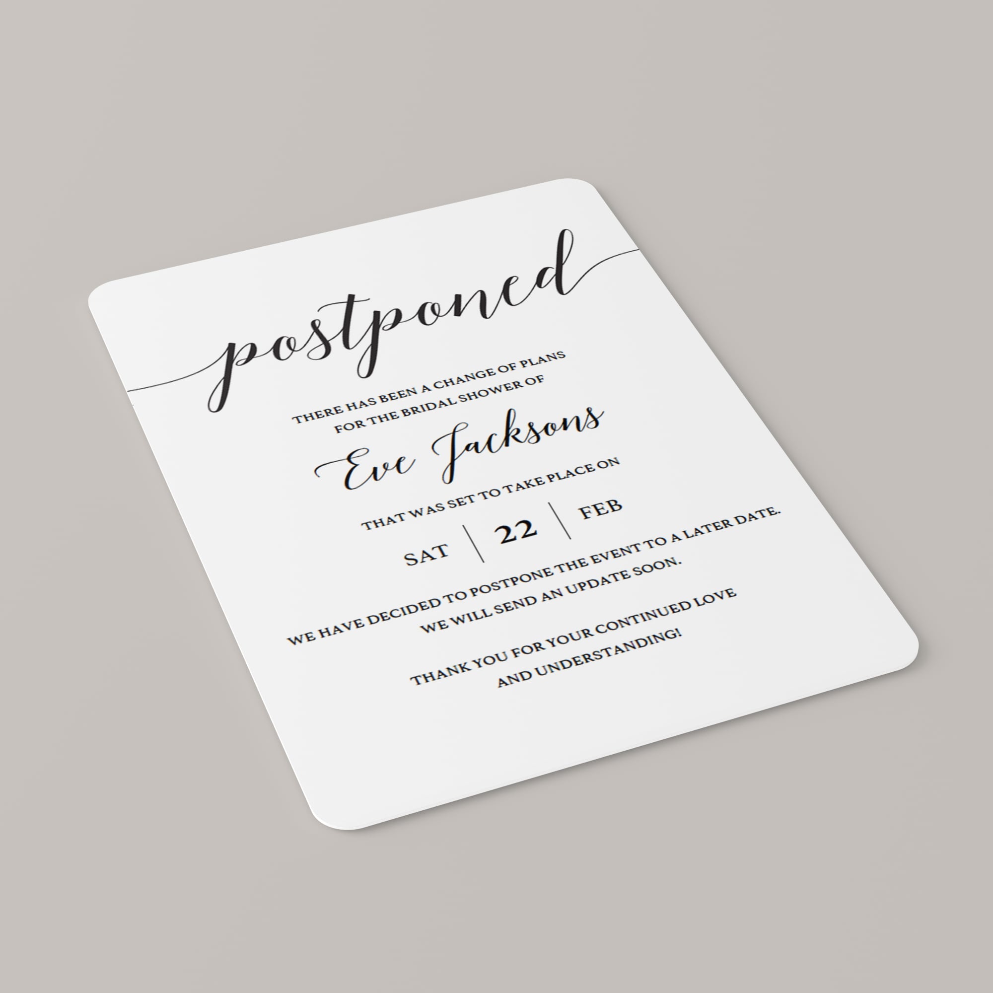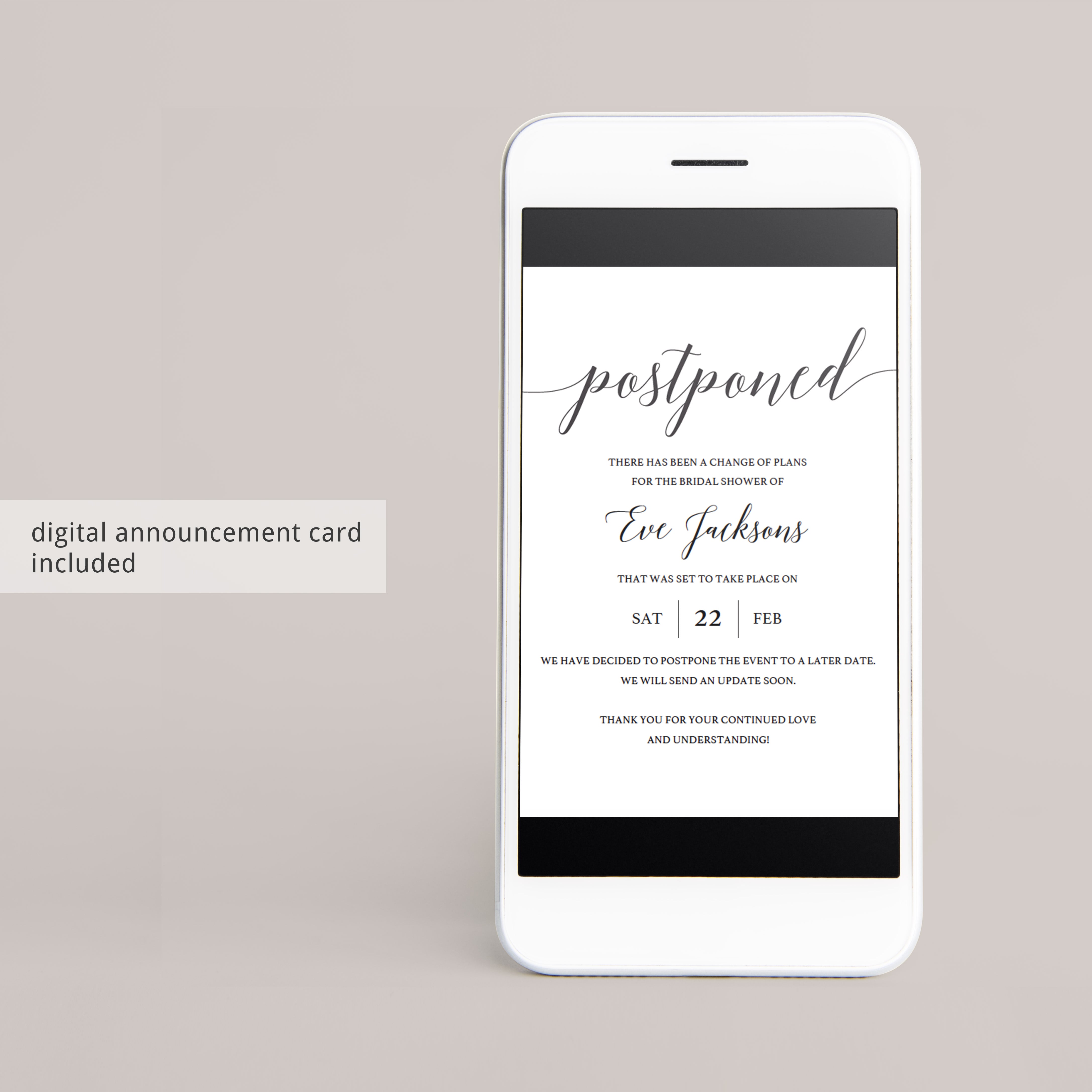 And if you don't want to print the cards yourself, have them printed at your favorite print shop or use the included digital postponed announcement template to inform your guests by email.