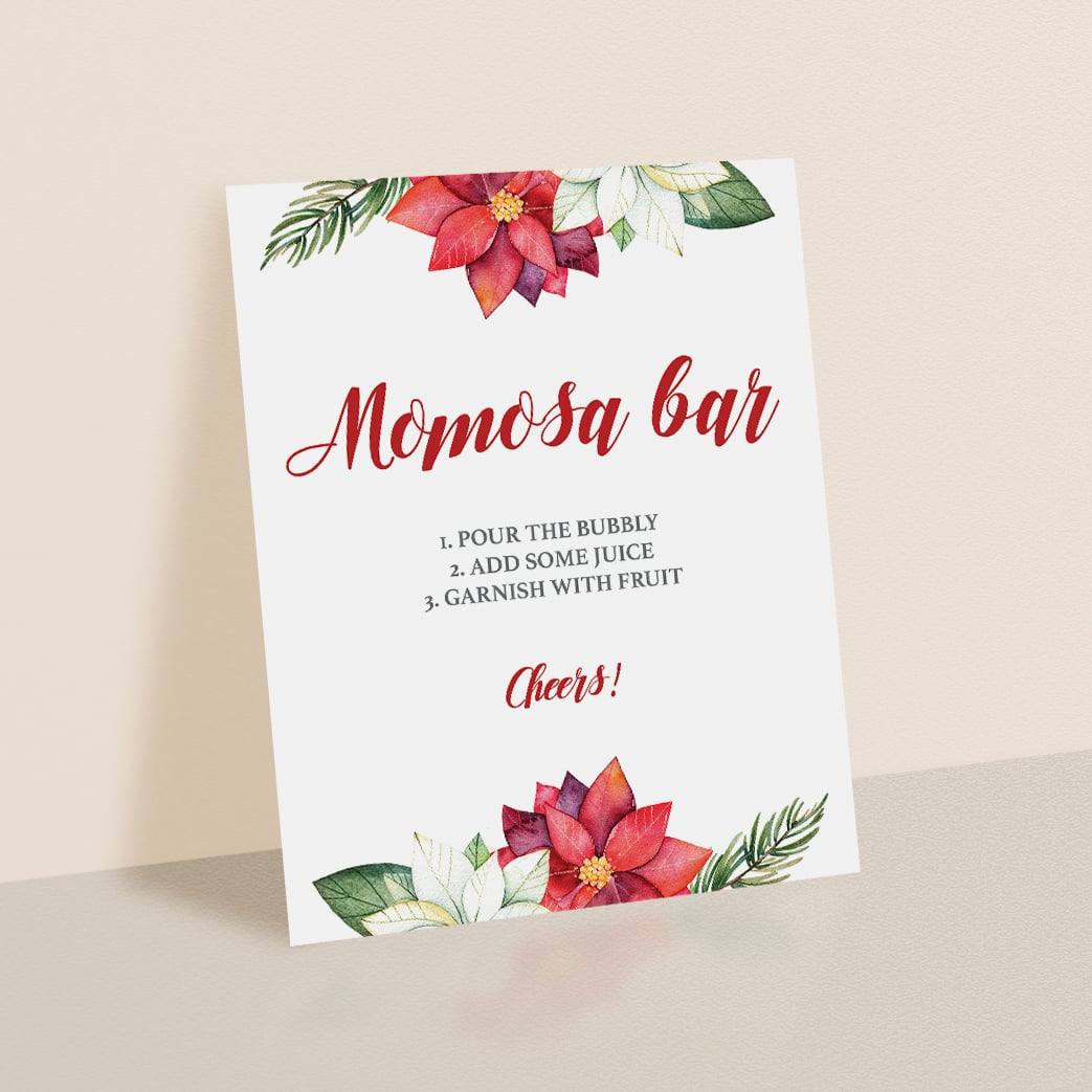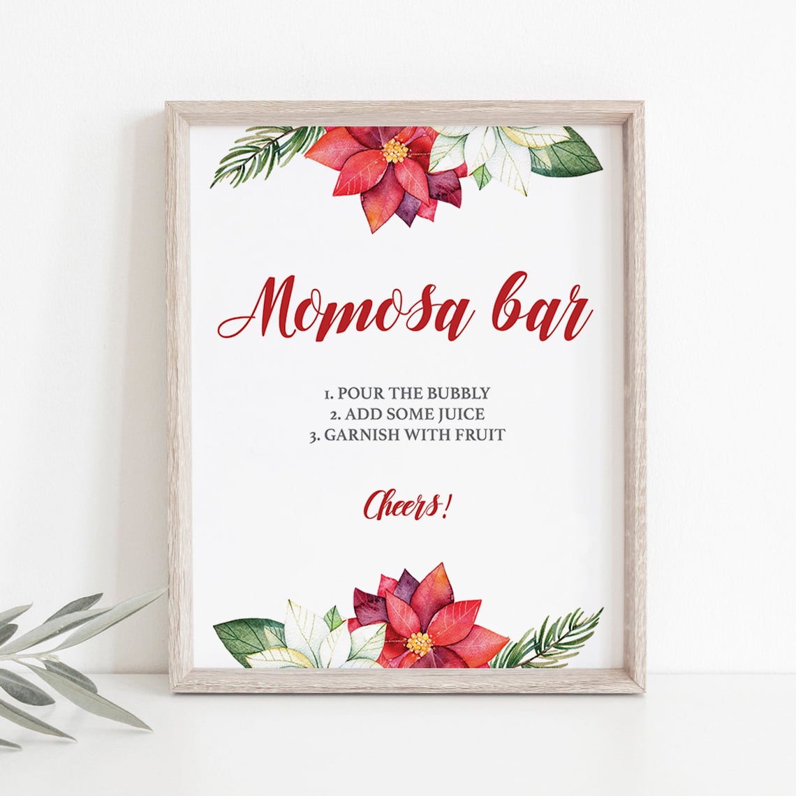 A Mimosa Bar (or as we'd like to call it, a MOM-osa Bar) will take your baby shower to the next level. Use this Christmas baby shower Momosa Bar sign with red and white flowers and green leaves to decorate your Mimosa Bar Table and help guests know how to prepare their drinks. The sign will ensure that you have those special winter vibes at your party.