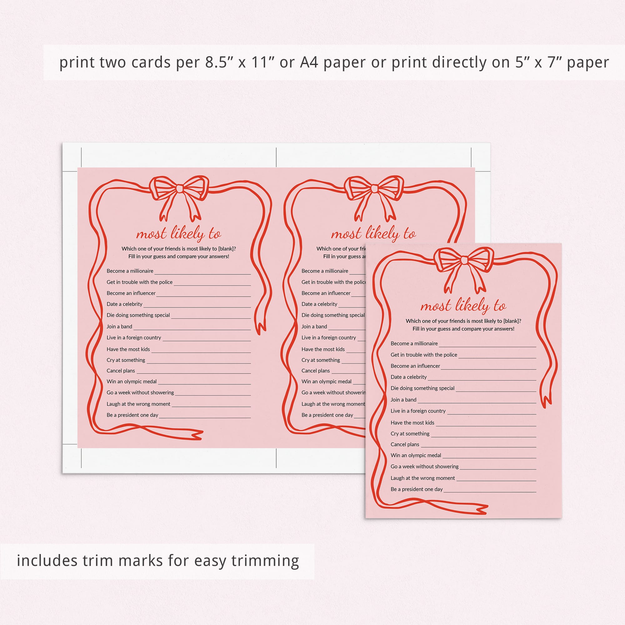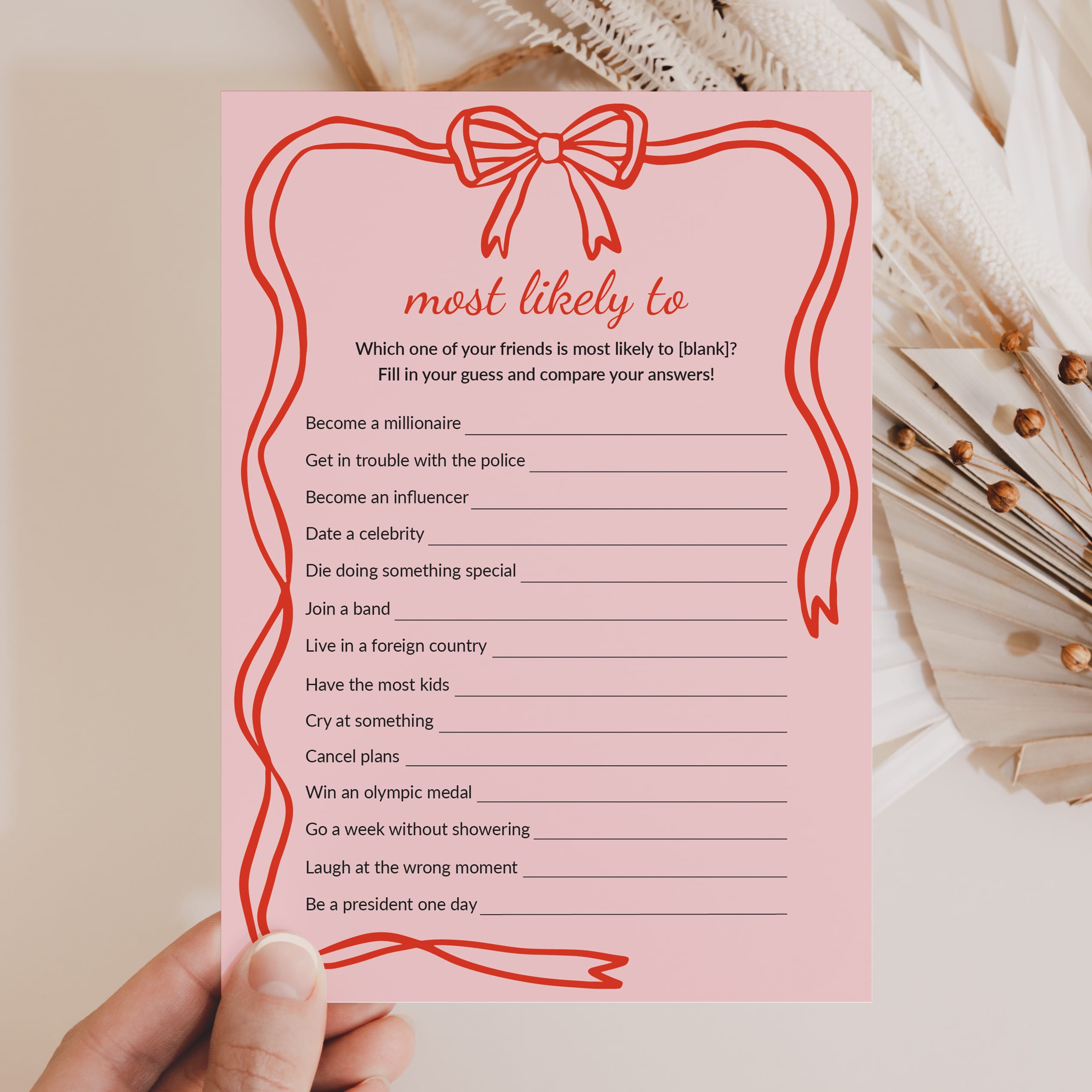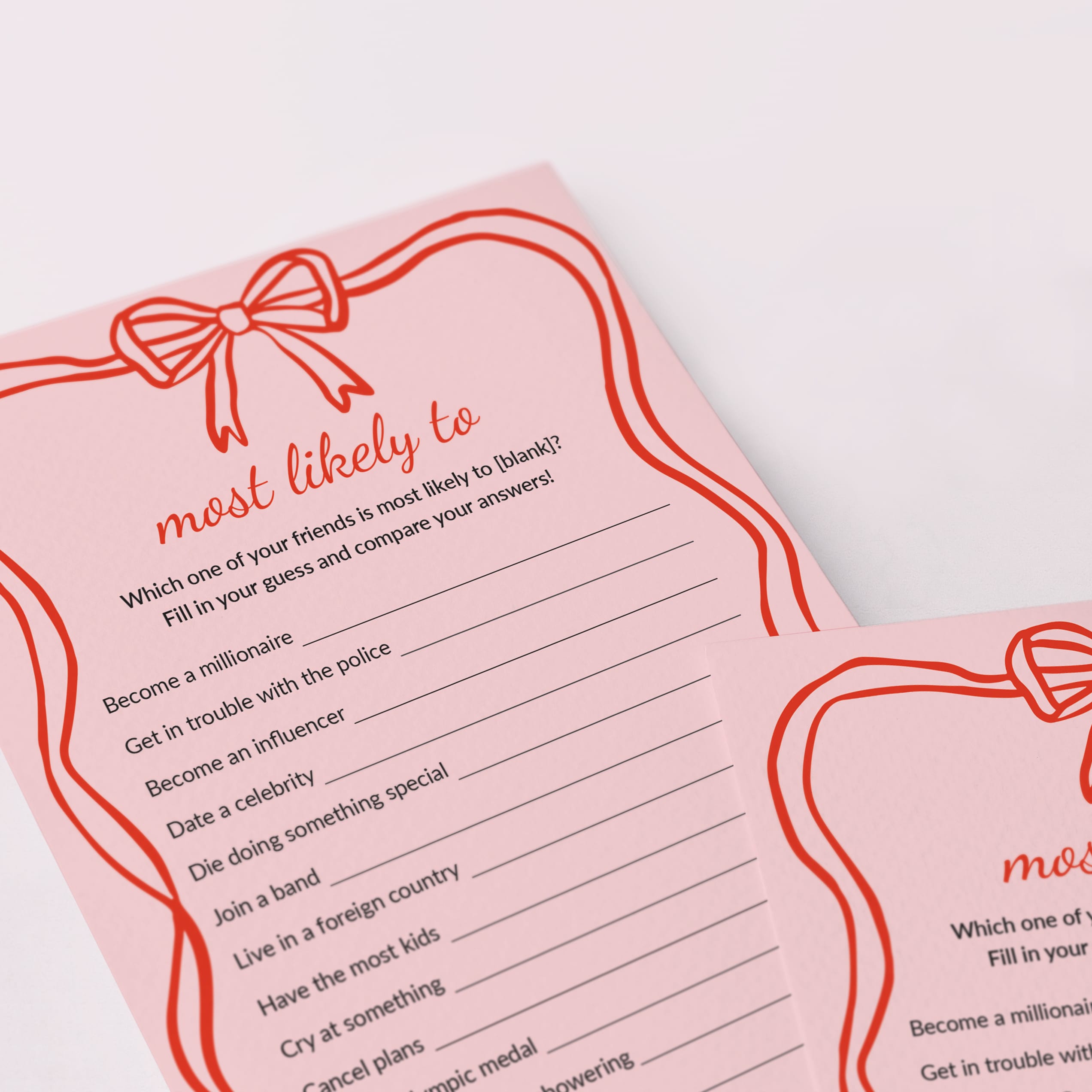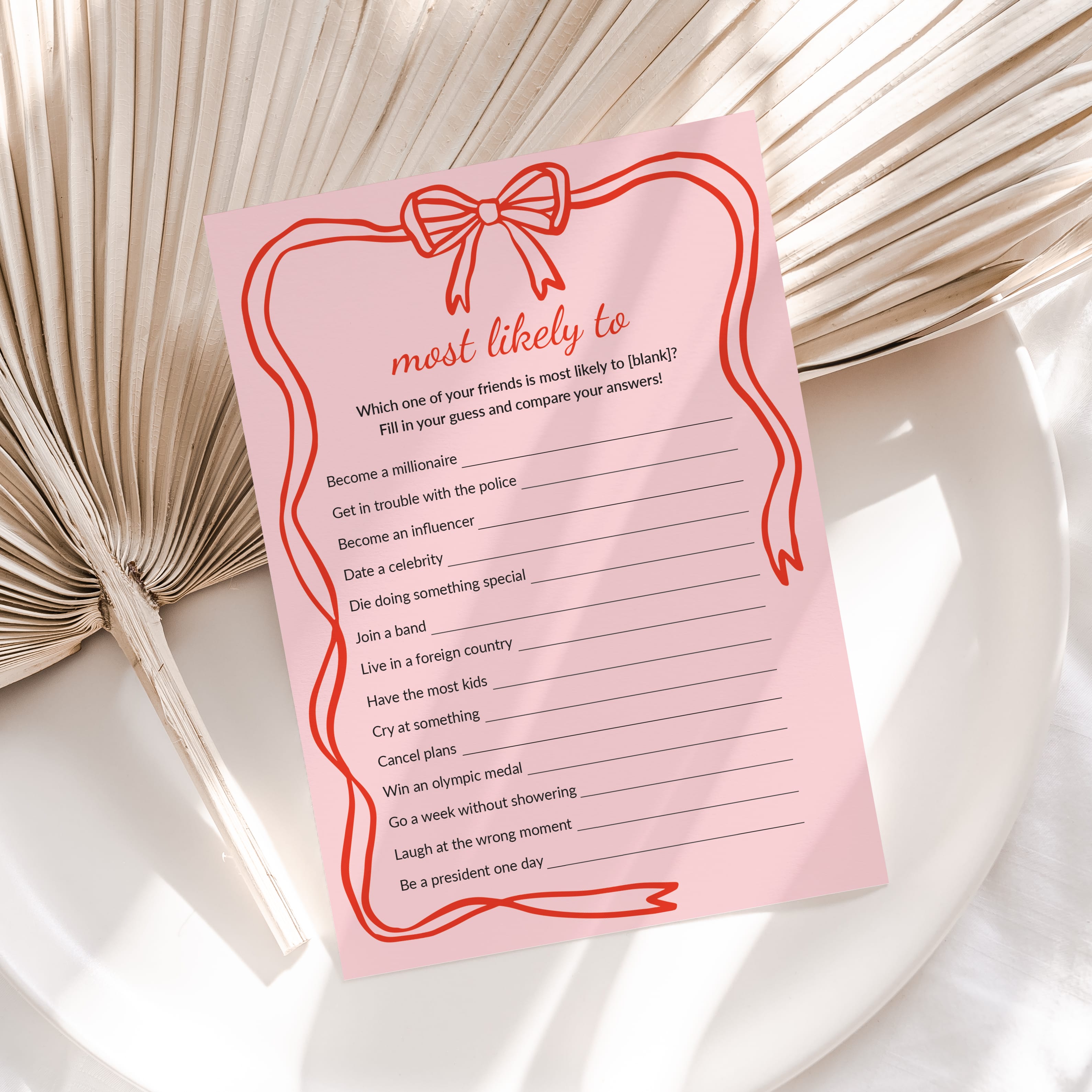 Are you looking for a fun icebreaker game and great conversation starter for your next girls party? Play Who Is Most Likely To. This game, featuring a playful pink background, red text, and a cute wavy ribbon border topped with a bow, has 19 Most Likely To questions that will get everyone talking and laughing. You will get to know your friends at some new level.