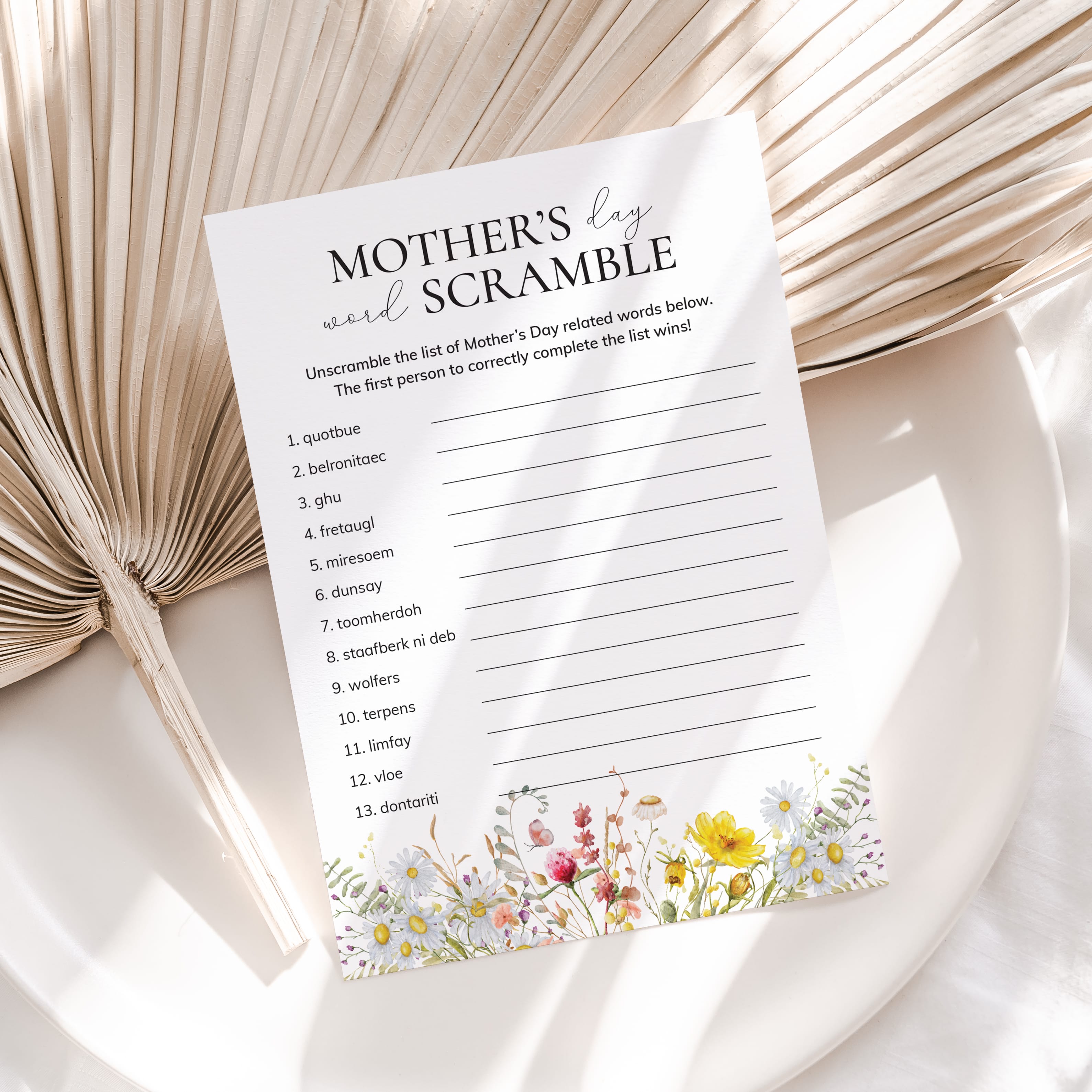 Are you looking for fun Mother's Day game? Play Mothers Day Word Scramble with this gorgeous game card with watercolor wildflowers. This Mother's Day game is fun for all ages.