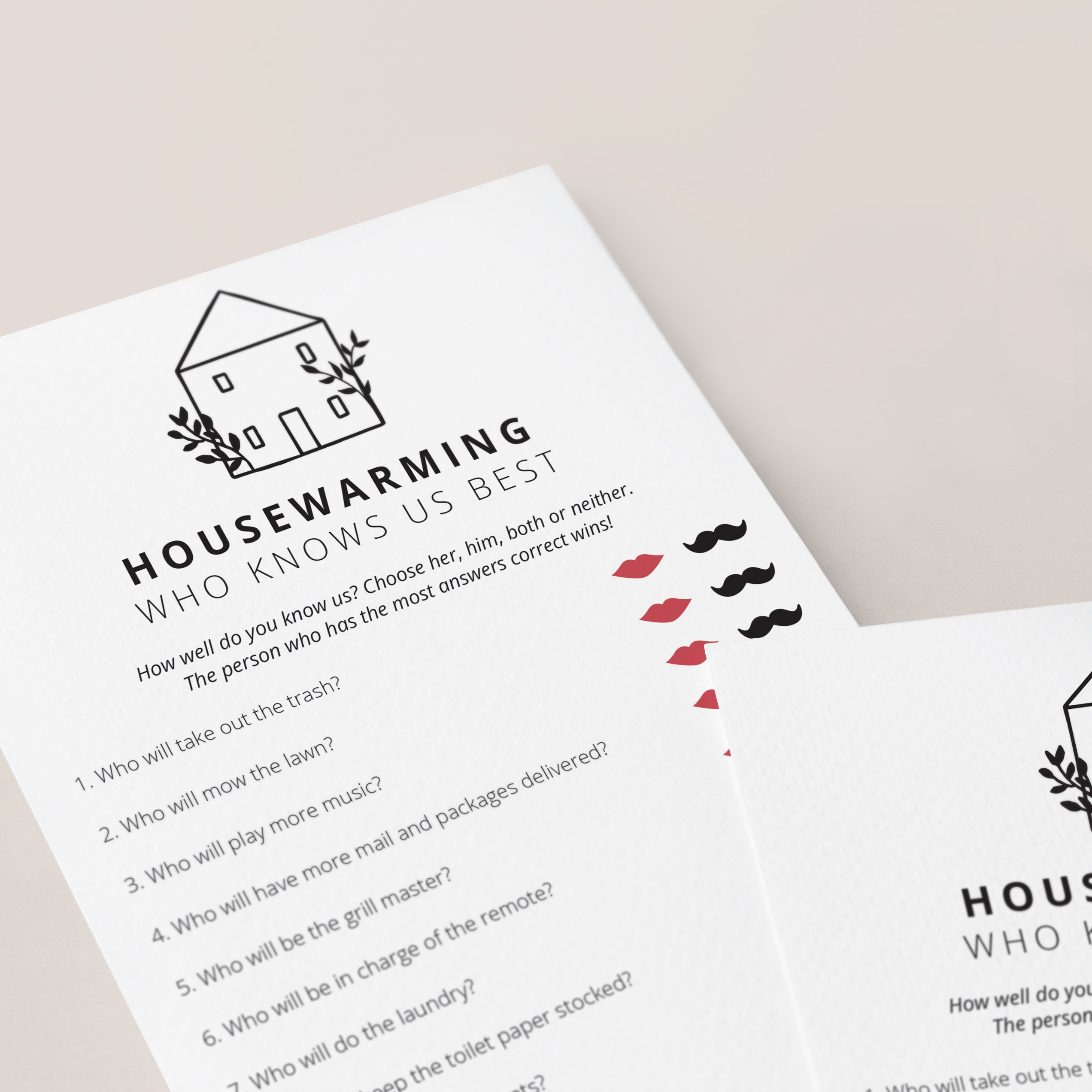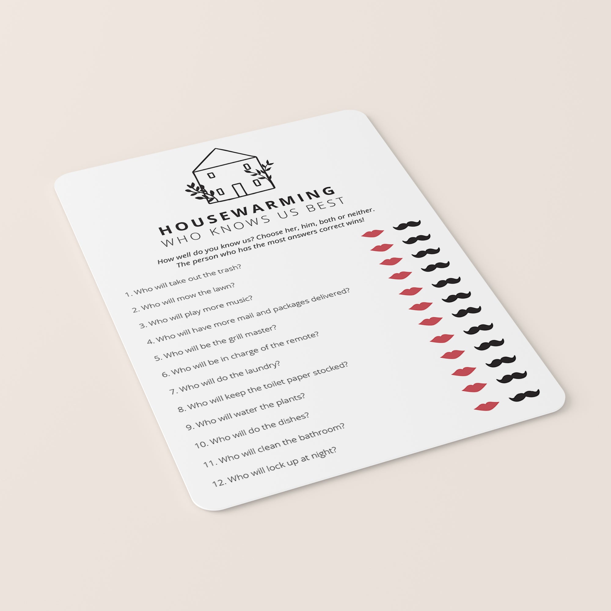 Add some fun to your Moving In Together Housewarming Party with this Who Knows Us Best quiz. This modern minimalist game card will fit any Housewarming Party theme.