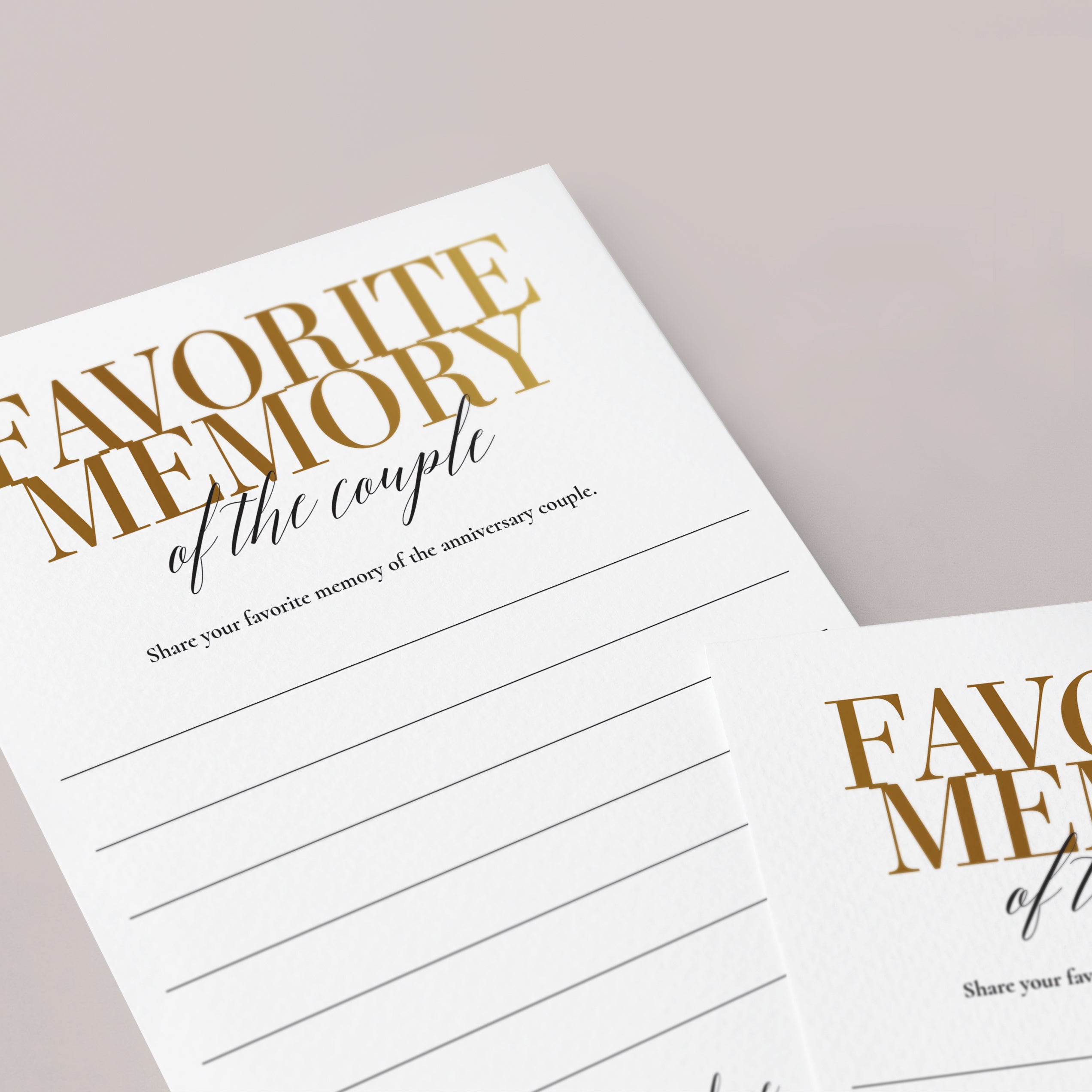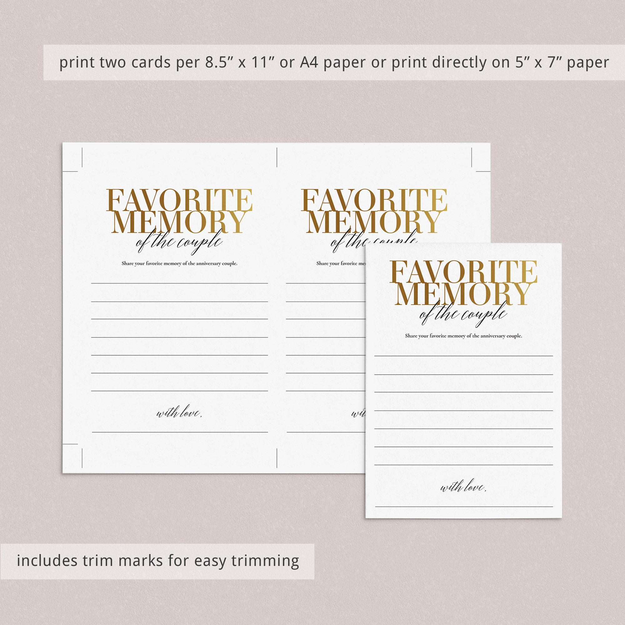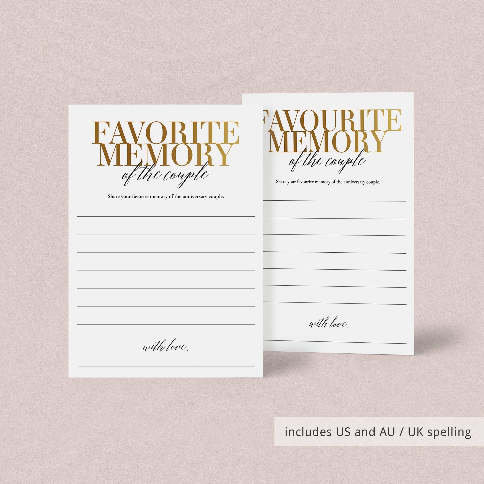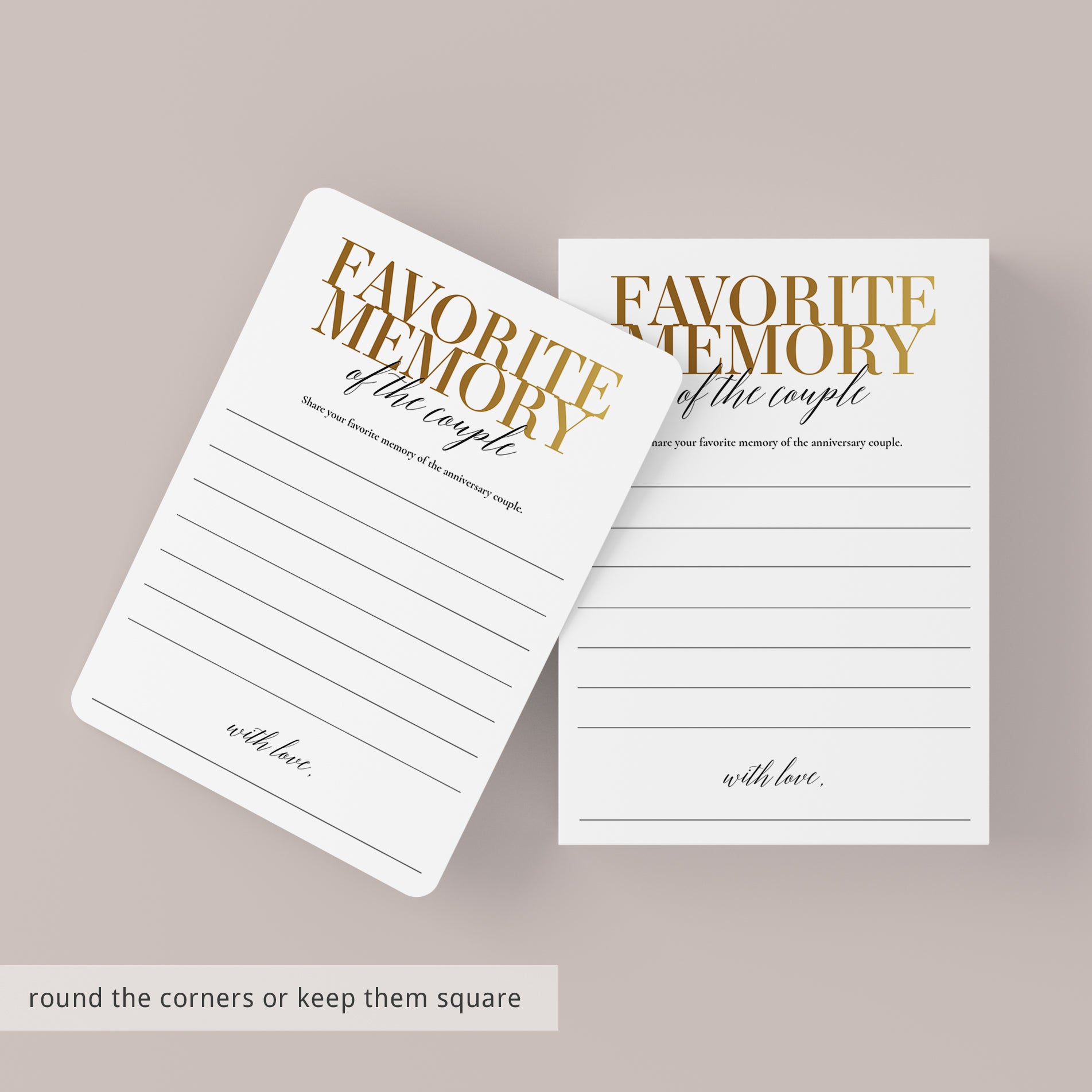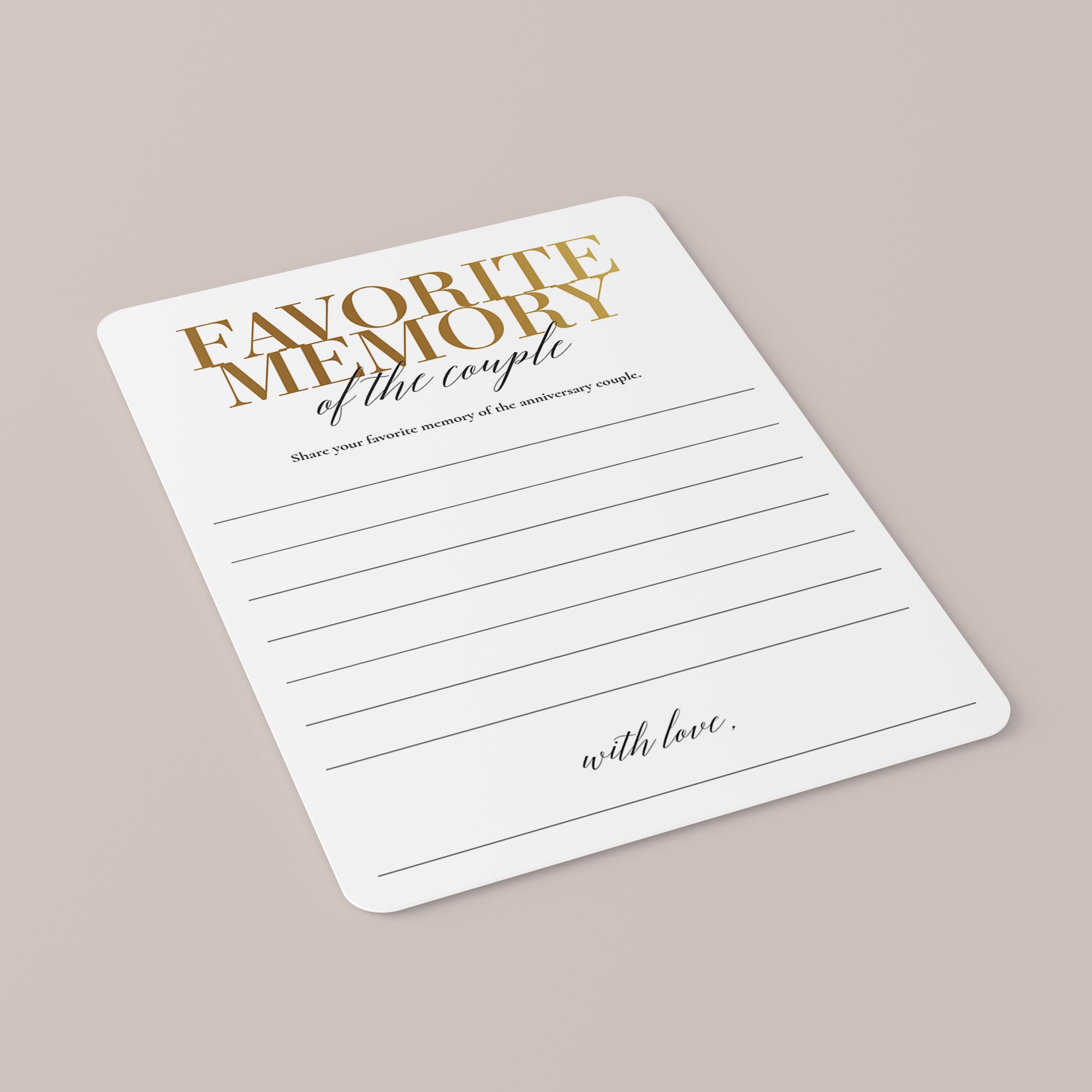 Are you looking for a memorable keepsake for a 50th anniversary? Have your guests share their Favorite Memory of the anniversary couple with these gold wedding anniversary cards. It's the perfect addition to your anniversary party and sure to be a hit!