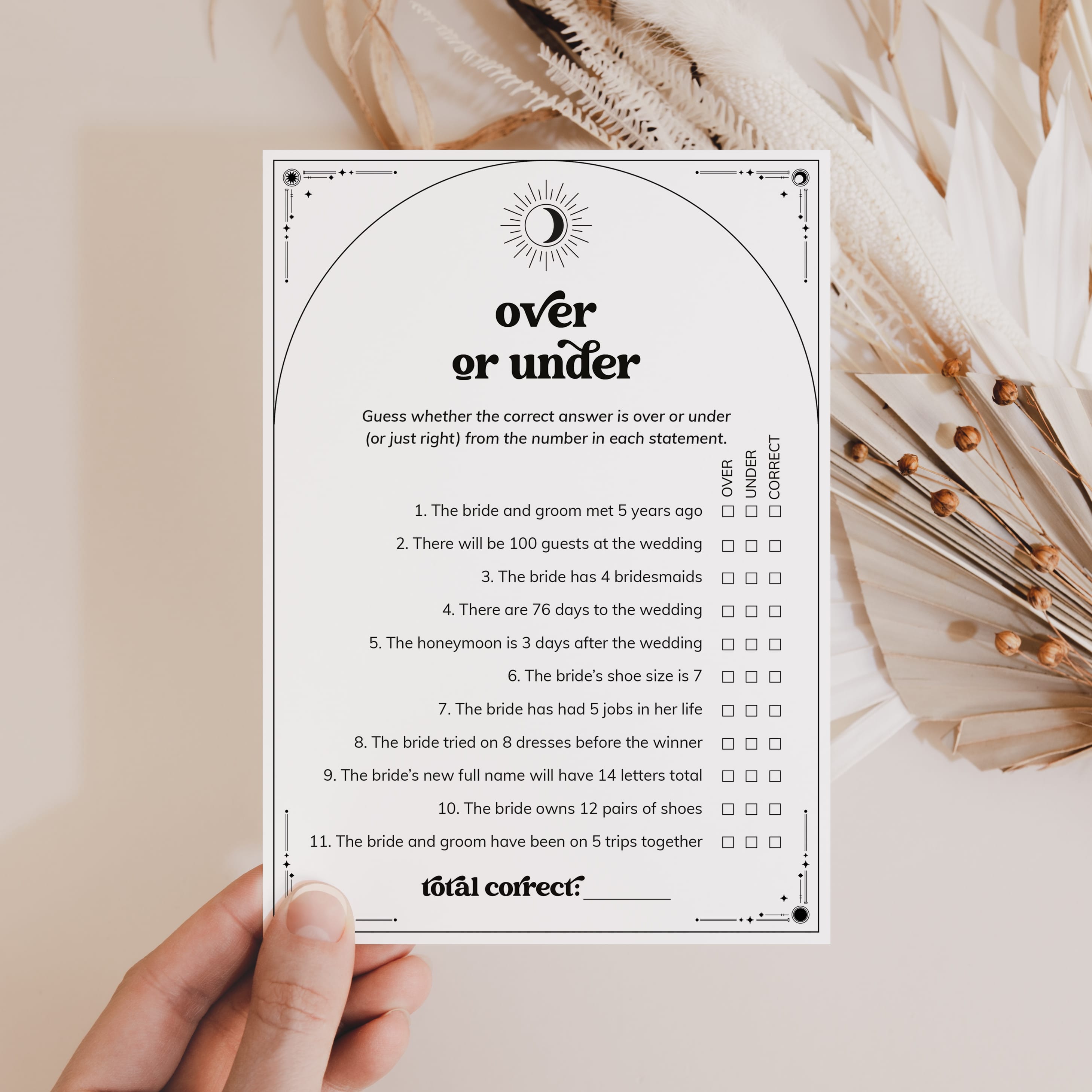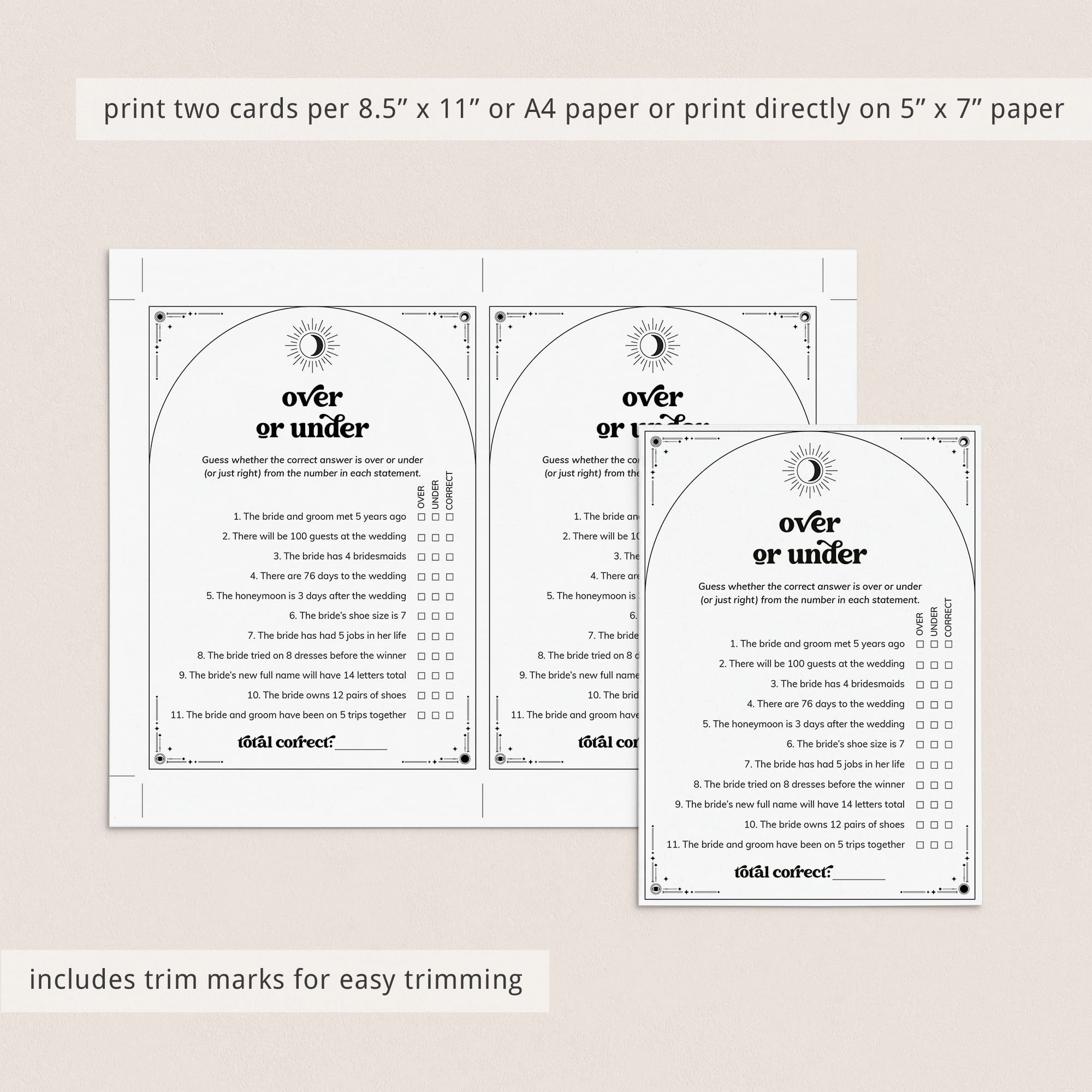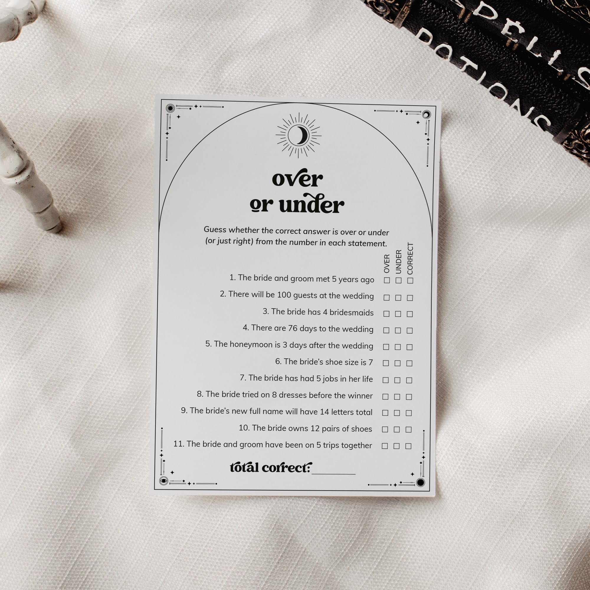 Are you good with numbers and dates? Find out with this Mystical Bridal Shower Over or Under game. The game is perfect for a celestial theme wedding or Halloween bridal shower.