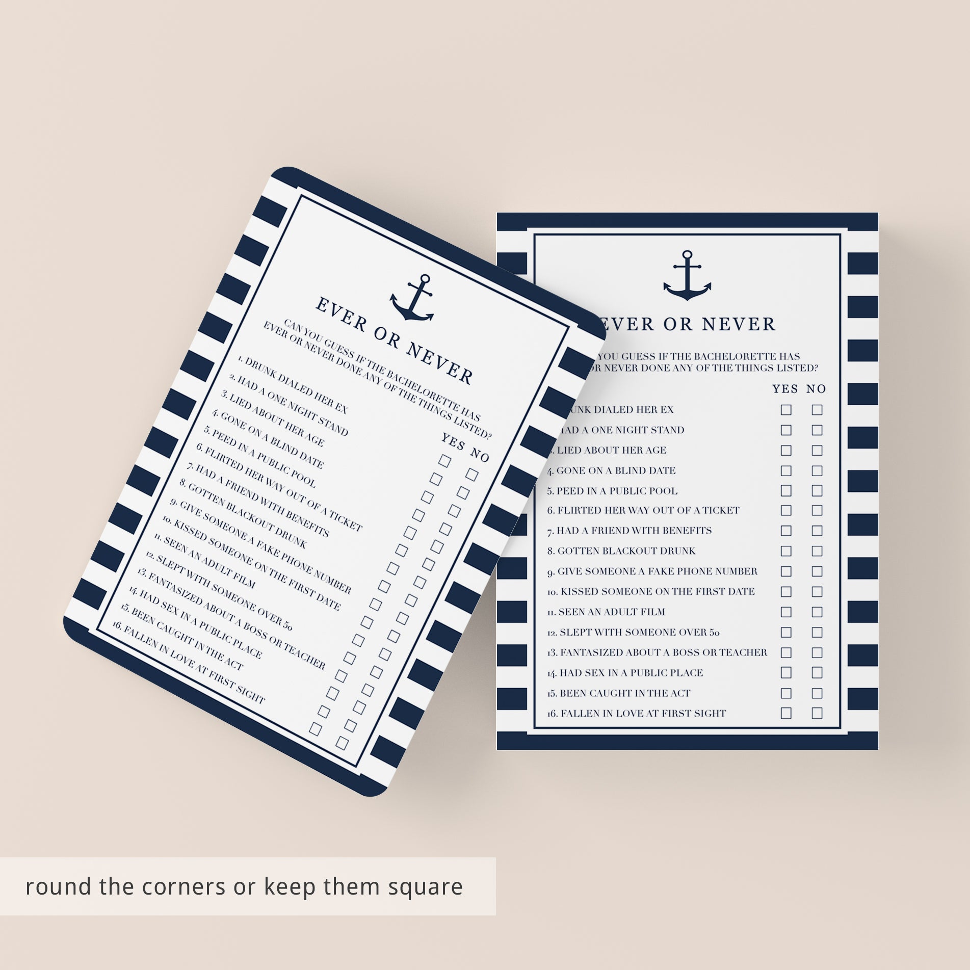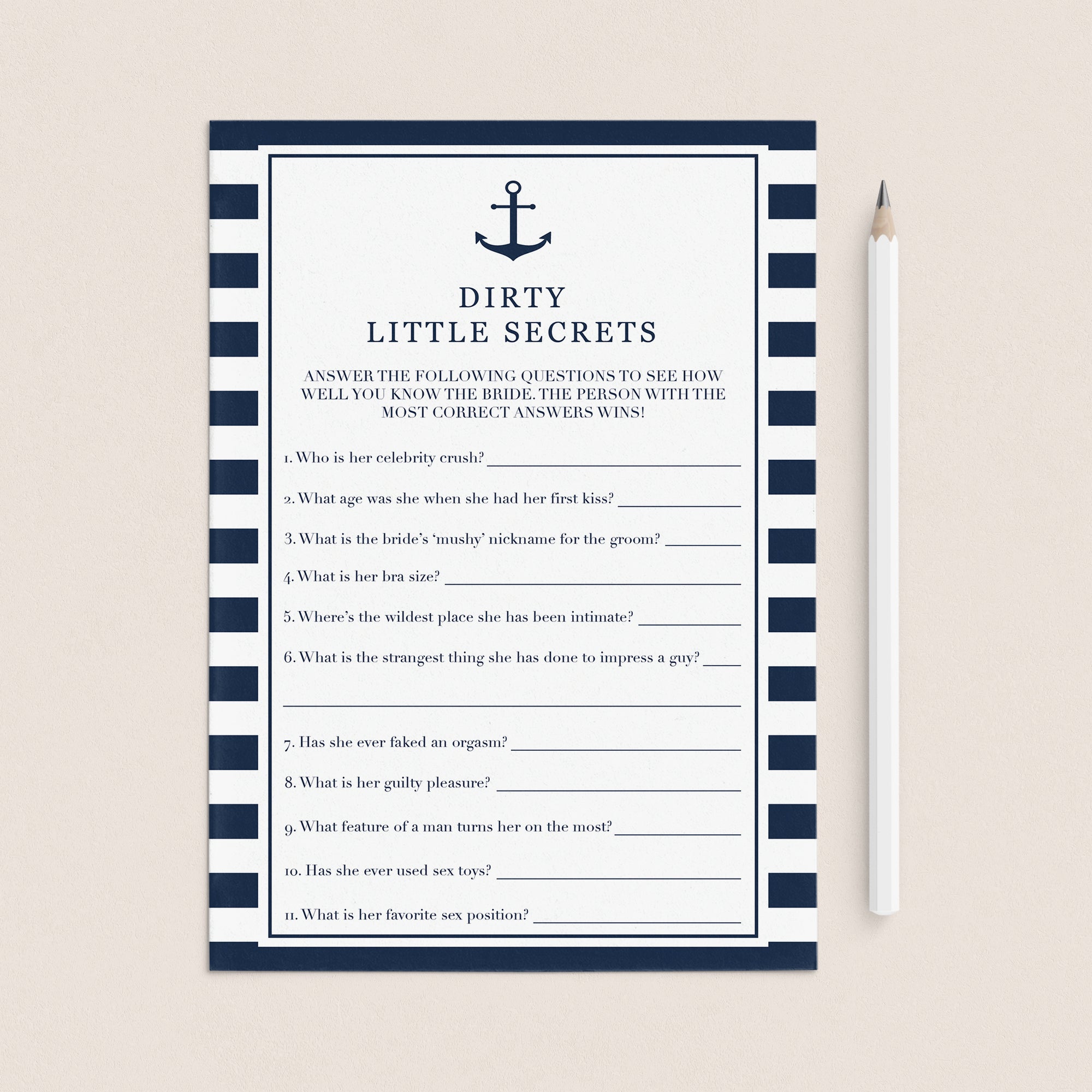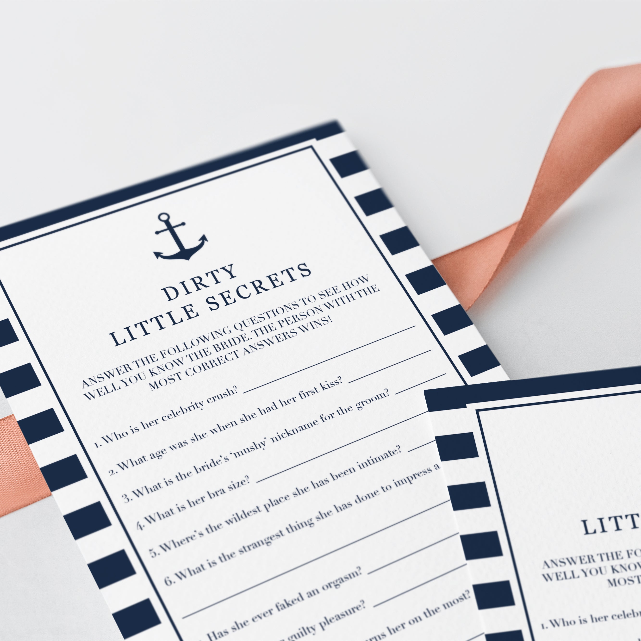 Let's get nauti! Kick off the fun at your nautical bachelorette party with this navy and white bachelorette games pack with 4 naughty games. The nautical theme games are the perfect addition to your summer hen party or beach/lake bachelorette weekend.