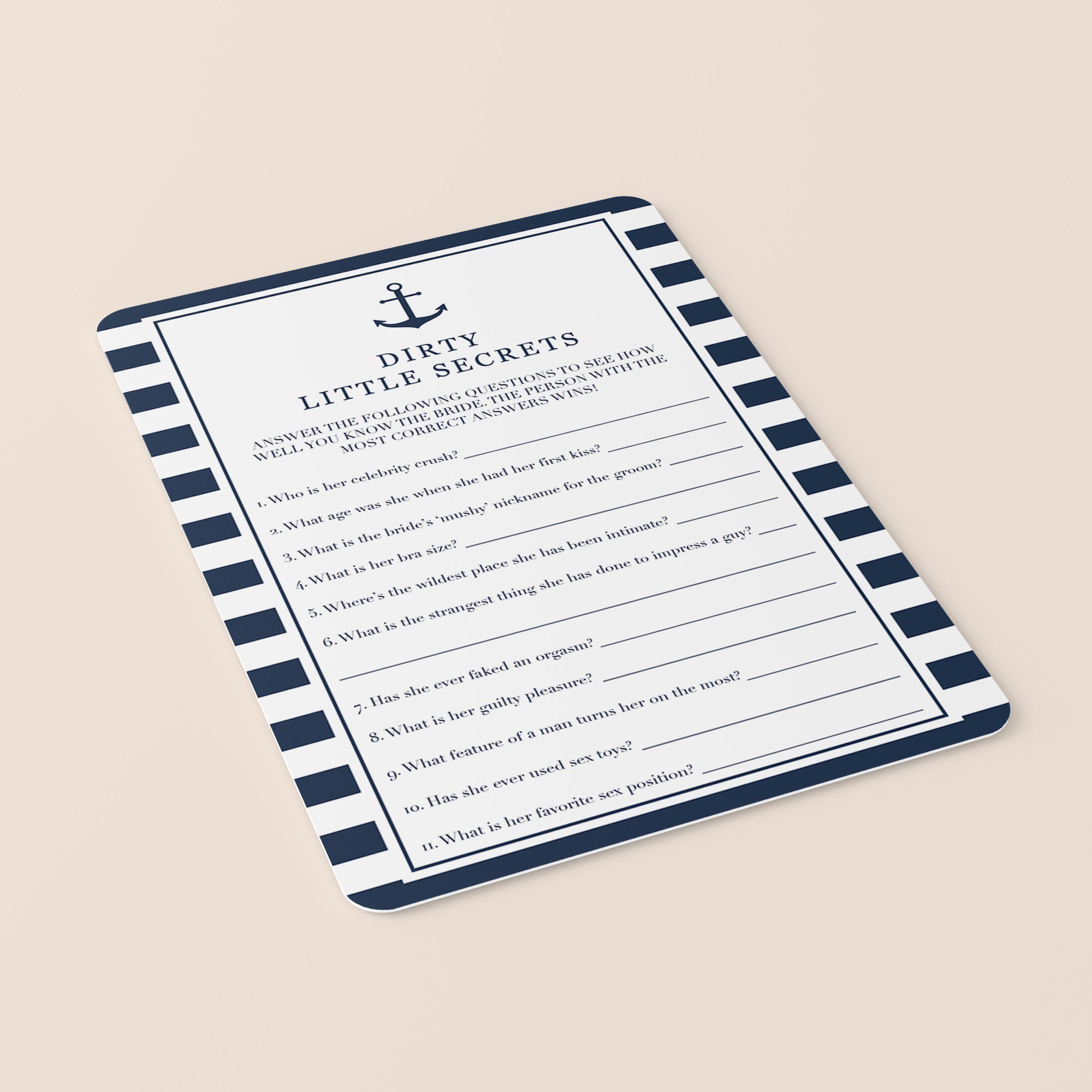 How well do you really know the bride? Test your hen party guests on who knows the bride best with this nautical theme Dirty Little Secrets game. The questions reveal a saucier side to the bride you might not recognize! It is a hilarious addition to your Nauti Hen Party, Beach Bachelorette Weekend or Nautical Bridal Shower. You'll have your girls laughing in no time.