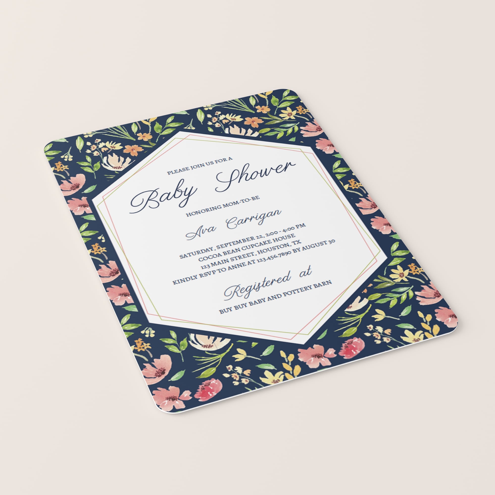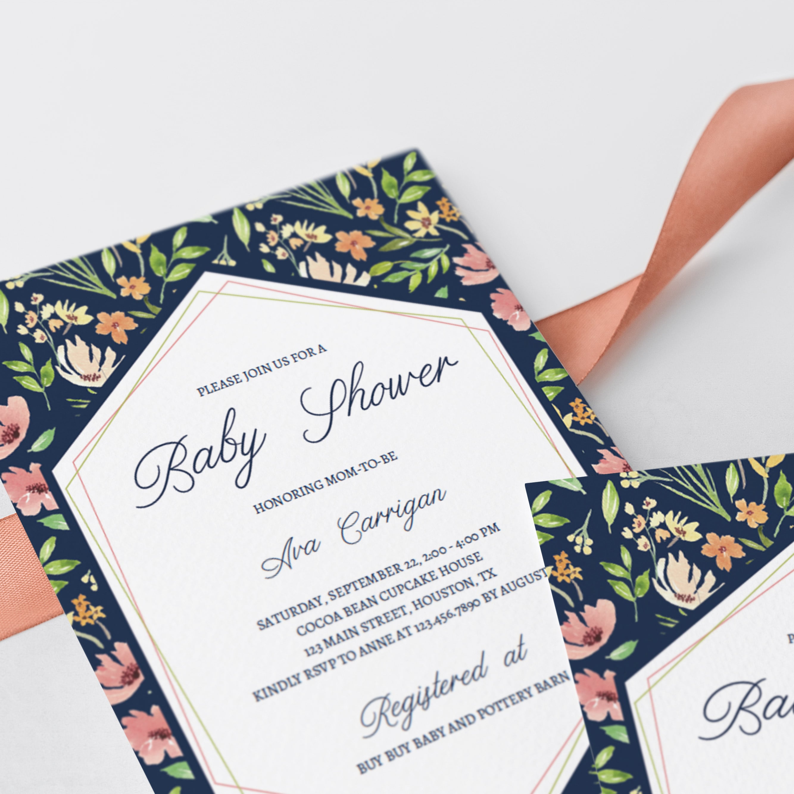 Treat the mom-to-be on a baby shower to remember with this beautiful navy and pink floral baby shower invitation. With its pink and green floral pattern, it is perfect for a gender neutral or baby girl shower.
