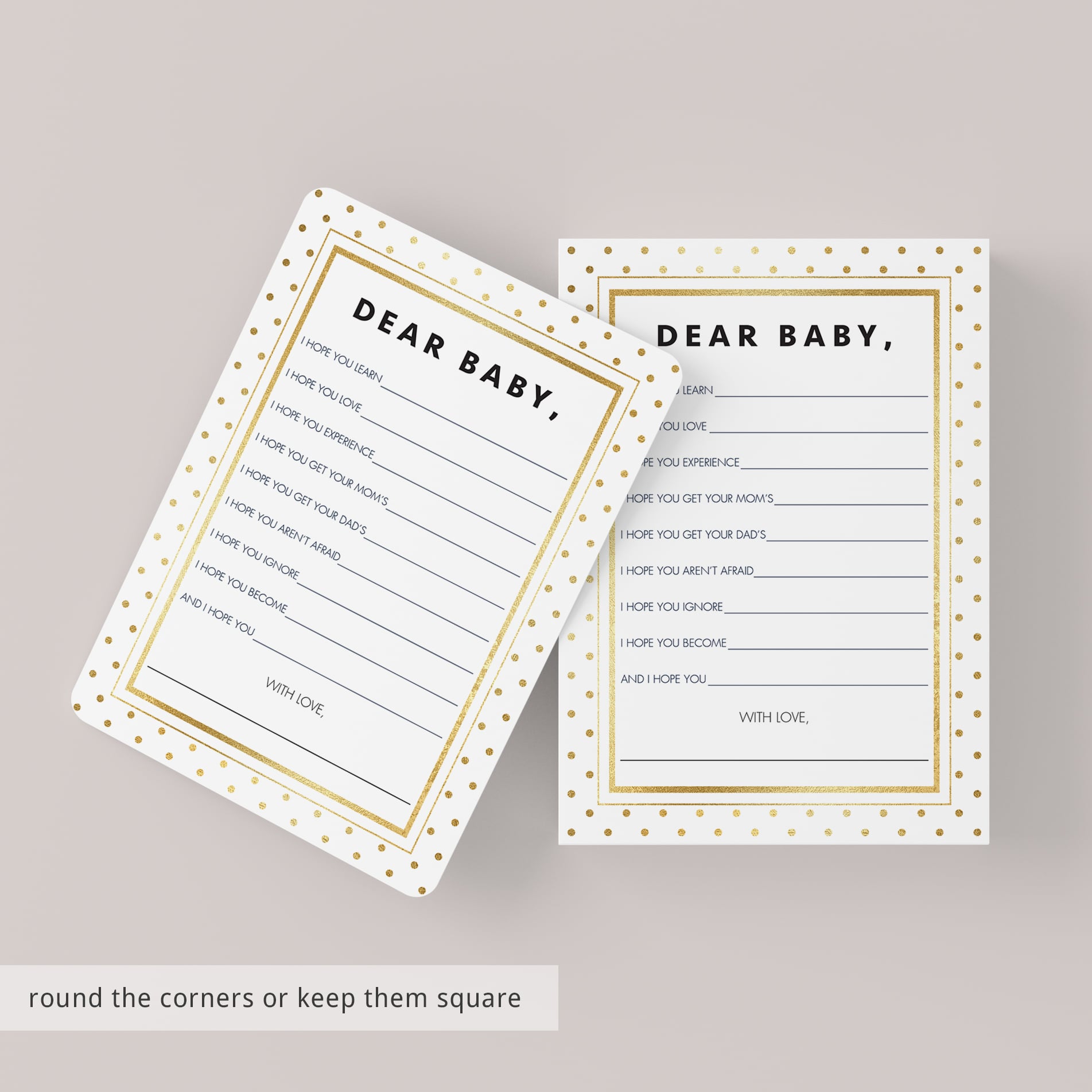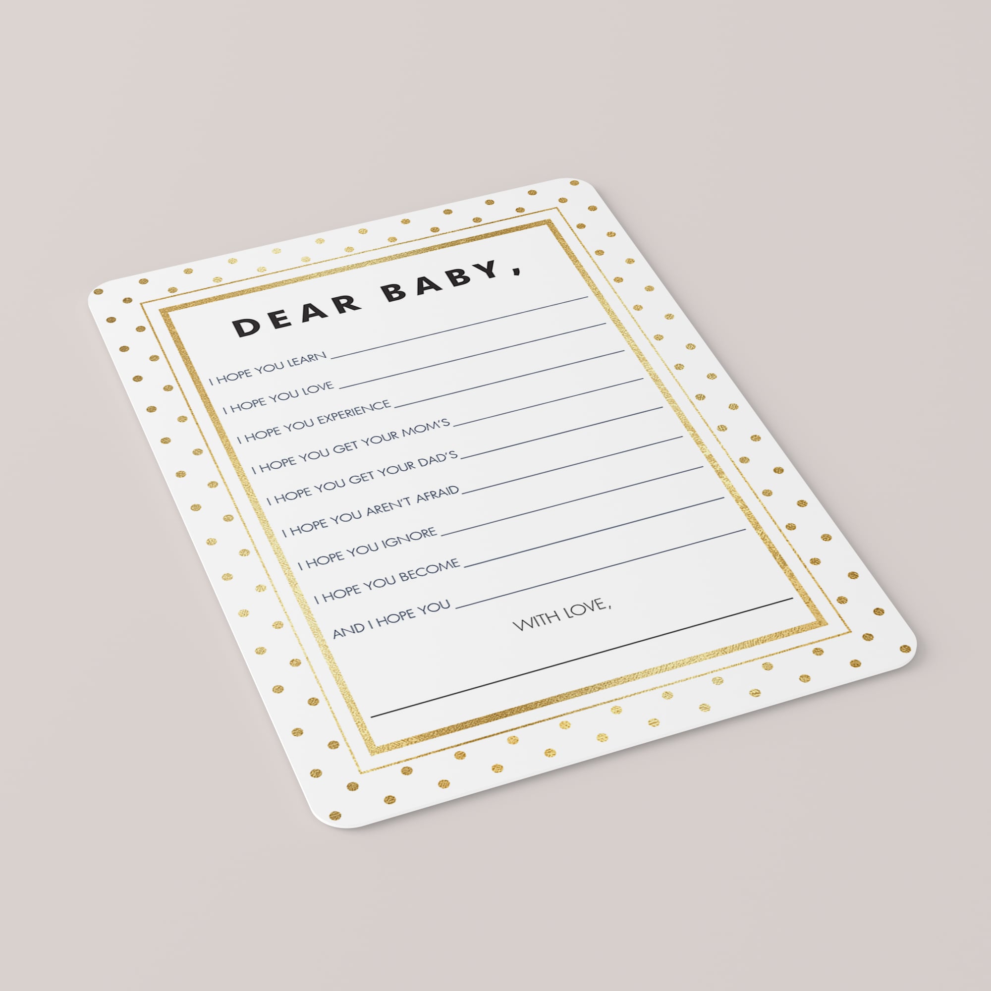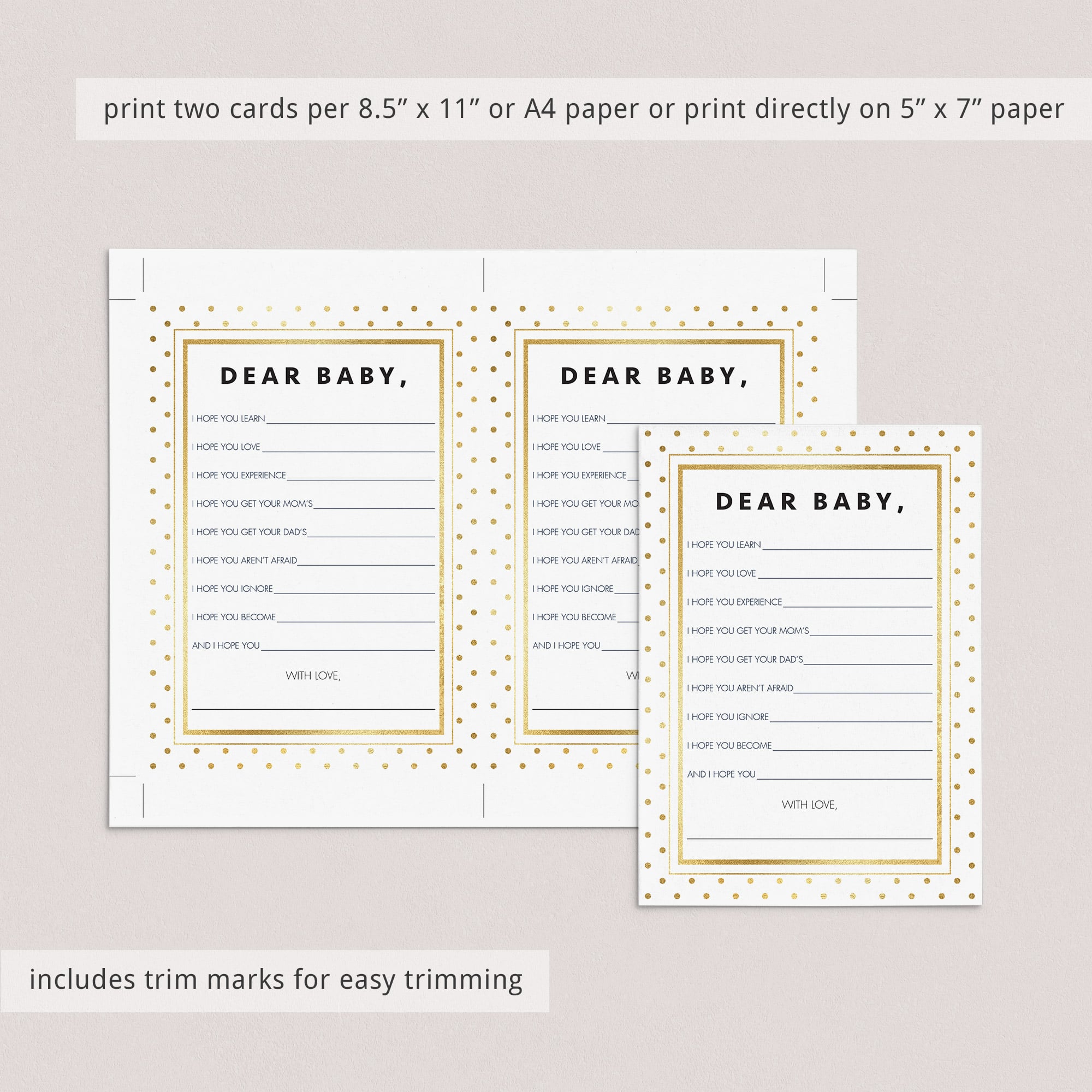 This gold baby wishes card is an instant download, so simply download and print the cards as many times as you need. We recommend printing on a nice heavy card stock for highest quality feel.