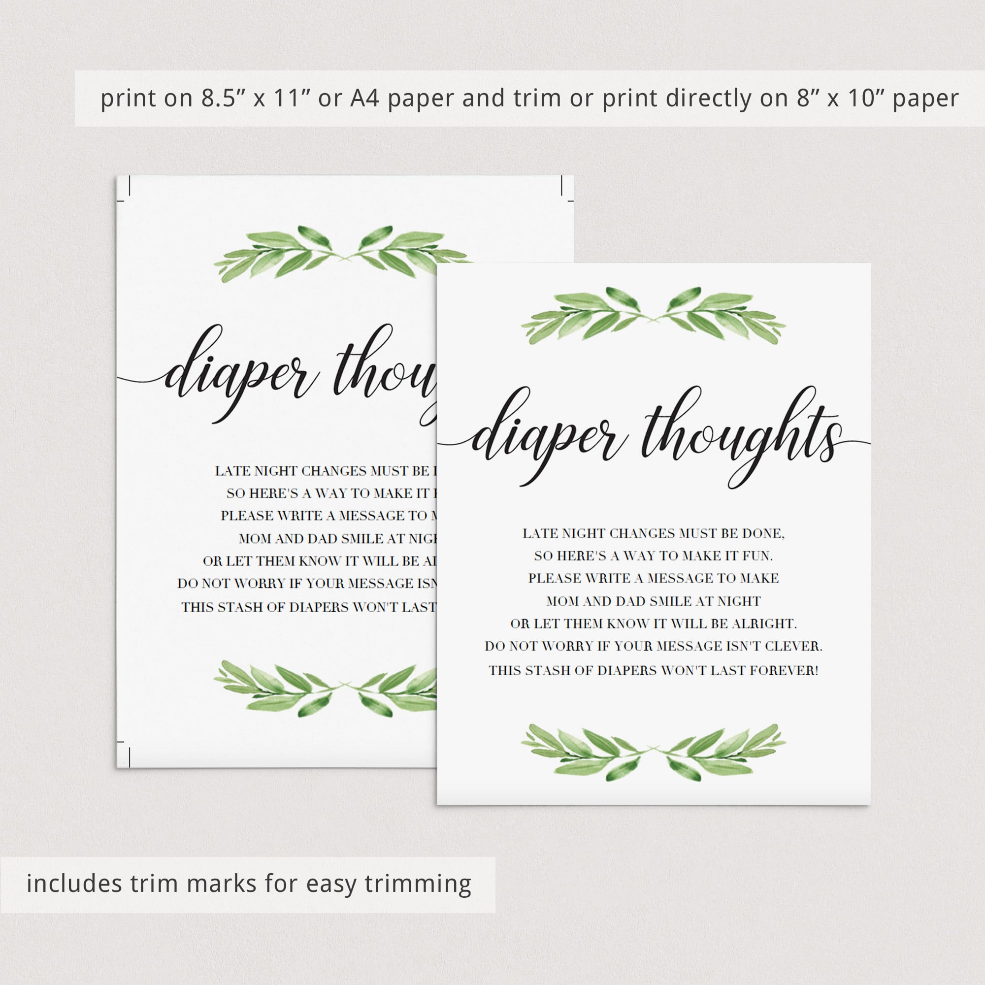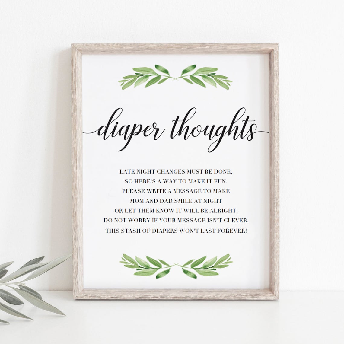 Display this greenery Diaper Thoughts sign along with a stack of diapers and Sharpie markers. Each guest will write a message on the diaper. They can draw something funny or write words of advice for the parents to read while they change baby's diaper. Mommy-to-be will definitely enjoy reading all of the messages when she is changing her new baby’s diapers.