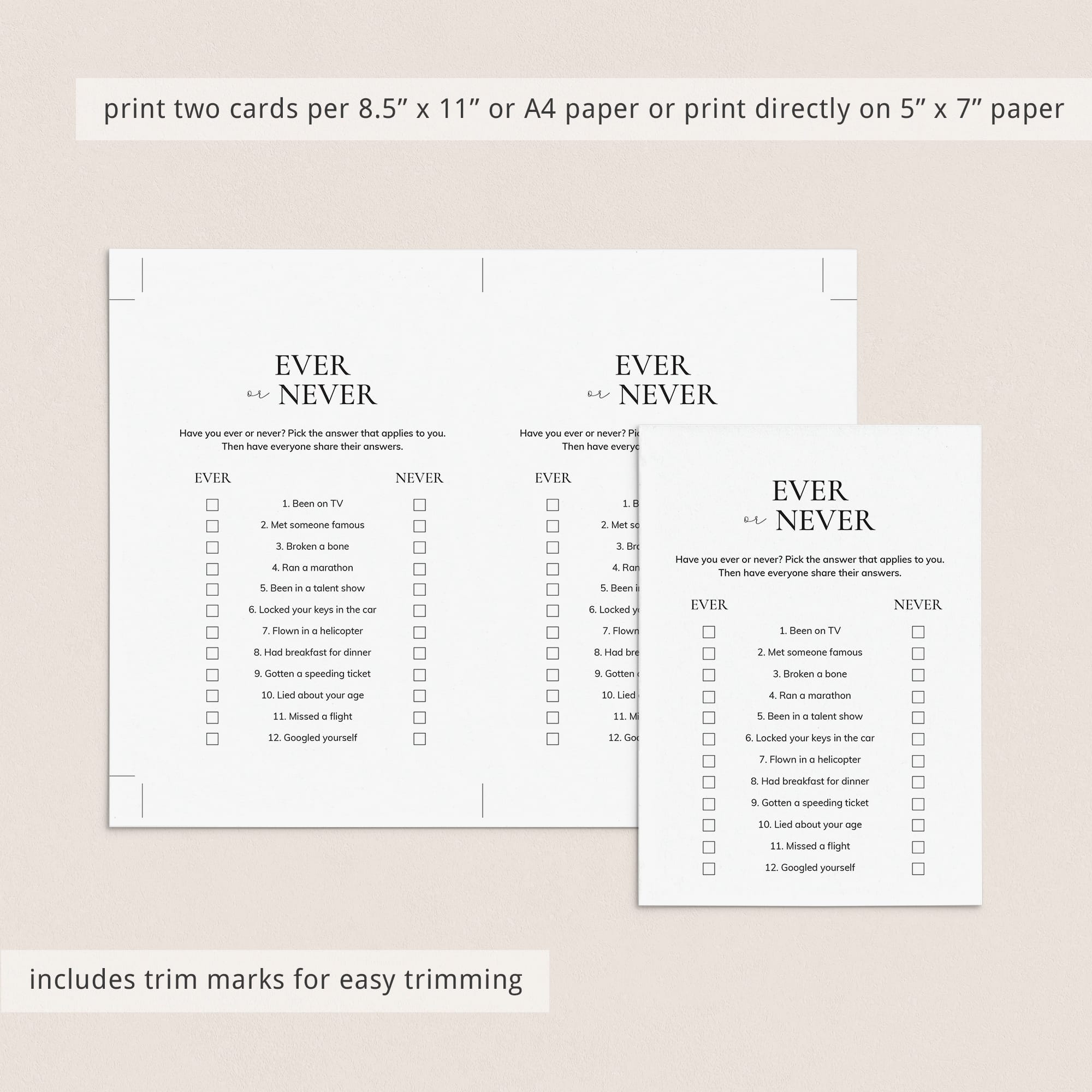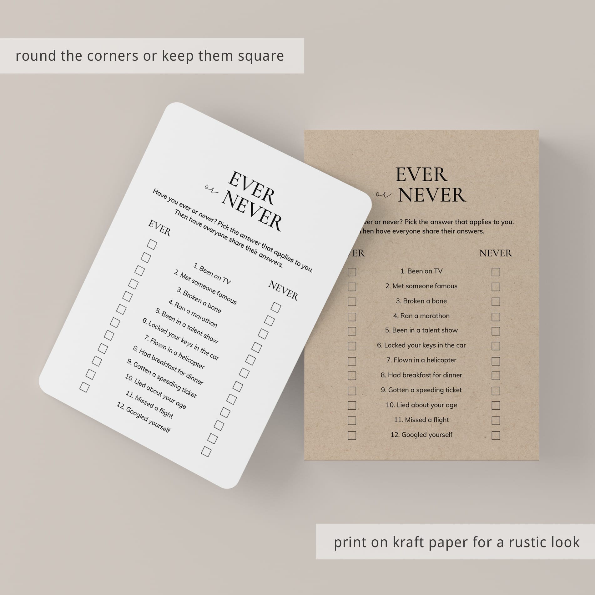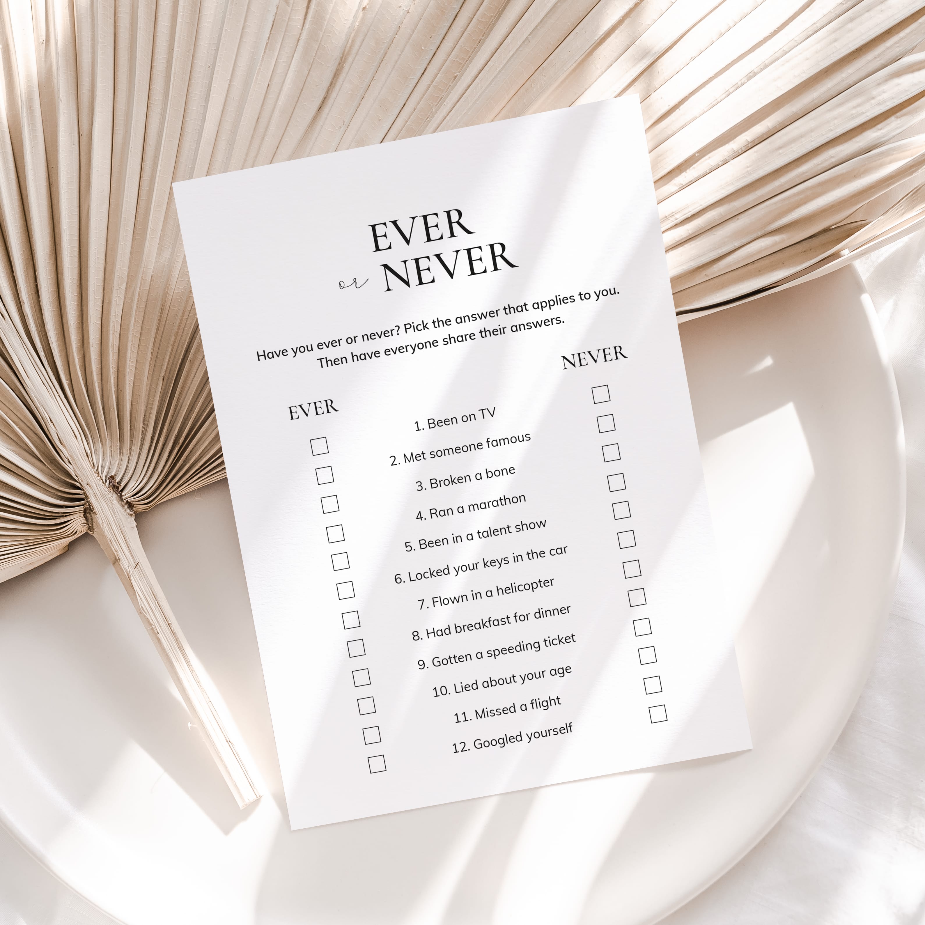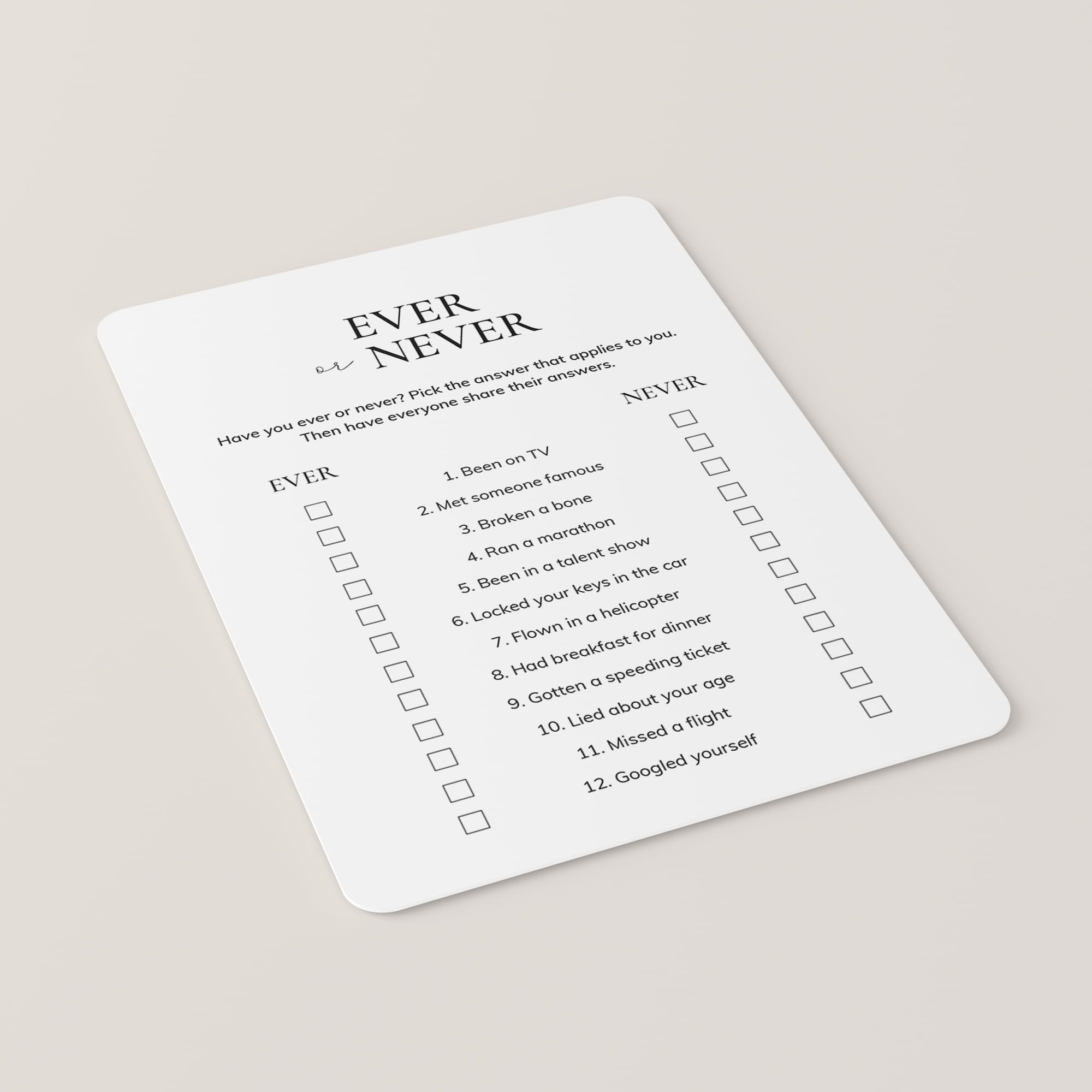 Have everyone fill out this minimalist Ever or Never icebreaker game and then share answers. It will be a great conversation starter for any occasion, from dinner parties to work meetings and family reunions.