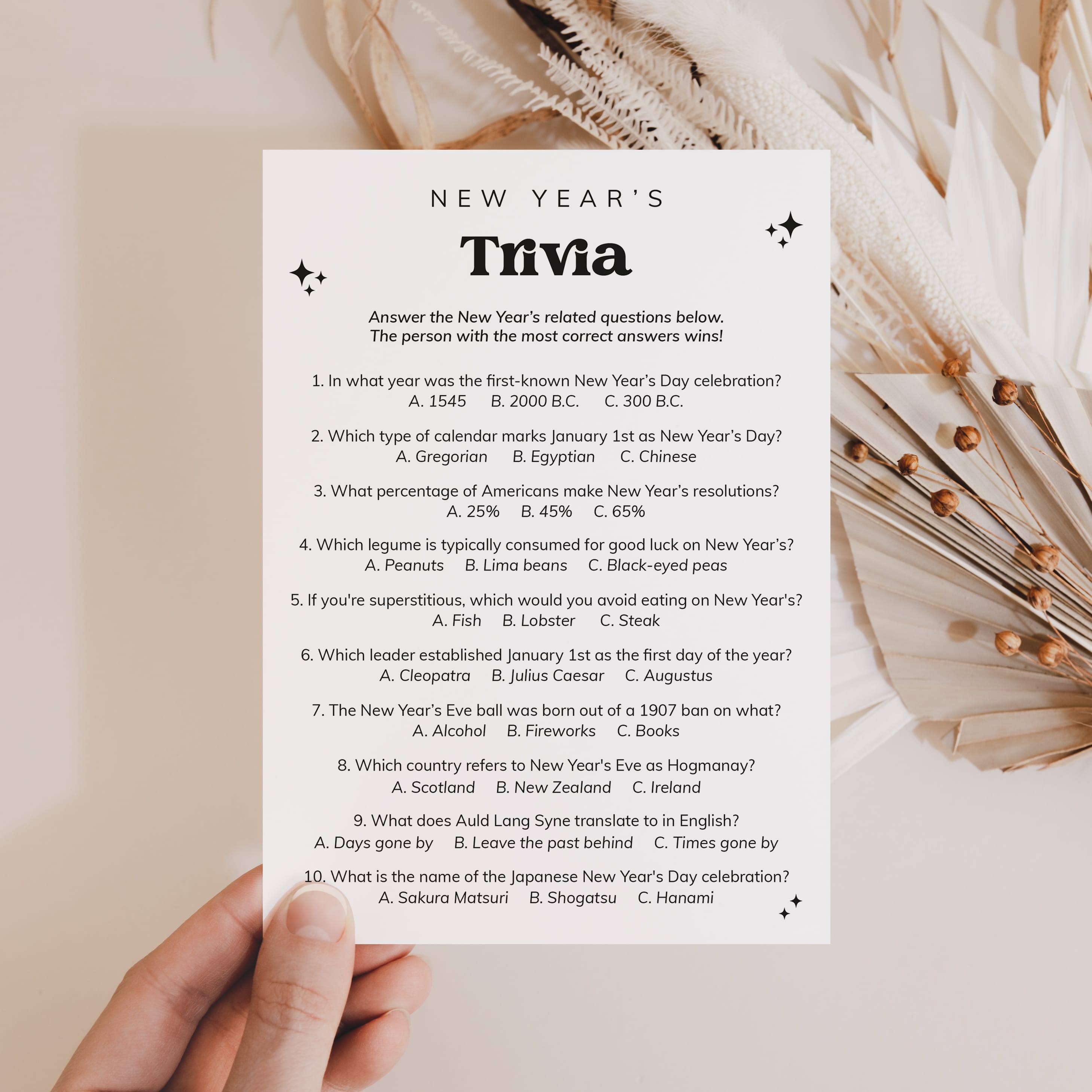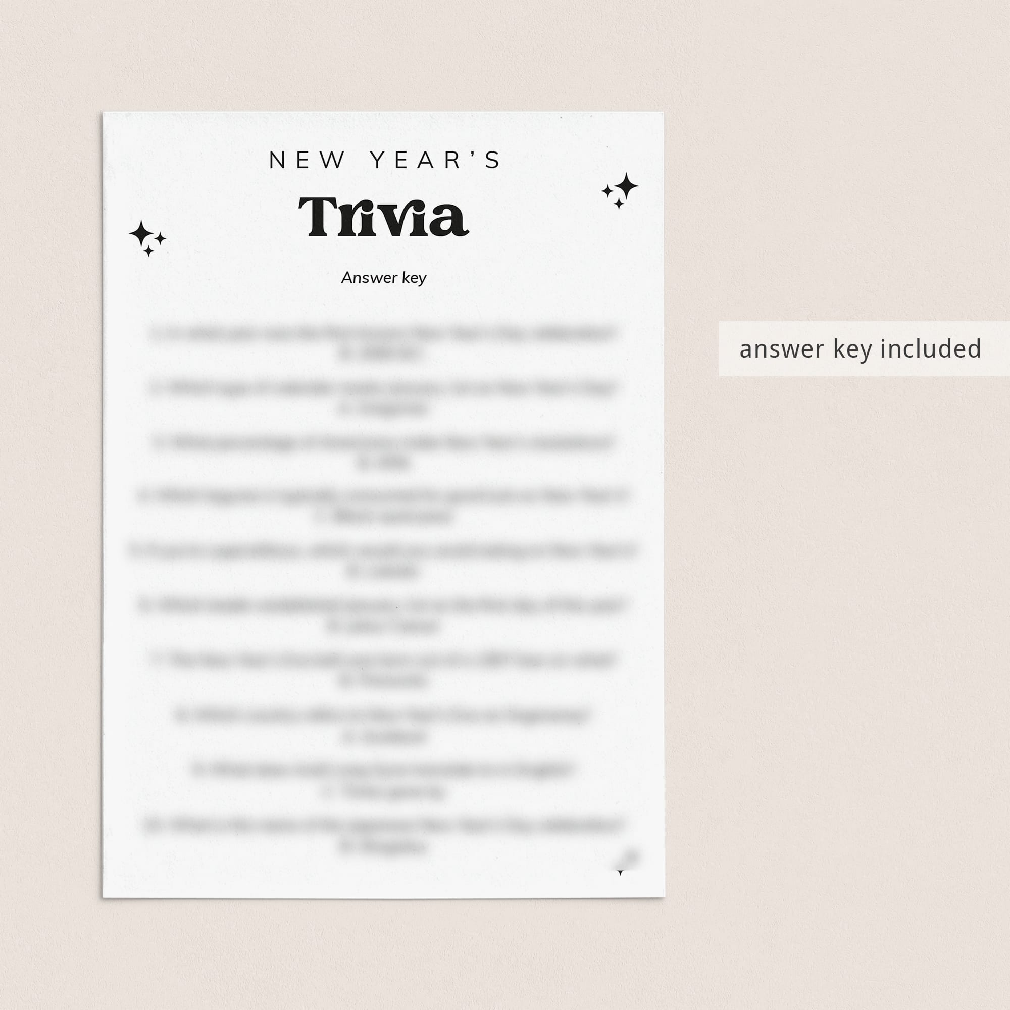 Are you throwing a New Year's Eve partyUse this black and white New Year Trivia game to test your guests New Year's knowledge. It’s a great challenging game to play at your New Years office party or holiday family night.