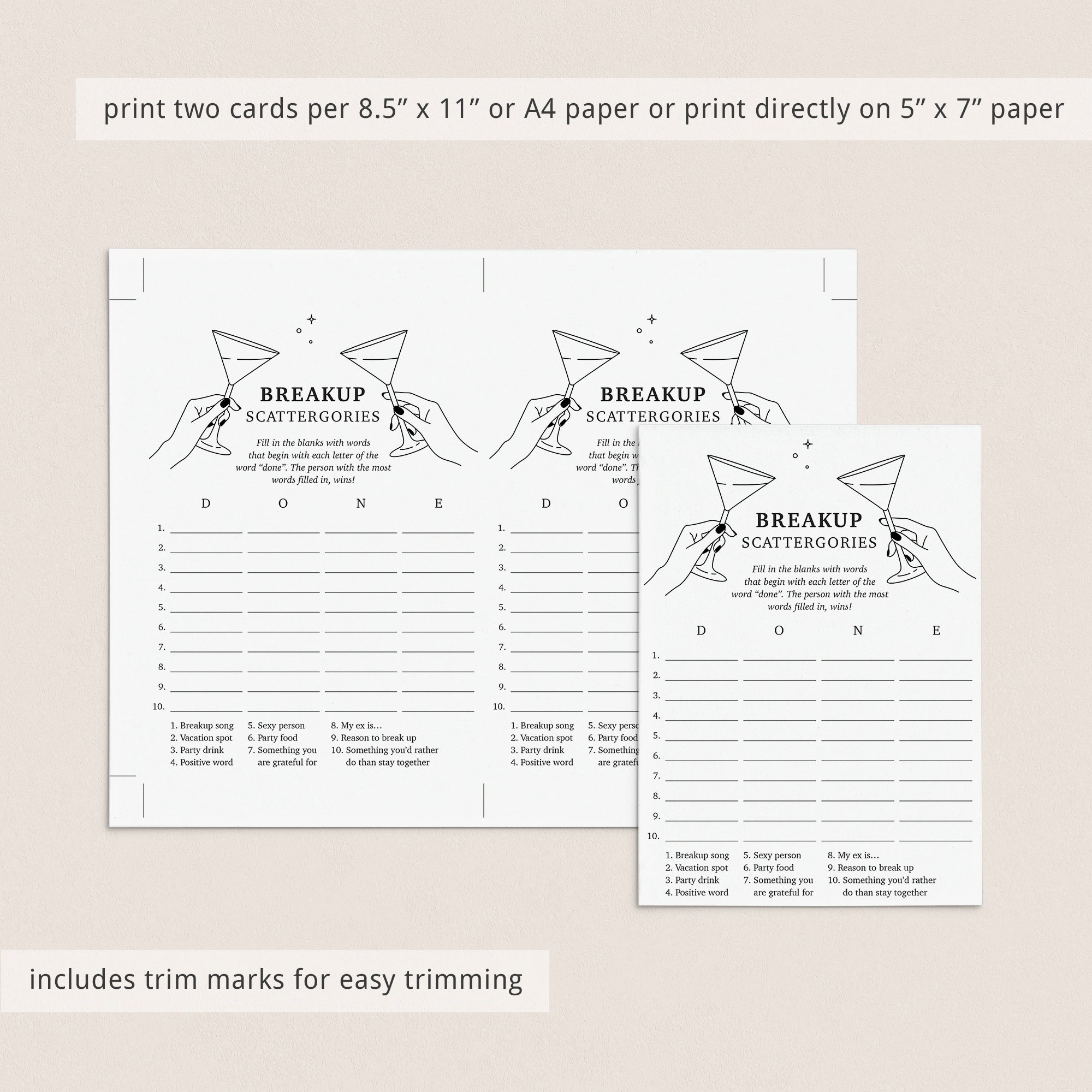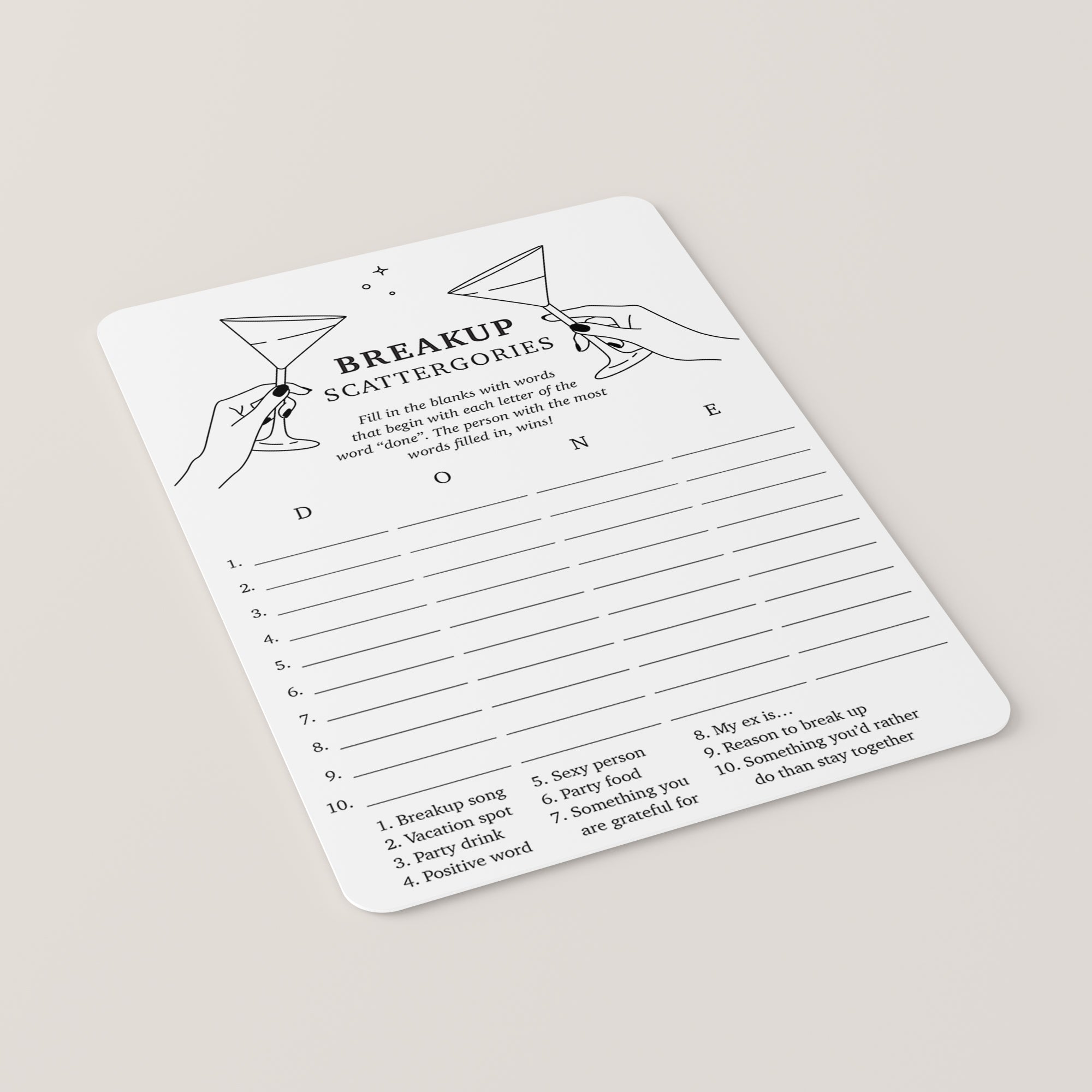 How many words can you fill in with the letters "D", "O", "N" and "E"? Play Scattergories at your divorce party with these printable game cards.