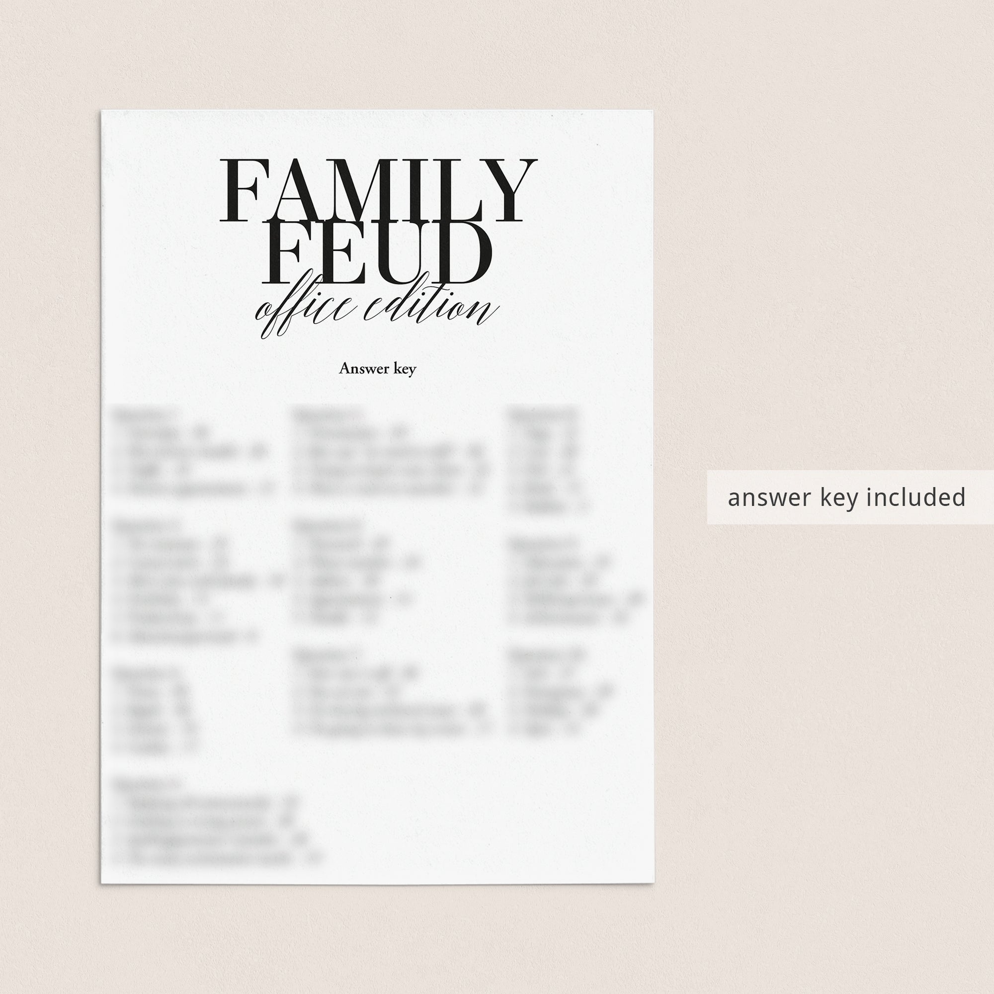 Add some fun to your Office Party with this modern minimalist Office Family Feud game. Family Feud is one of the best game shows ever. Have your coworkers compete to guess the most popular answer to Office themed Family Feud questions. An answer key with Office Feud Answers and Points is included. The person or team with the highest score wins!