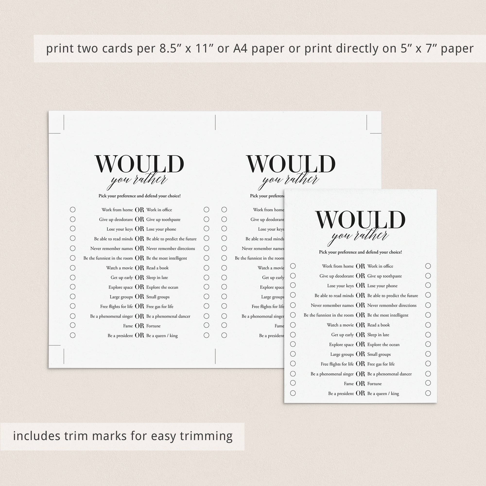 Print the games right from your computer in a matter of minutes or have the cards printed at your favorite print shop. The games have been designed in black and white. You can print on kraft paper to create a rustic look or print on colored card stock to match your party color palette. We recommend printing on a nice heavy card stock for highest quality feel.