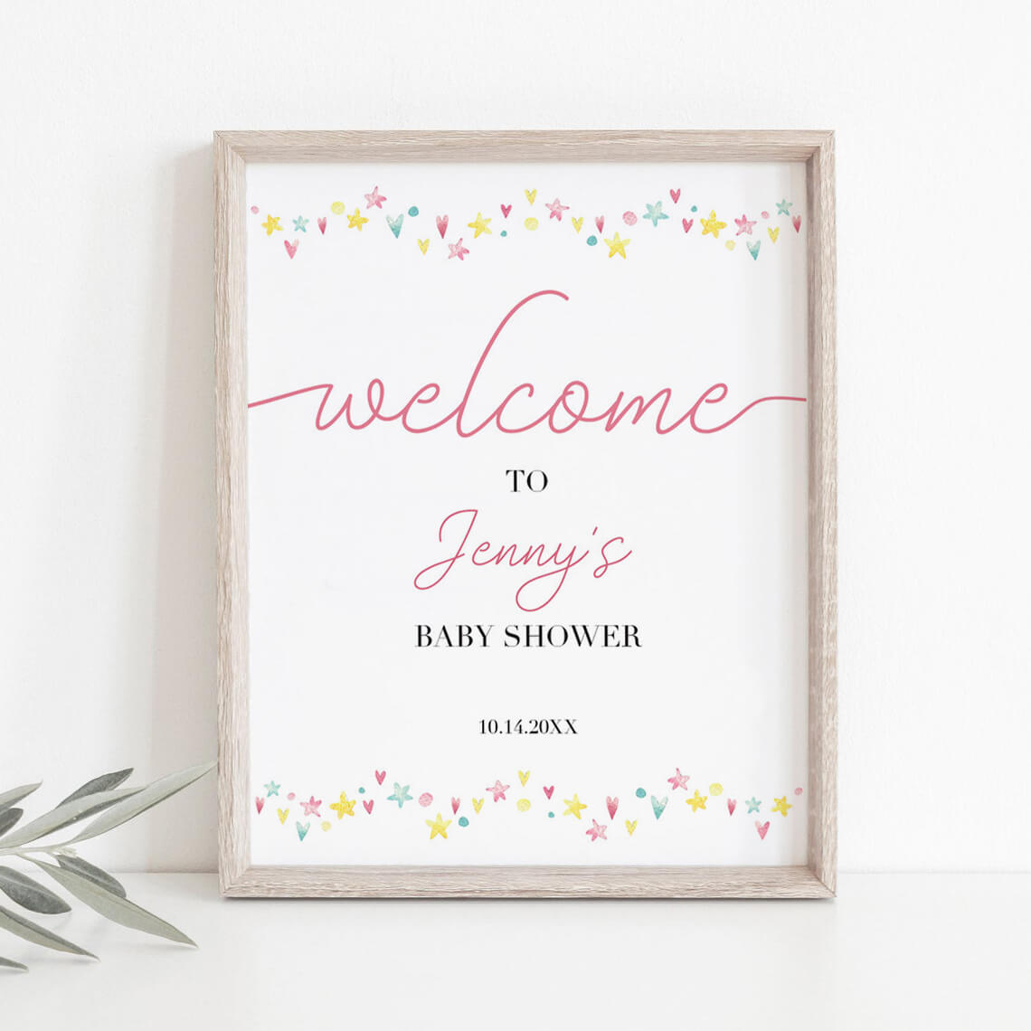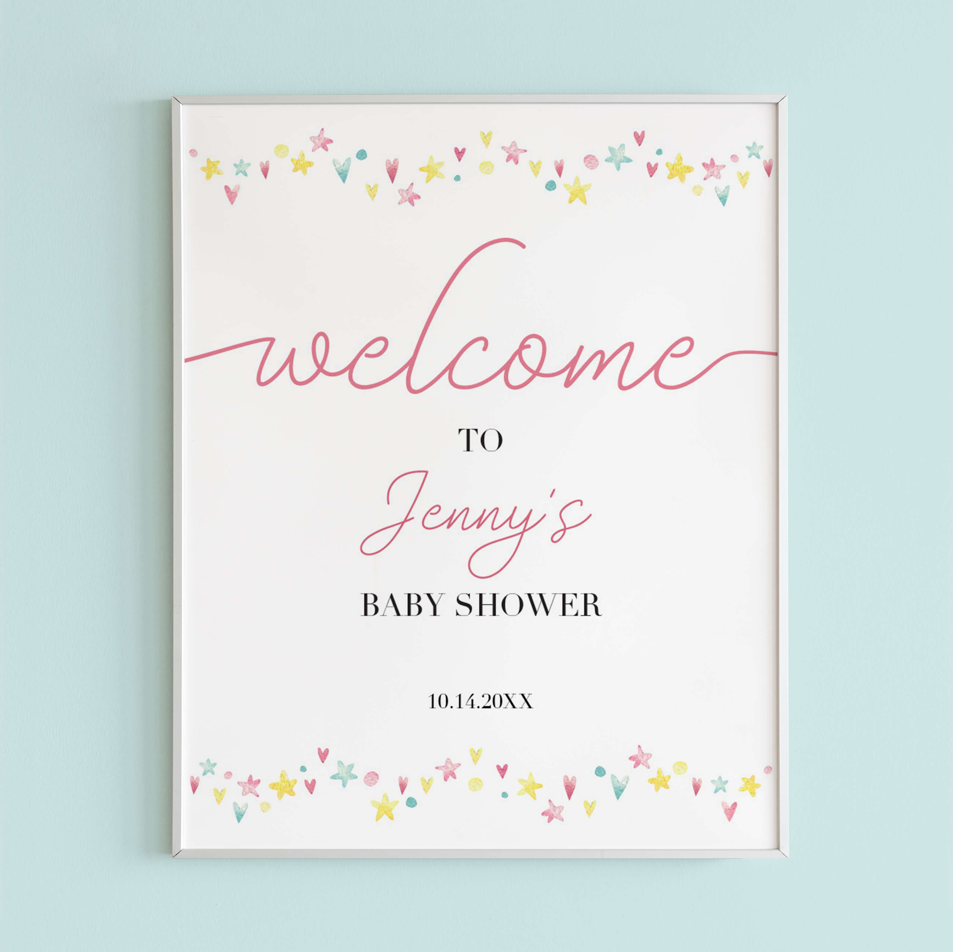 They say that first impressions are important. Set the tone for your girl baby shower and decorate your party with this adorable baby shower welcome sign with hearts and stars.