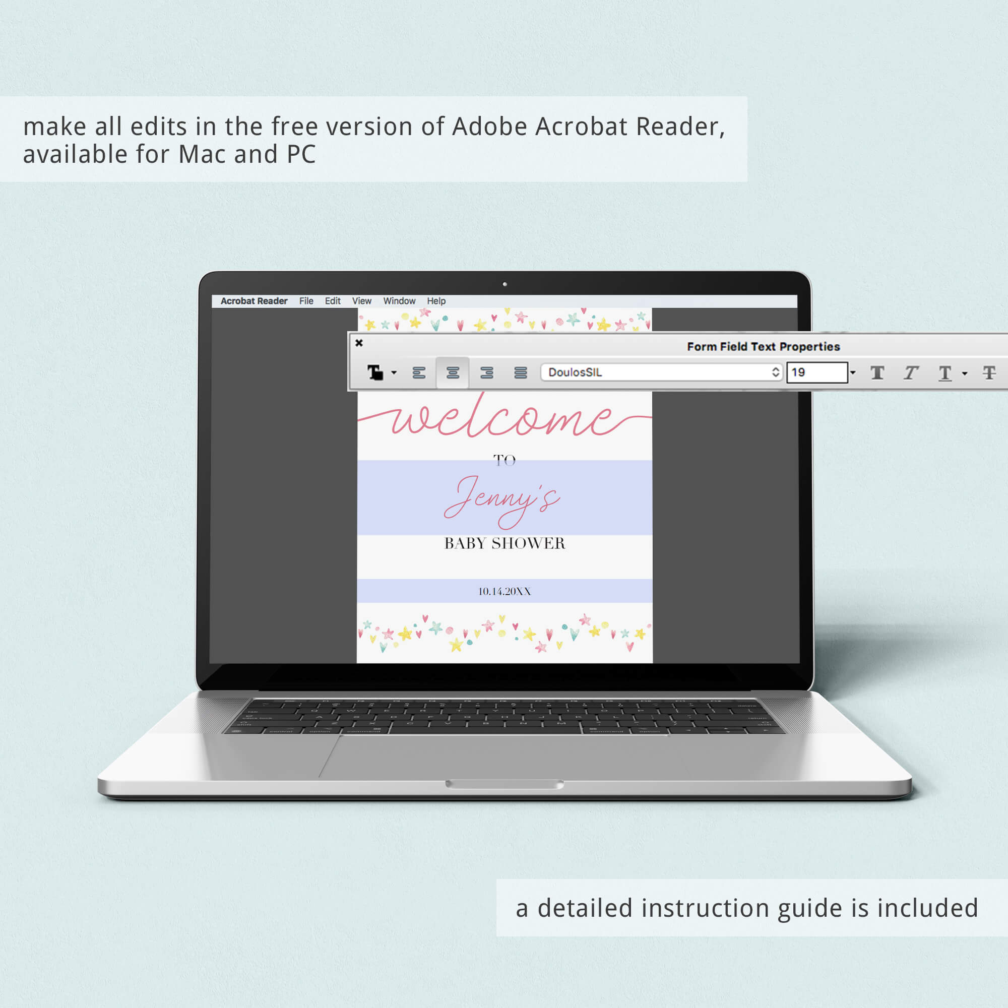 Easily personalize the welcome sign with the name of the mom-to-be and the date of the baby shower. A detailed instruction guide with tips & tricks on editing, trimming, paper choices and more is included.