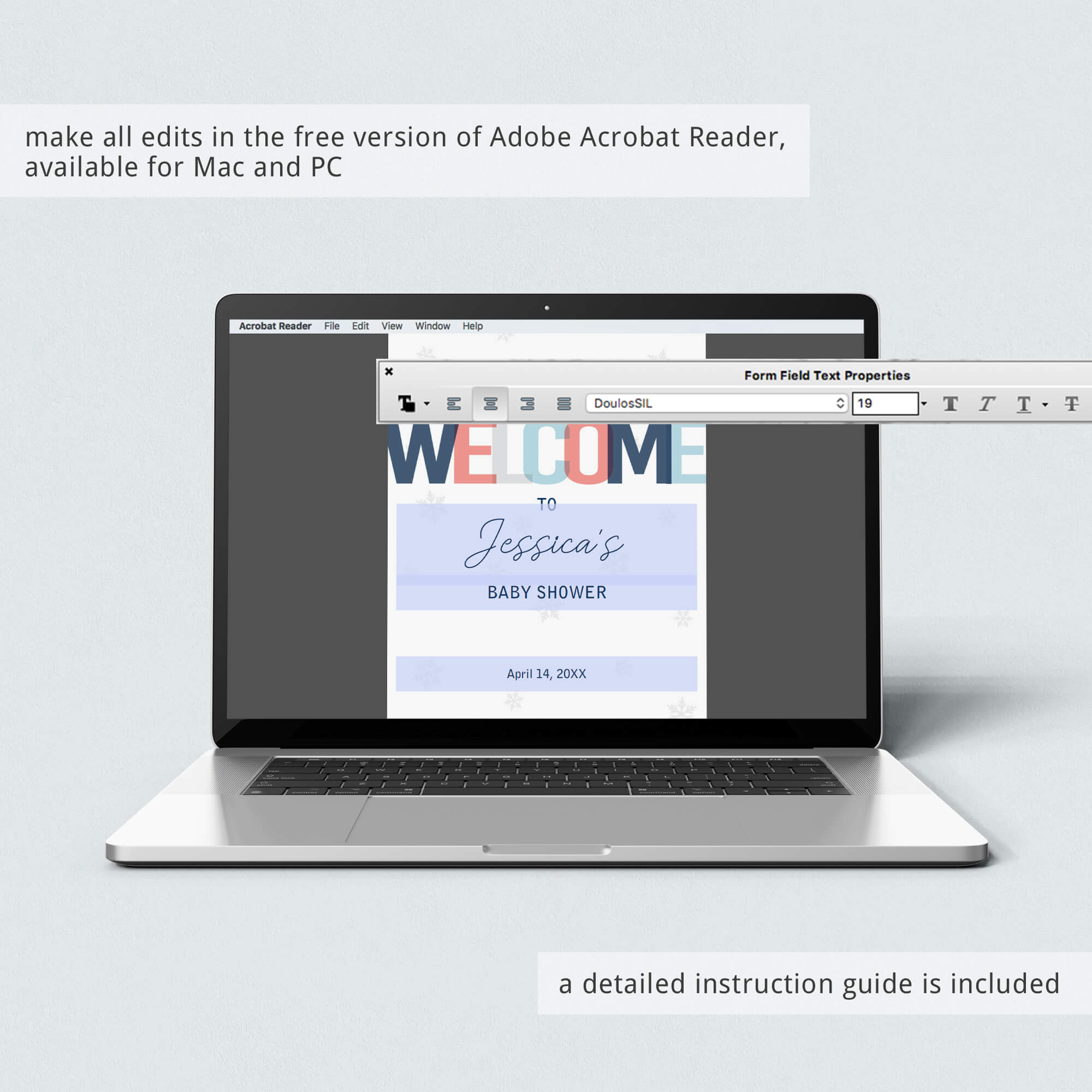 Easily personalize the welcome sign with the guest of honor's name and the date of the shower. A detailed instruction guide with tips & tricks on editing, trimming, paper choices and more is included.