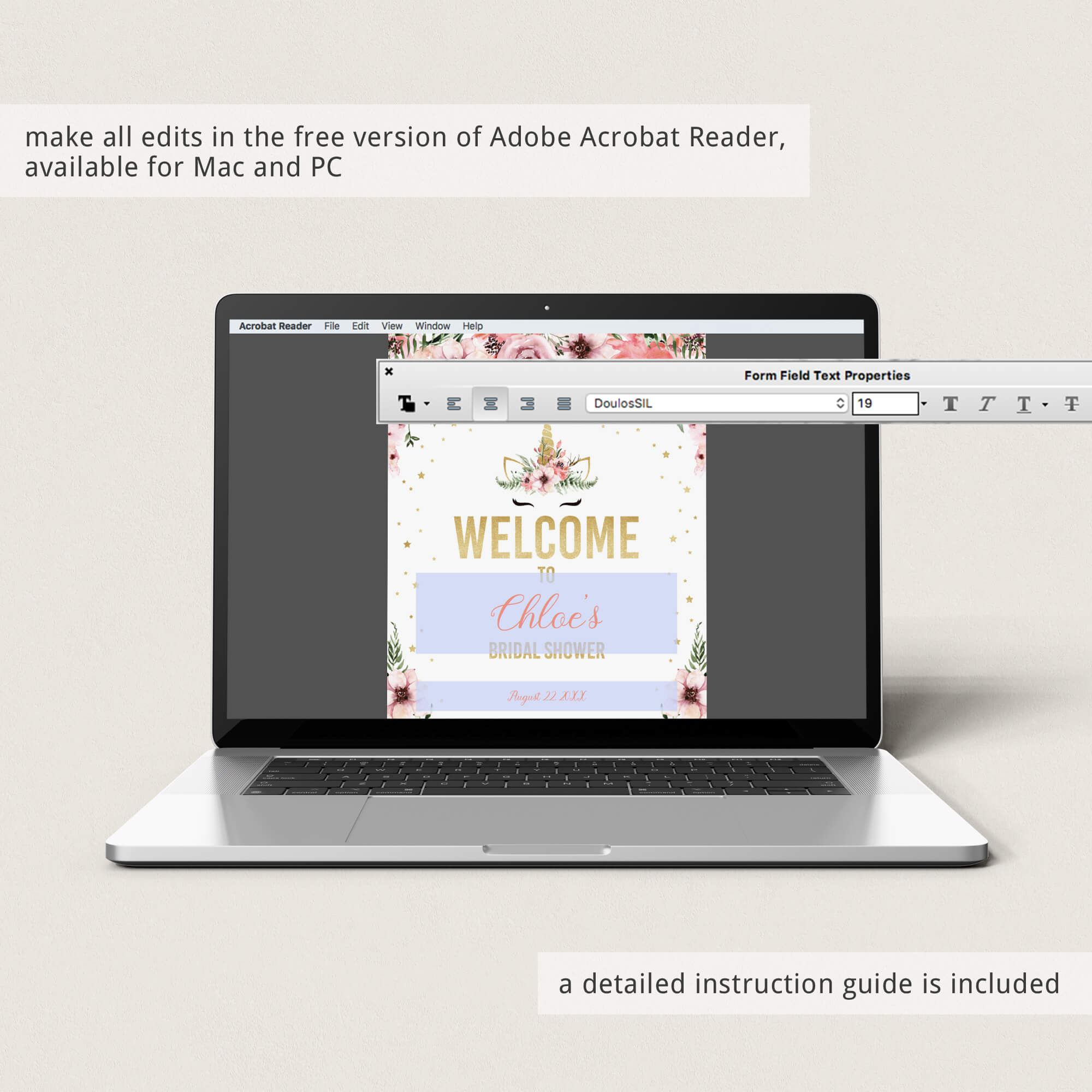The Welcome sign is editable in the free version of Adobe Acrobat Reader, so that you can personalize it with the name of the bride-to-be and the date of the bridal shower. To make the process as smooth as possible, we've included a detailed instruction guide.