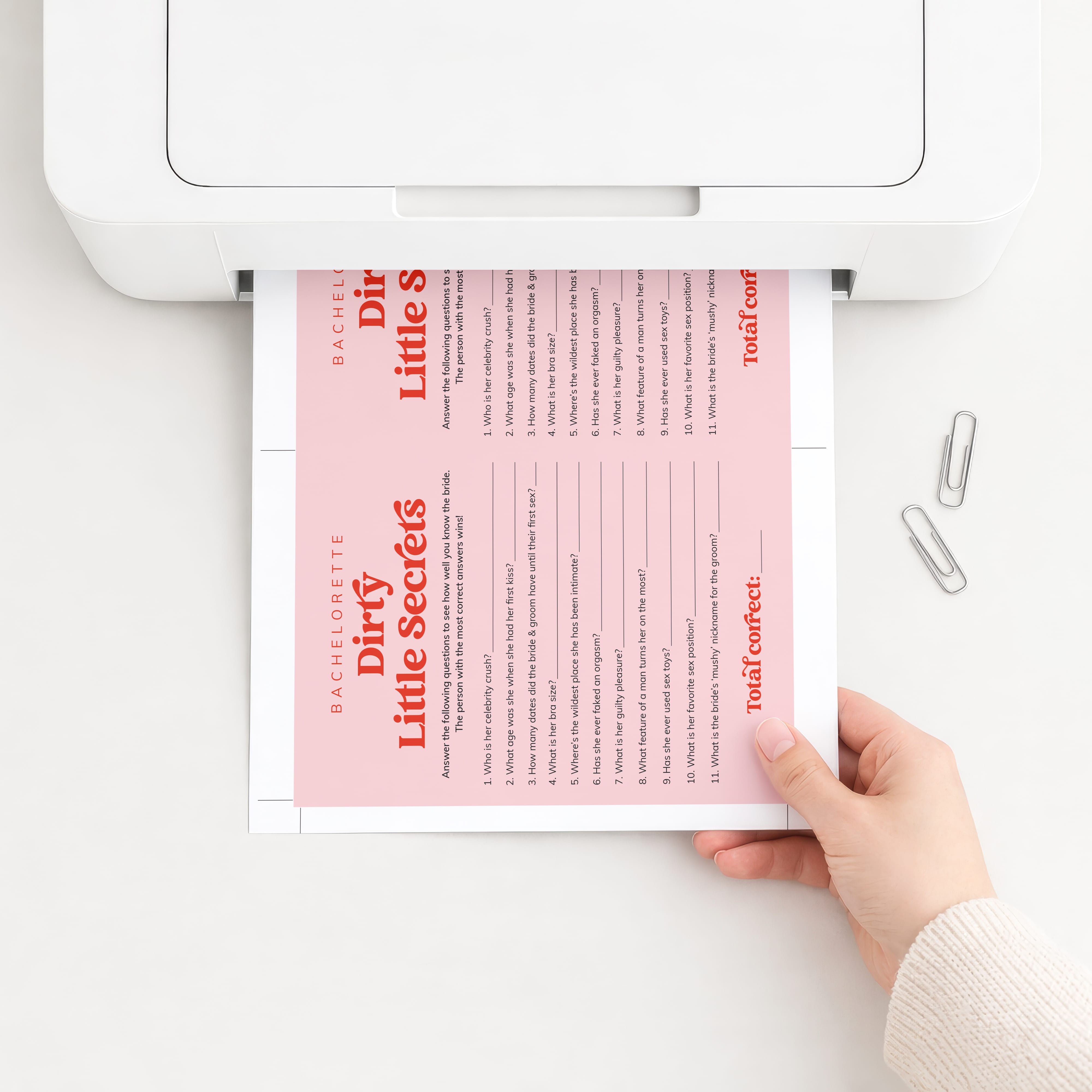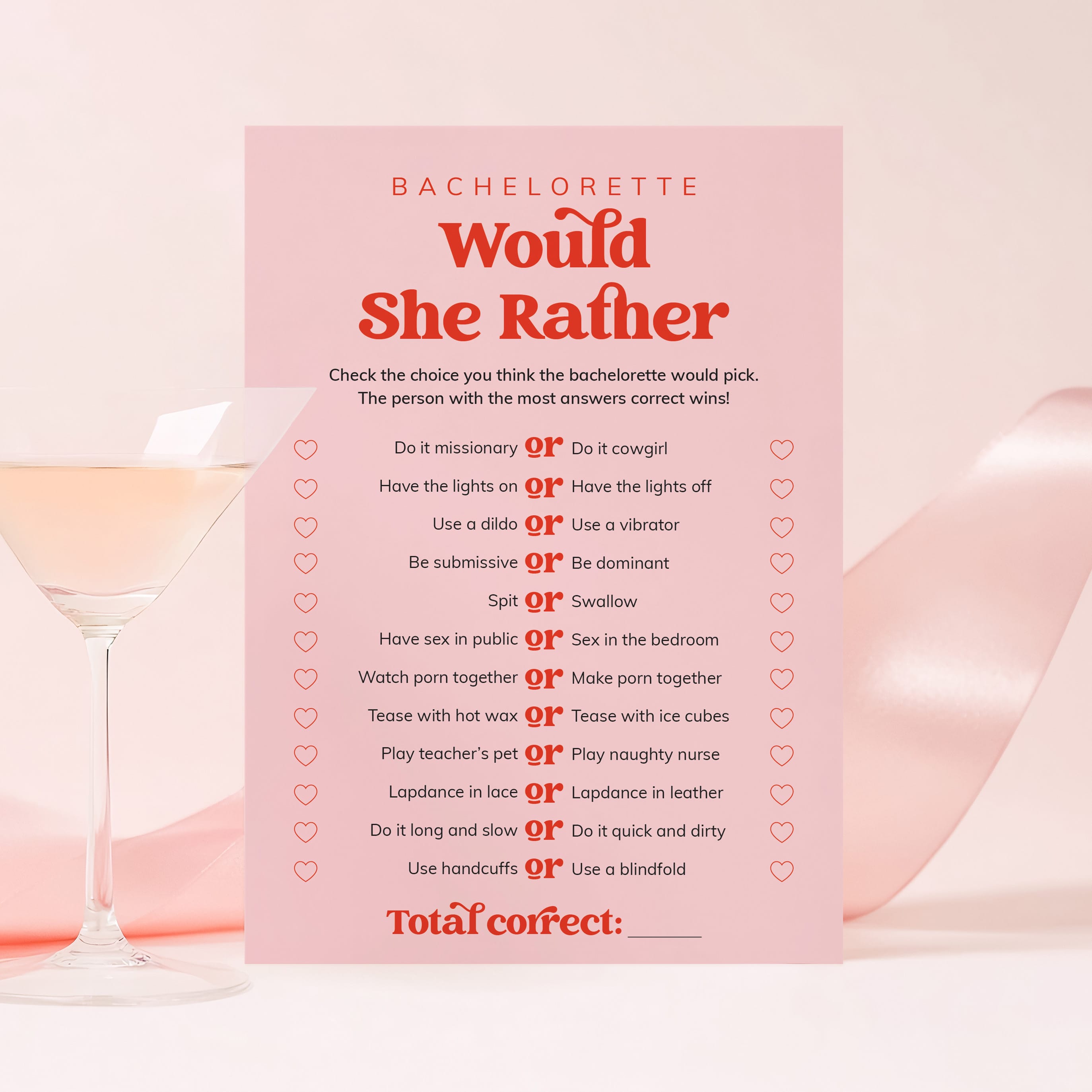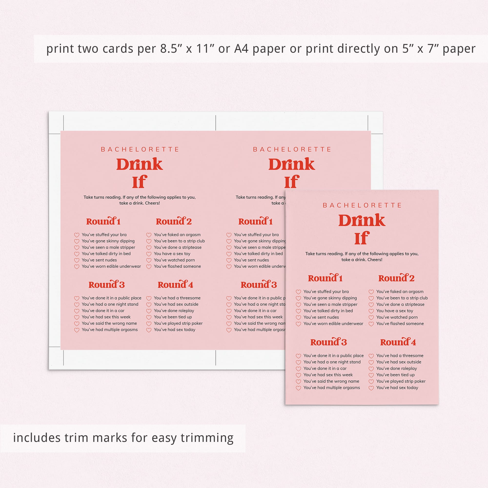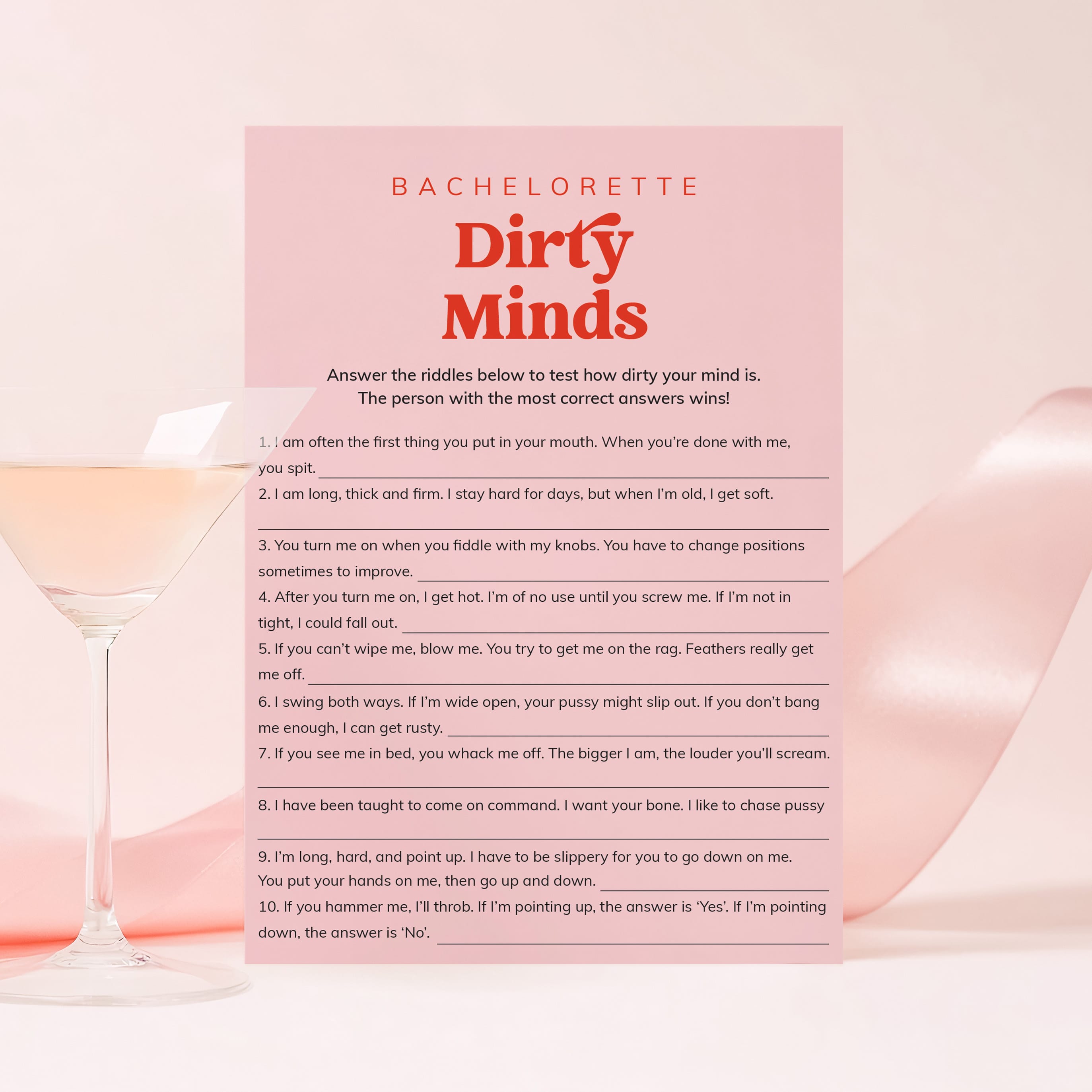 This vibrant bundle includes 12 popular and naughty games that are designed to get everyone talking, laughing and bonding. The bold red font adds a fun retro flair, making the games not only exciting to play but also beautiful to display at your bachelorette weekend or hens party.