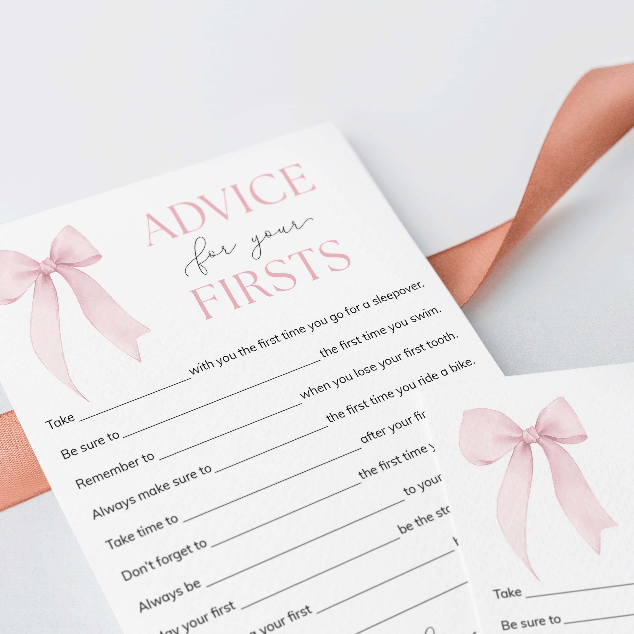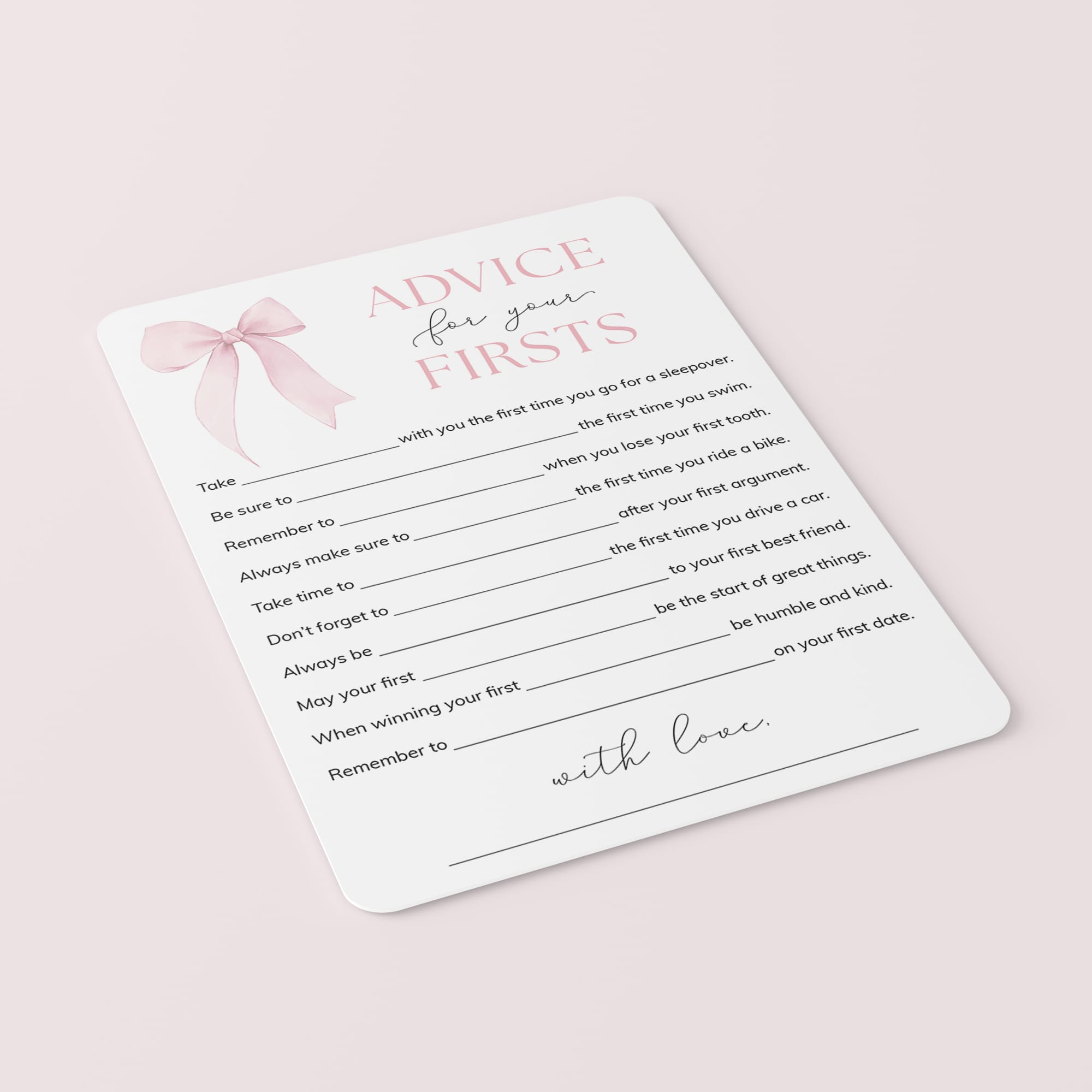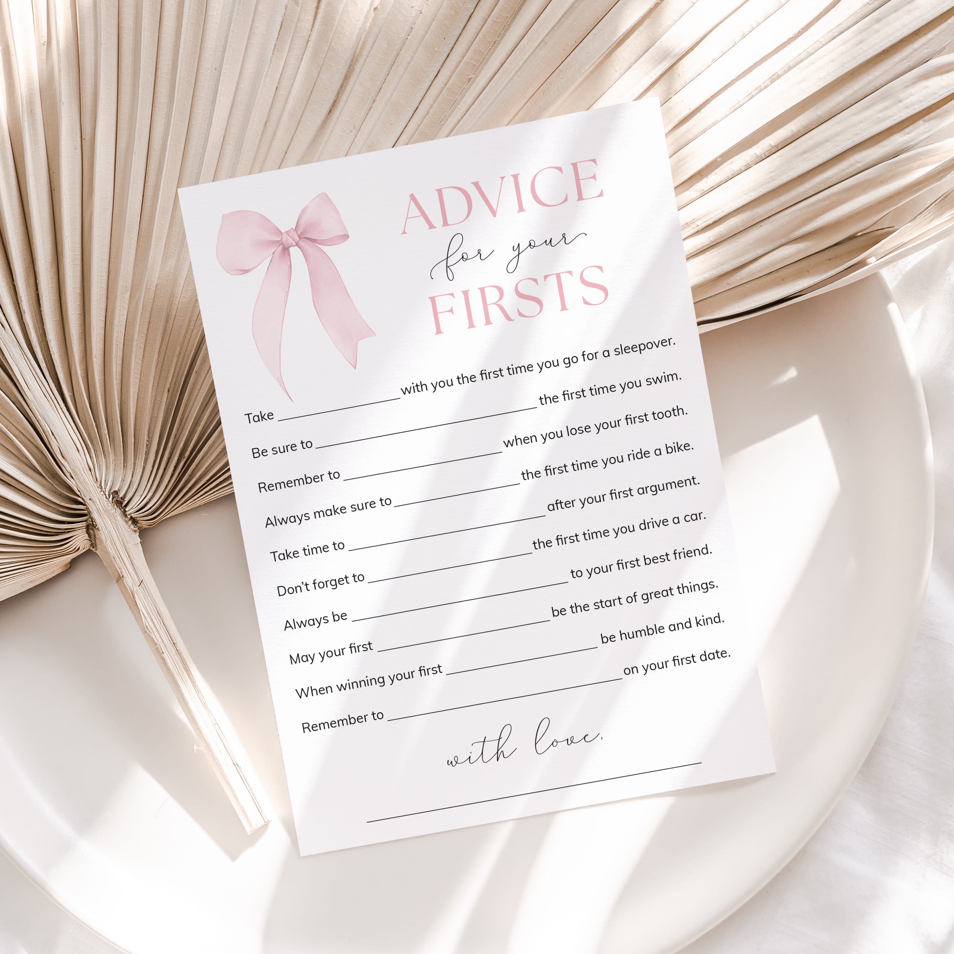 Are you looking for a meaningful keepsake for your baby girls' first birthday party? Let every guest write down their advice for your baby's firsts. This first birthday advice card with watercolor pink bow is the perfect addition to your girl's first birthday party.